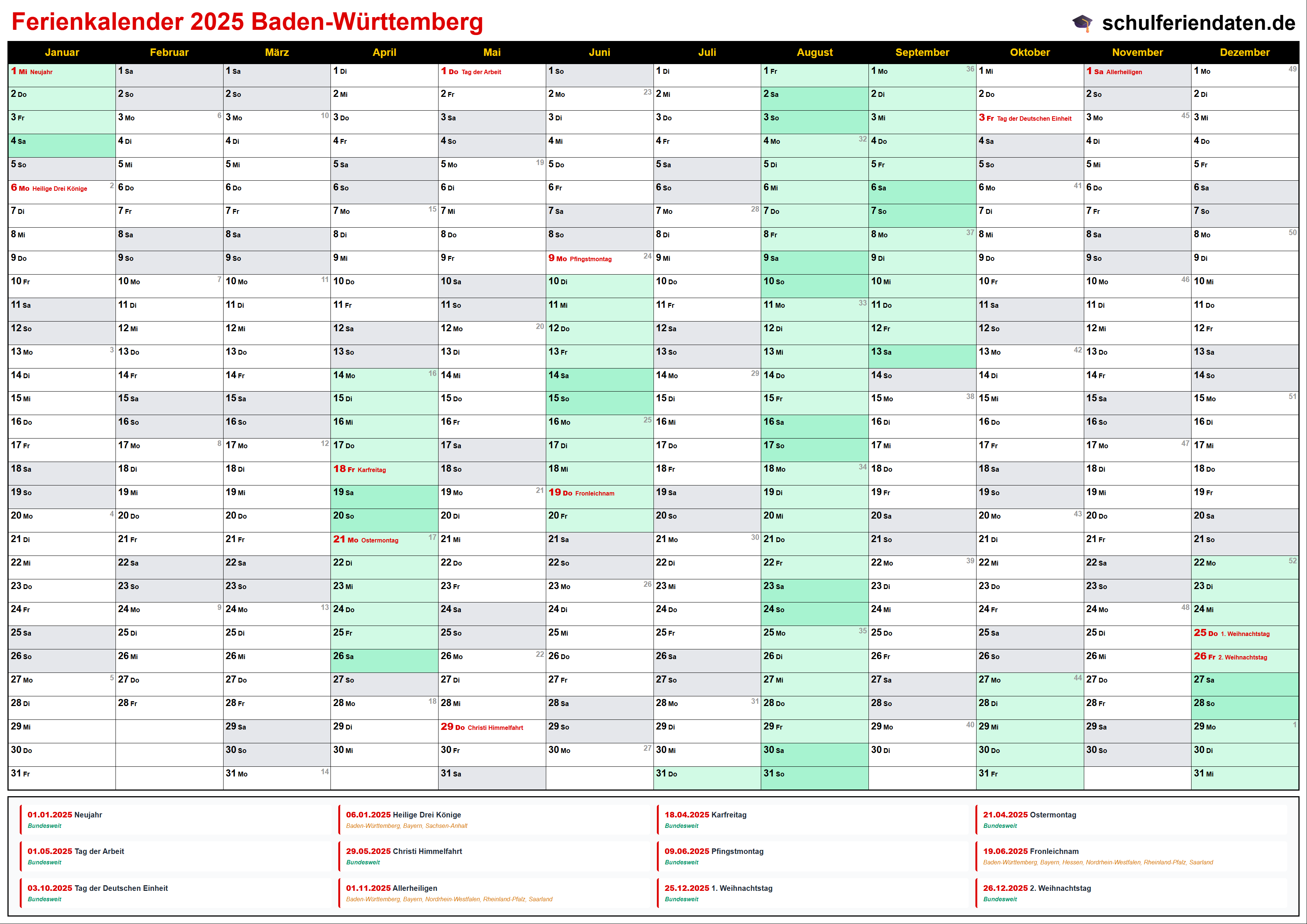 Hier finden Sie alle Schulferien 2025 in Baden-Württemberg – übersichtlich im Kalender mit Kalenderwochen (KW) und markierten Feiertagen.