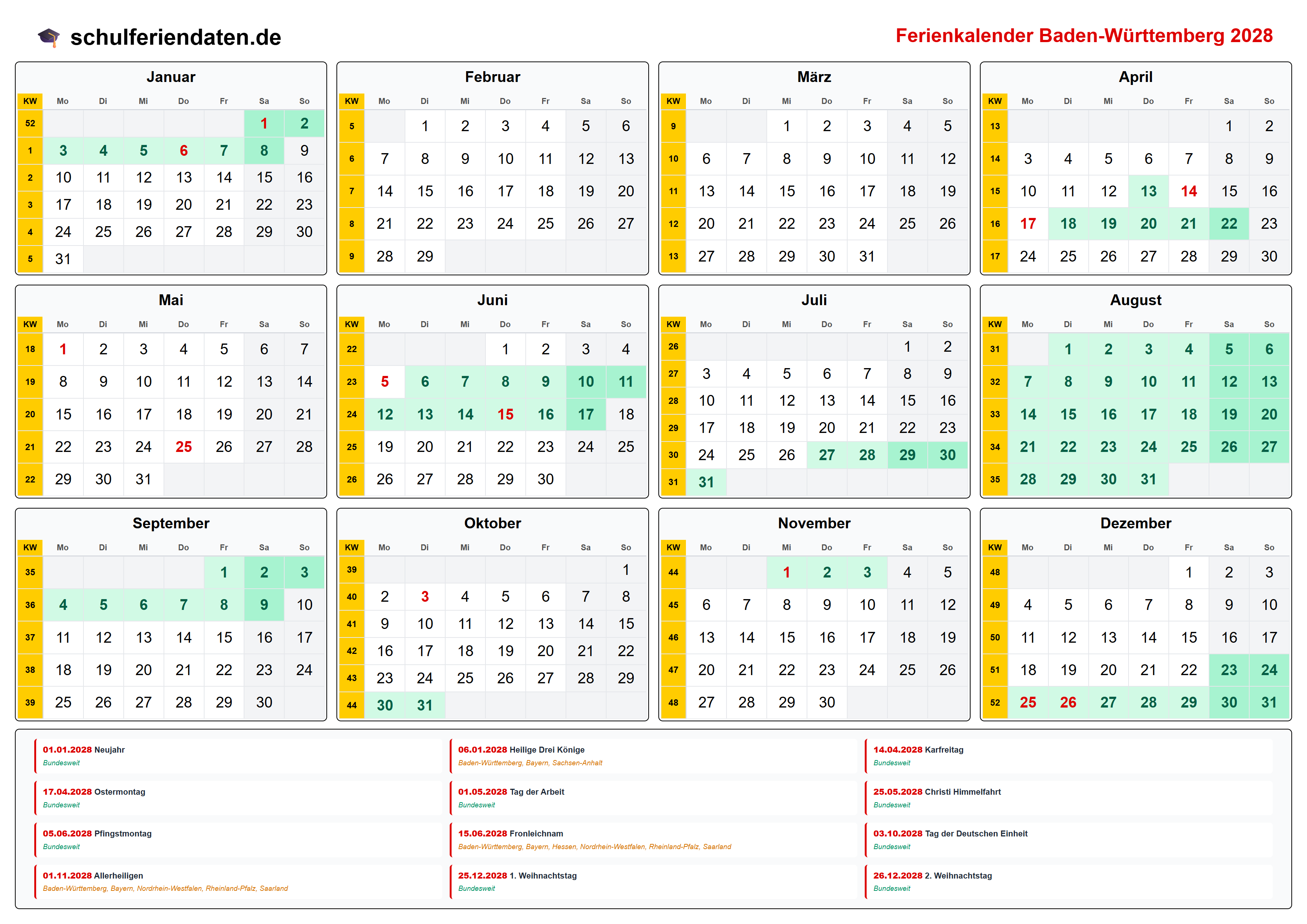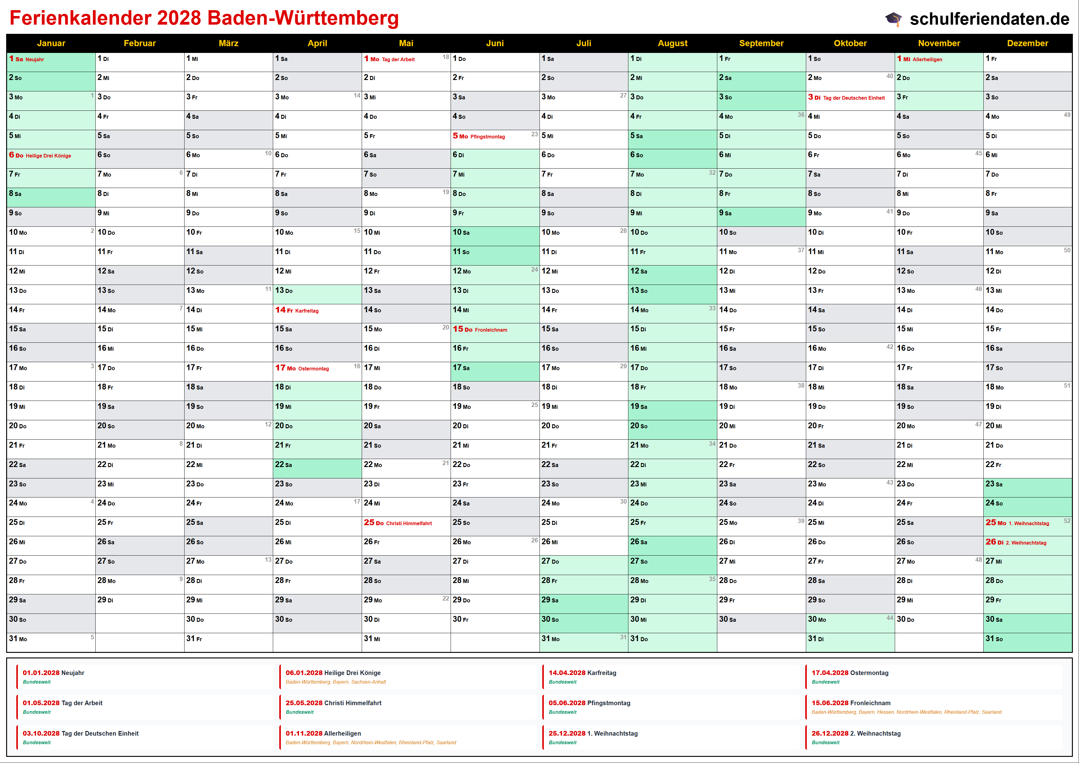Ferienkalender für Baden-Württemberg im Jahr 2028 mit allen Schulferien und gesetzlichen Feiertagen. Der Kalender zeigt alle Termine übersichtlich nach Monaten und Kalenderwochen und steht als PDF, PNG und iCal (.ics) zum Download bereit.