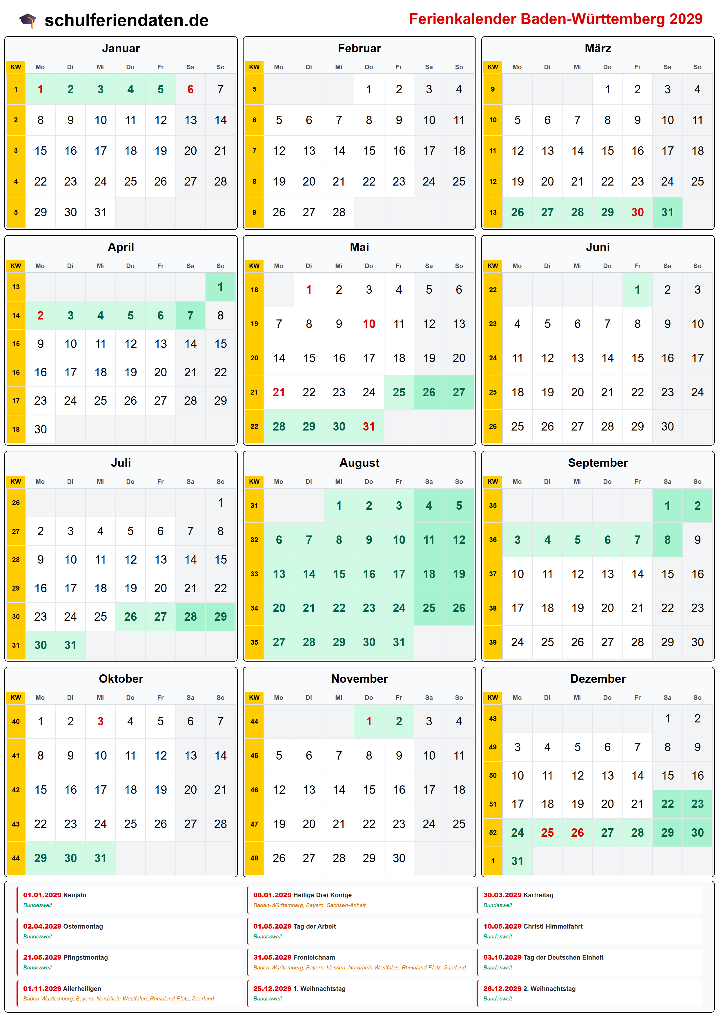 Laden Sie unseren Kalender 2029 mit den Feiertagen für Baden-Württemberg in den Formaten PDF oder PNG. Sie können die Kalender auch auf Ihrer Webseite einbinden oder in Ihrer Publikation abdrucken. In dem Fall muss schulferiendaten.de als Quelle angegeben bzw. verlinkt sein.