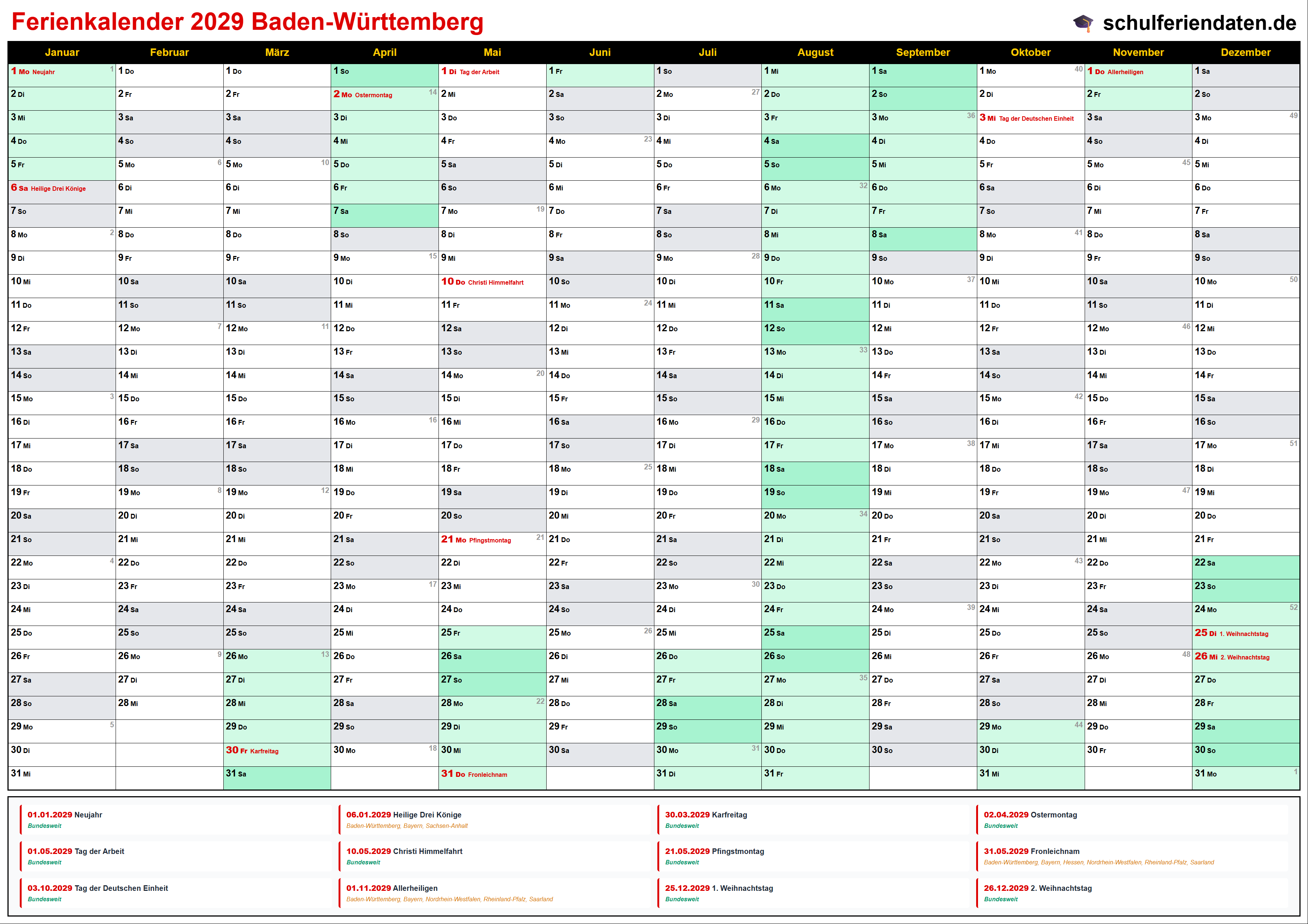 Ferienkalender für Baden-Württemberg im Jahr 2029 mit allen Schulferien und gesetzlichen Feiertagen. Der Kalender zeigt alle Termine übersichtlich nach Monaten und Kalenderwochen und steht als PDF, PNG und iCal (.ics) zum Download bereit.