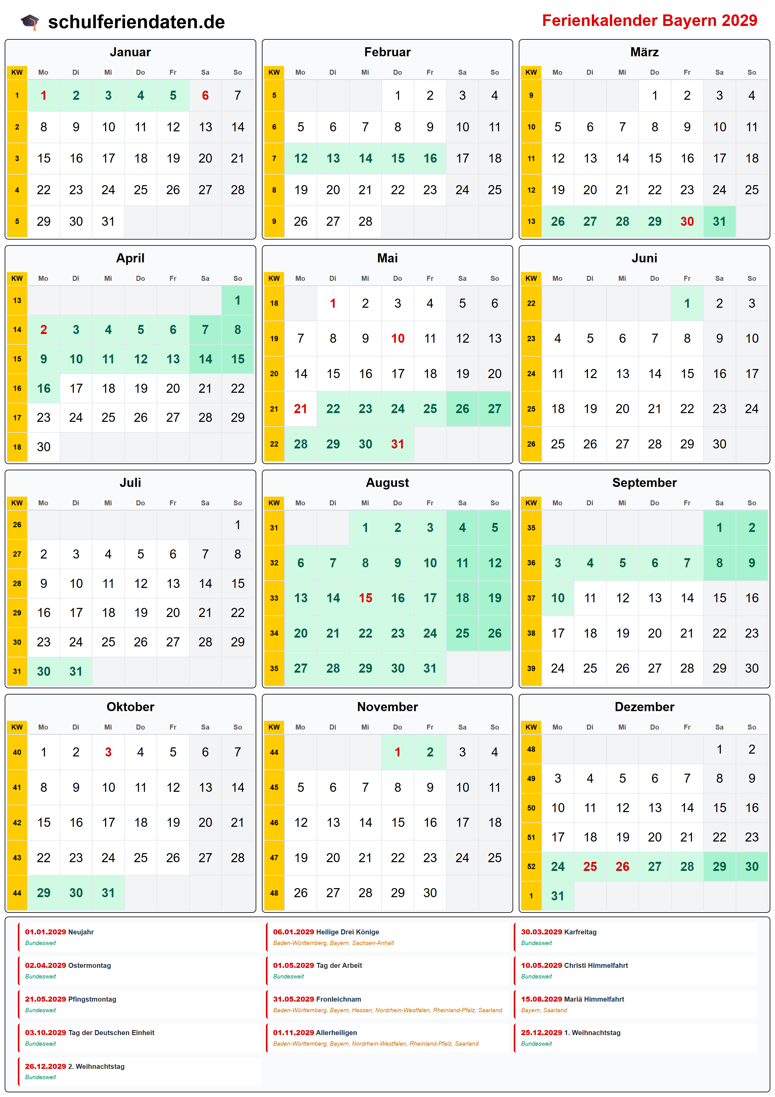 Ferienkalender für Bayern im Jahr 2029 mit allen Schulferien und gesetzlichen Feiertagen. Der Kalender zeigt alle Termine übersichtlich nach Monaten und Kalenderwochen und steht als PDF, PNG und iCal (.ics) zum Download bereit.