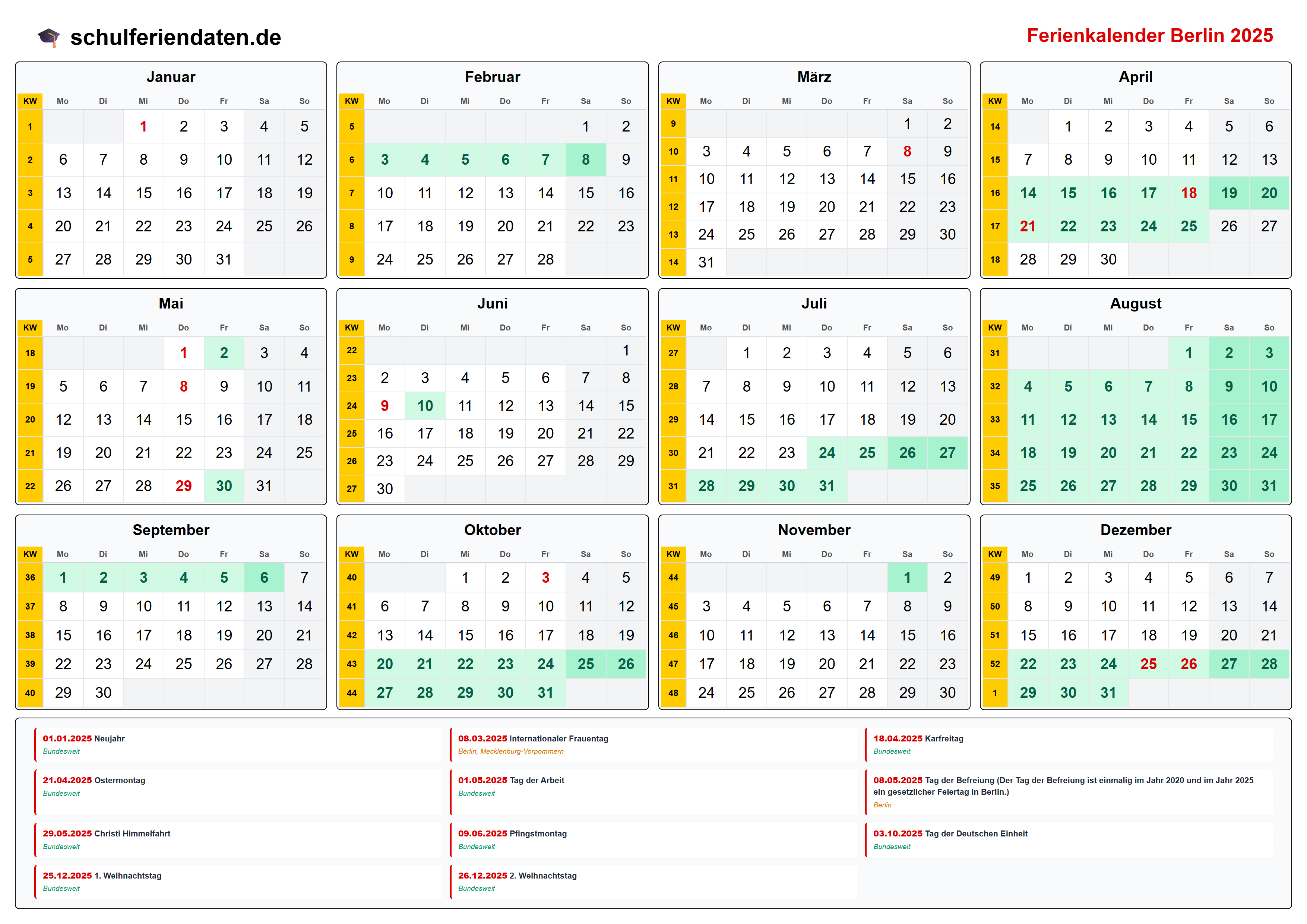Hier finden Sie alle Schulferien 2025 in Berlin – übersichtlich im Kalender mit Kalenderwochen (KW) und markierten Feiertagen.