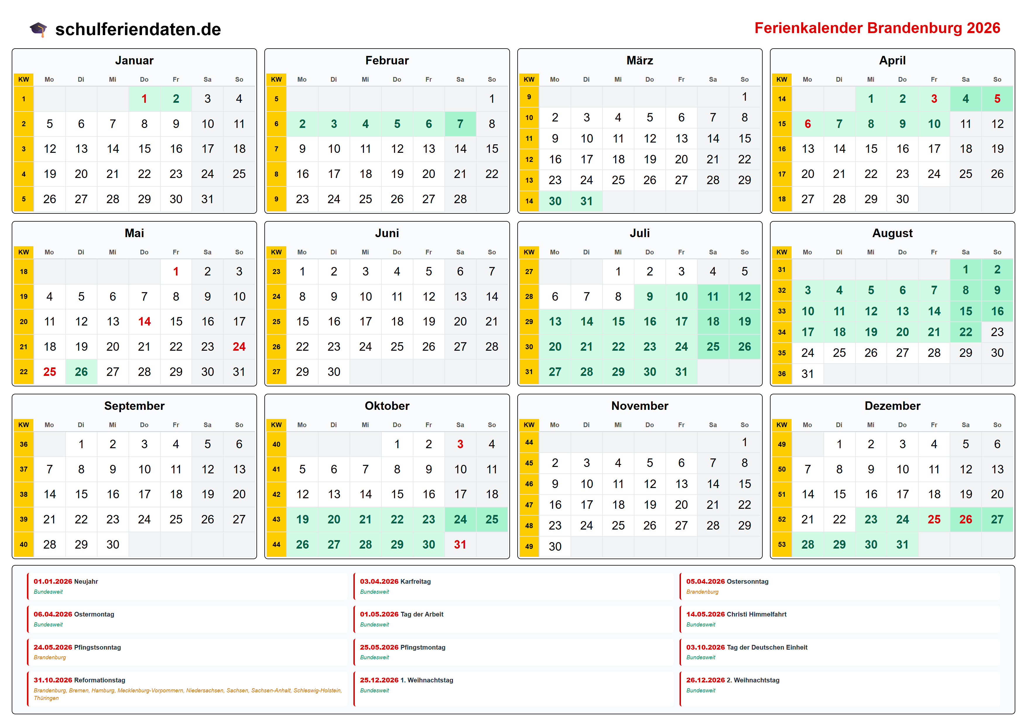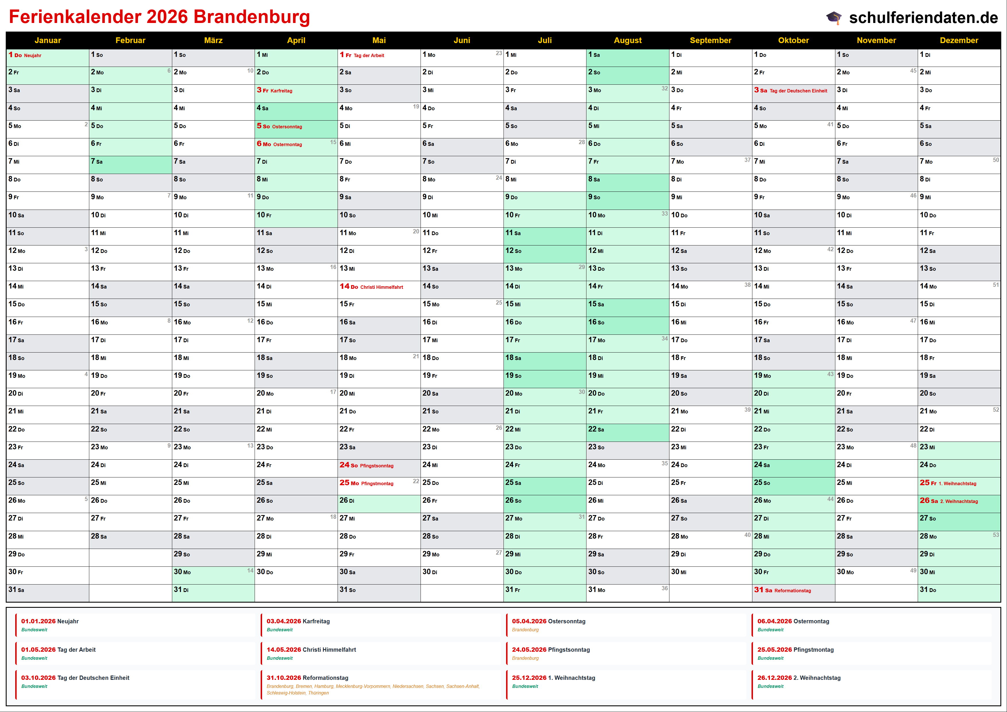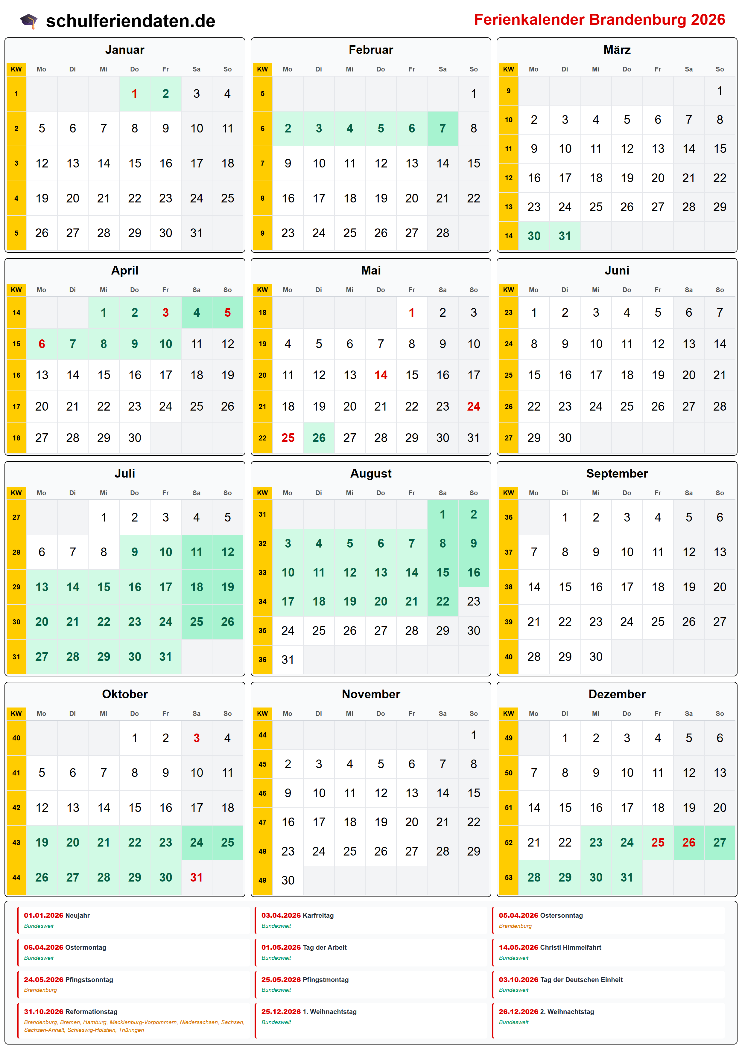 Hier finden Sie alle Schulferien 2026 in Brandenburg – übersichtlich im Kalender mit Kalenderwochen (KW) und markierten Feiertagen.