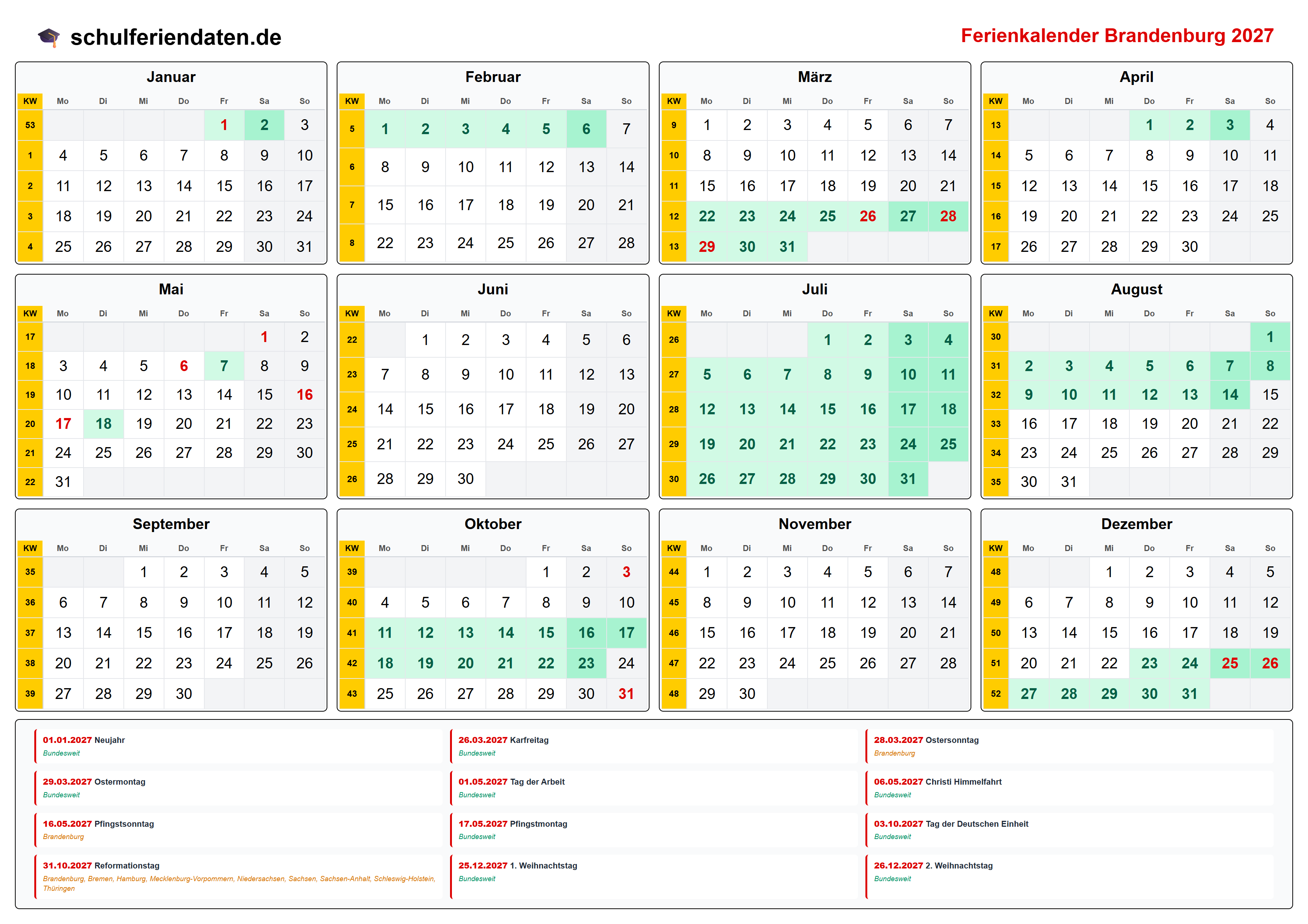 Hier finden Sie alle Schulferien 2027 in Brandenburg – übersichtlich im Kalender mit Kalenderwochen (KW) und markierten Feiertagen.