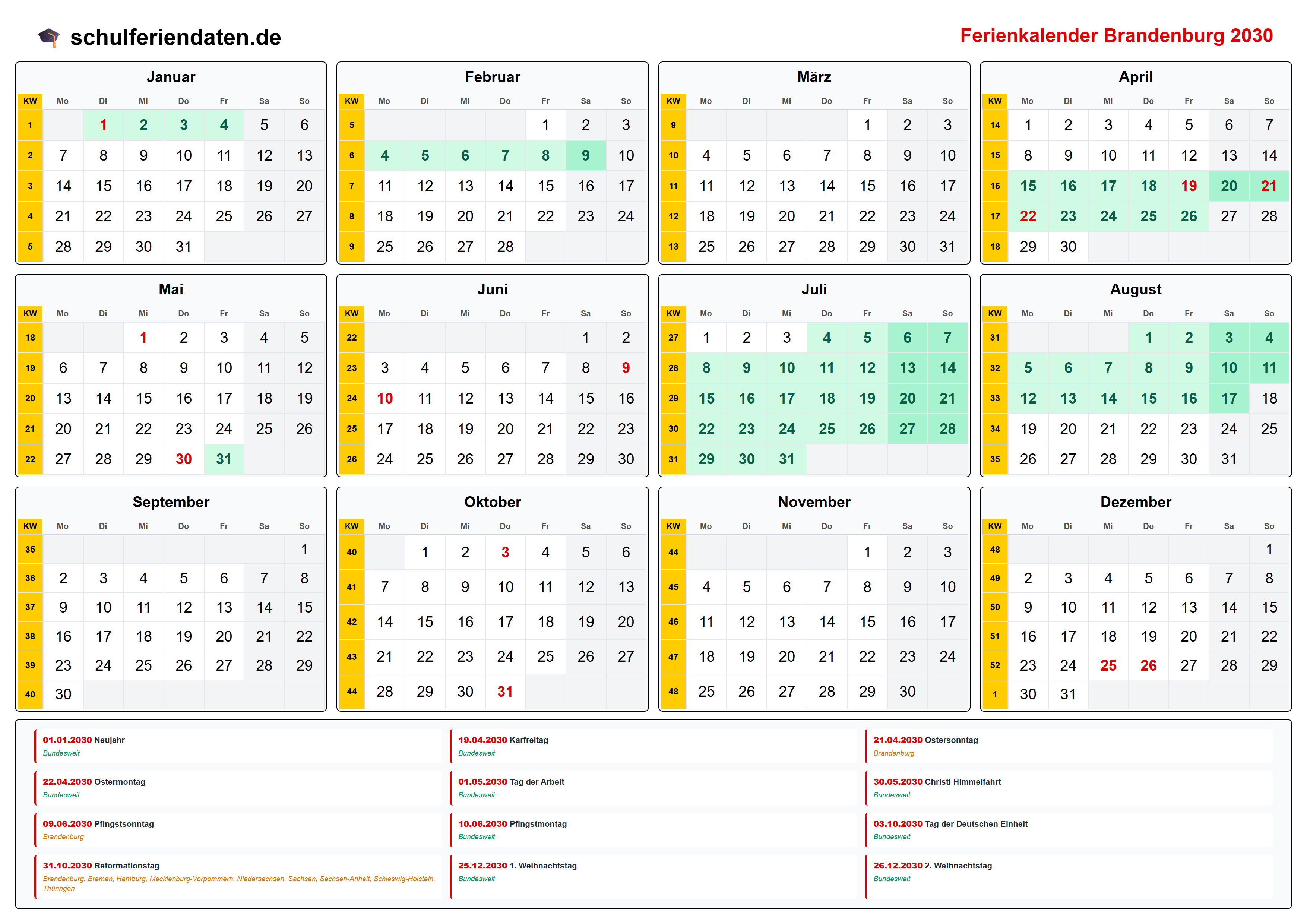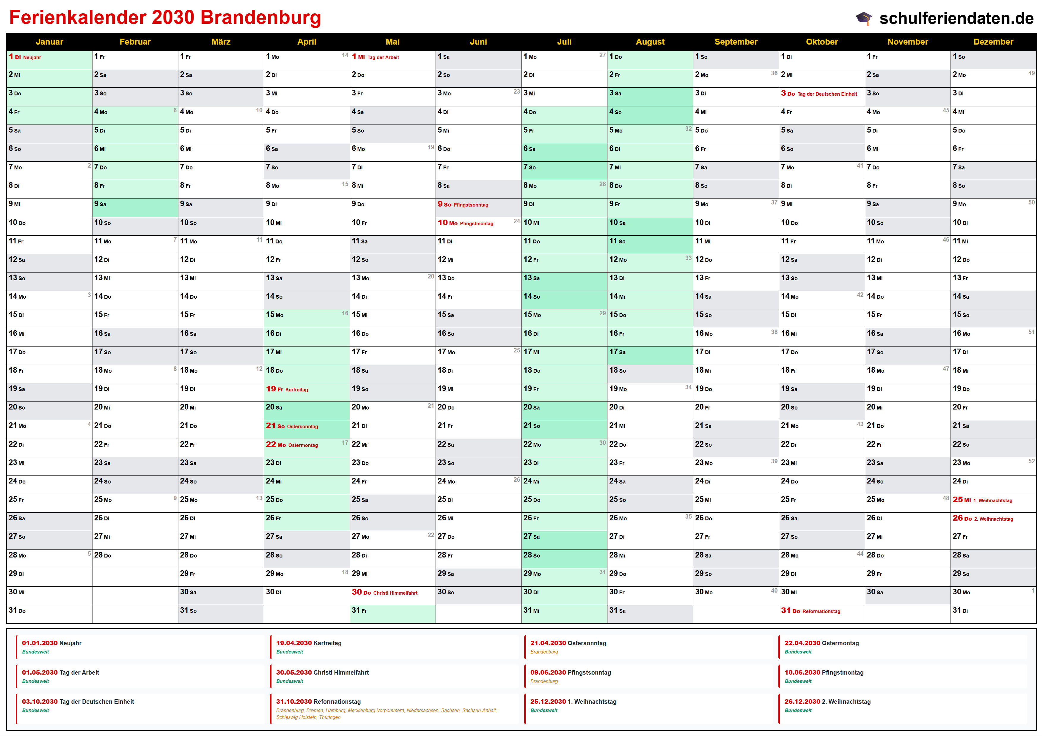 Ferienkalender für Brandenburg im Jahr 2030 mit allen Schulferien und gesetzlichen Feiertagen. Der Kalender zeigt alle Termine übersichtlich nach Monaten und Kalenderwochen und steht als PDF, PNG und iCal (.ics) zum Download bereit.