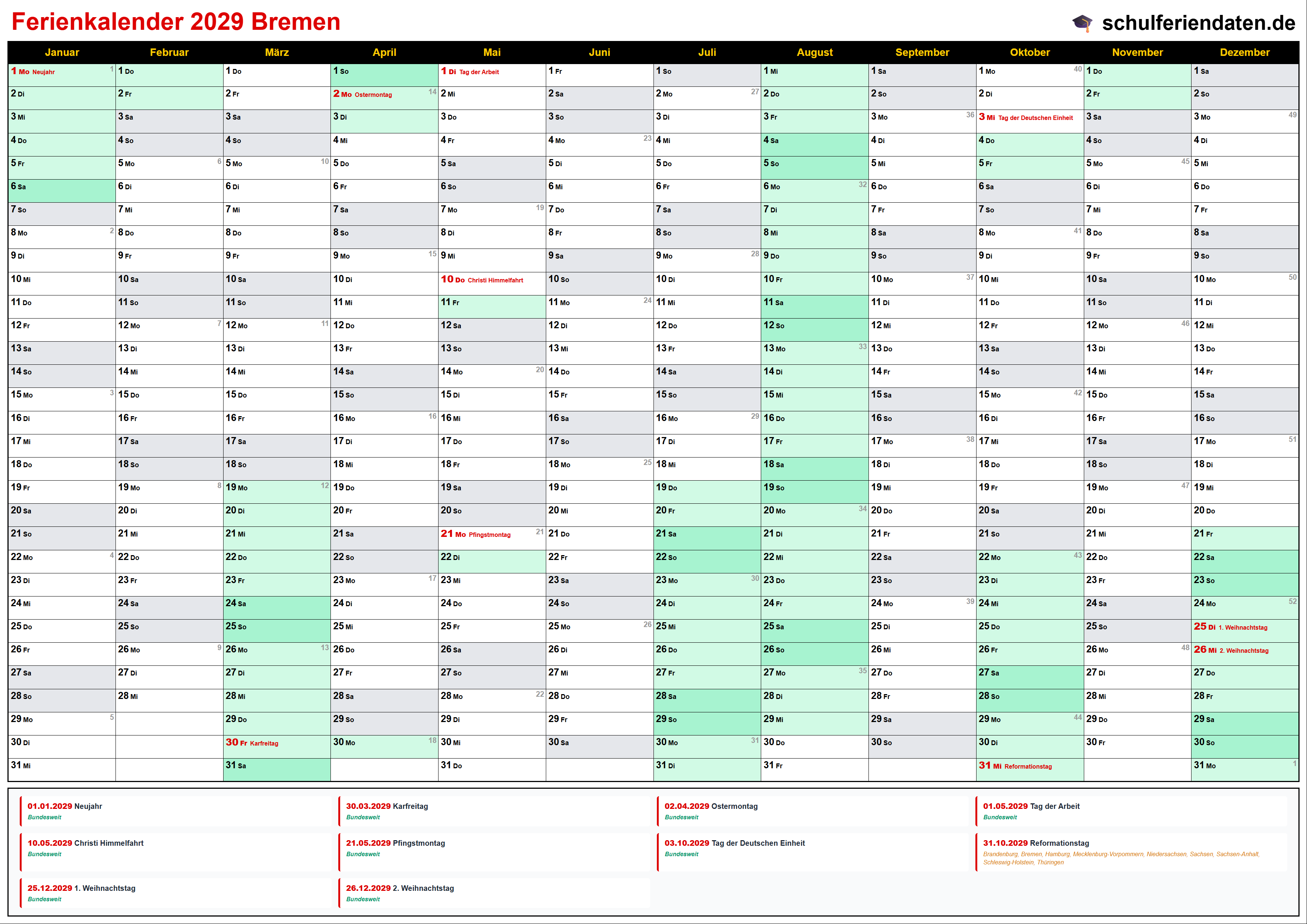 Ferienkalender für Bremen im Jahr 2029 mit allen Schulferien und gesetzlichen Feiertagen. Der Kalender zeigt alle Termine übersichtlich nach Monaten und Kalenderwochen und steht als PDF, PNG und iCal (.ics) zum Download bereit.