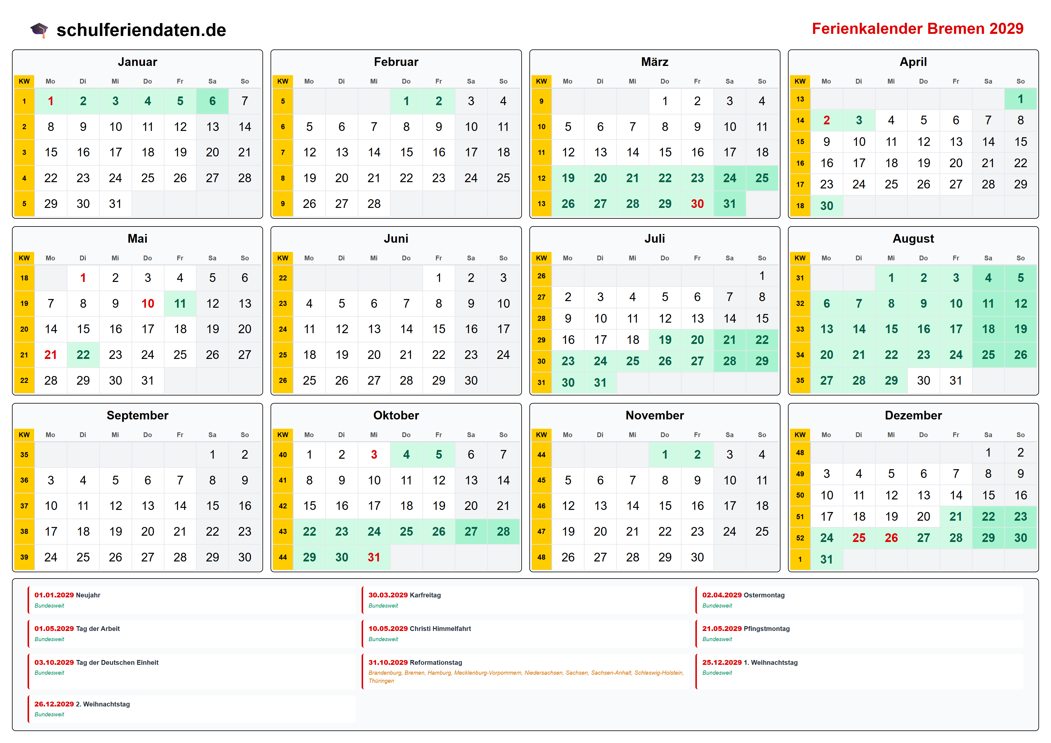Laden Sie unseren Kalender 2029 mit den Feiertagen für Bremen in den Formaten PDF oder PNG. Sie können die Kalender auch auf Ihrer Webseite einbinden oder in Ihrer Publikation abdrucken. In dem Fall muss schulferiendaten.de als Quelle angegeben bzw. verlinkt sein.