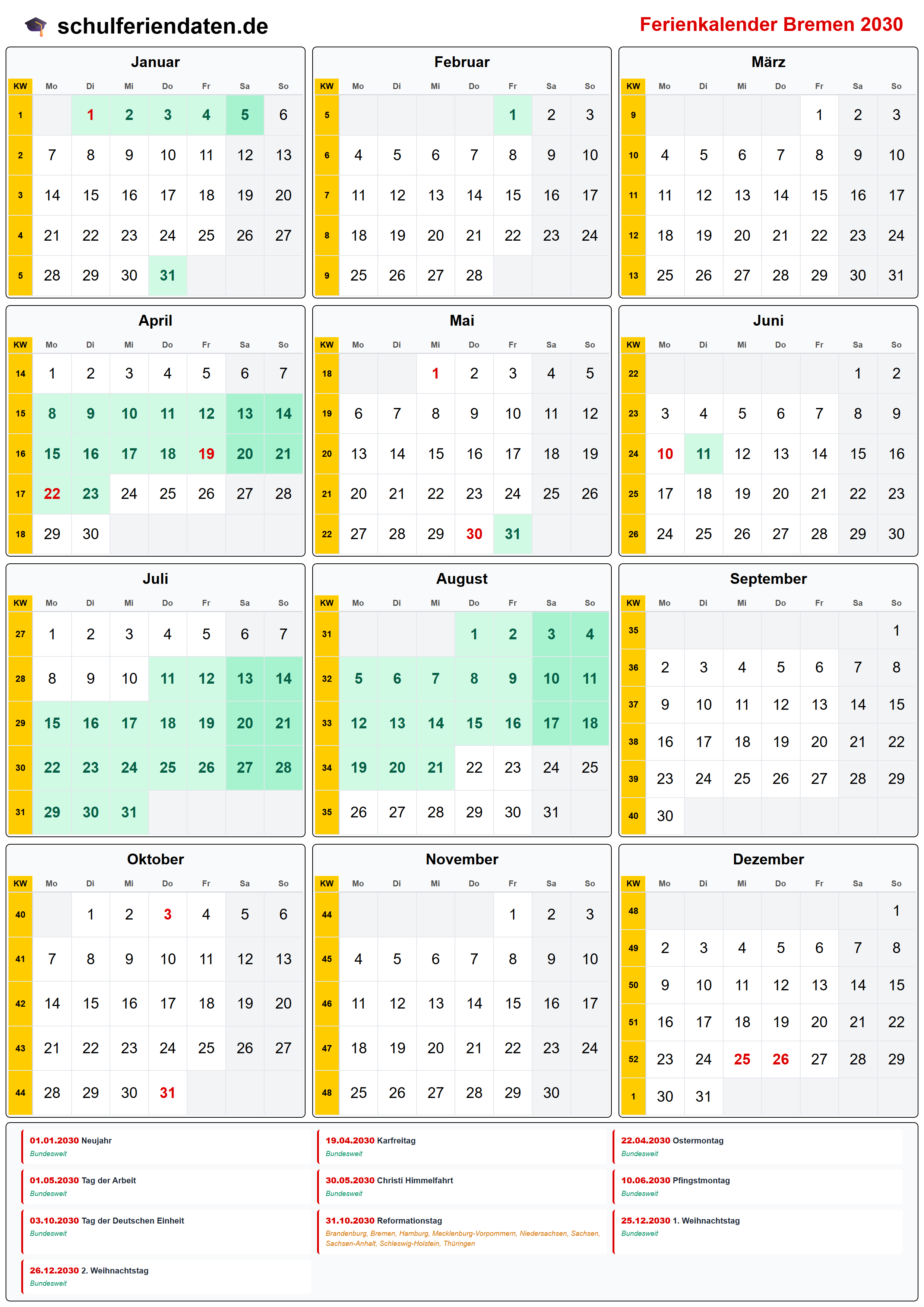 Laden Sie unseren Kalender 2030 mit den Feiertagen für Bremen in den Formaten PDF oder PNG. Sie können die Kalender auch auf Ihrer Webseite einbinden oder in Ihrer Publikation abdrucken. In dem Fall muss schulferiendaten.de als Quelle angegeben bzw. verlinkt sein.