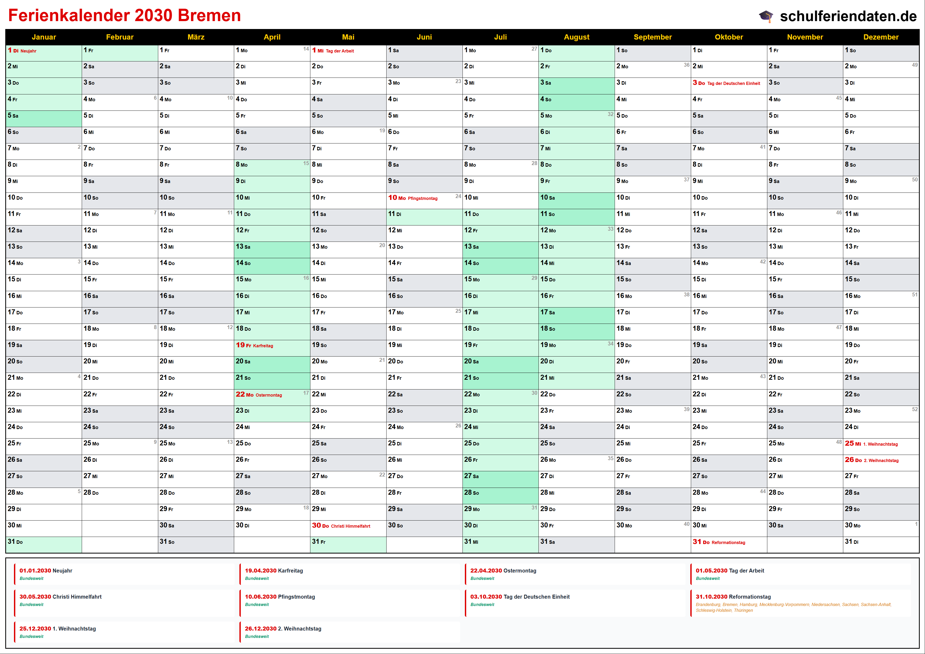 Ferienkalender für Bremen im Jahr 2030 mit allen Schulferien und gesetzlichen Feiertagen. Der Kalender zeigt alle Termine übersichtlich nach Monaten und Kalenderwochen und steht als PDF, PNG und iCal (.ics) zum Download bereit.