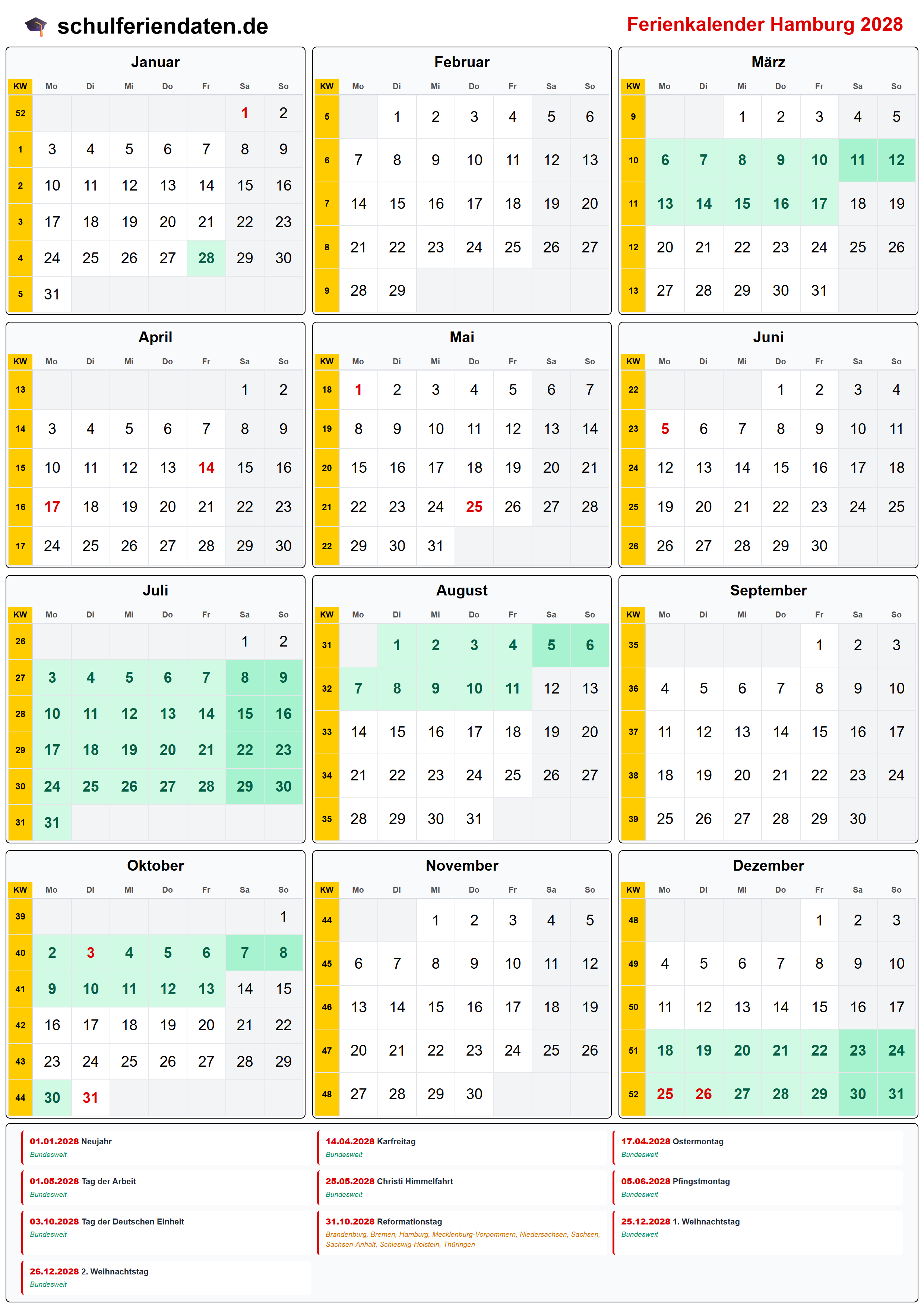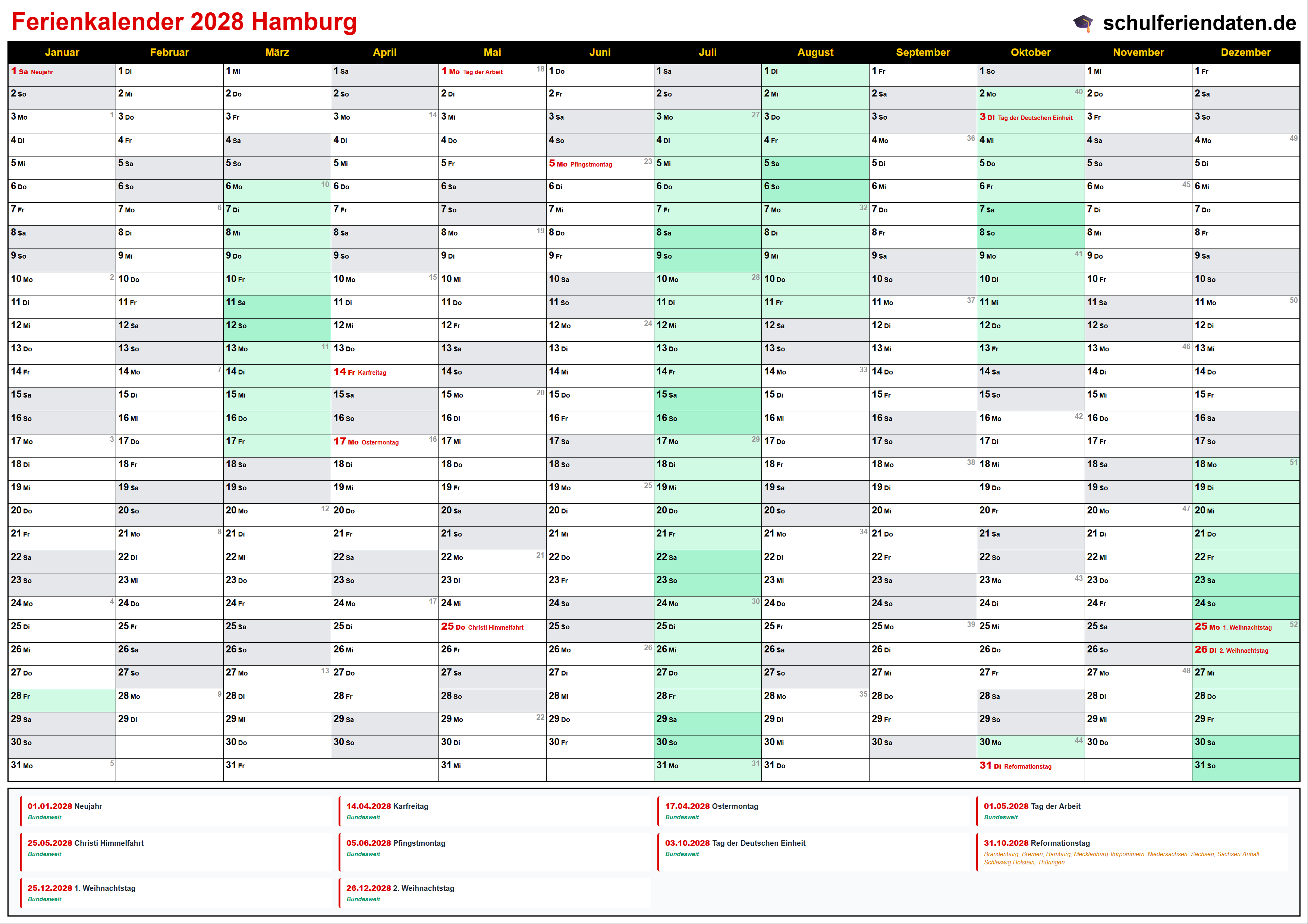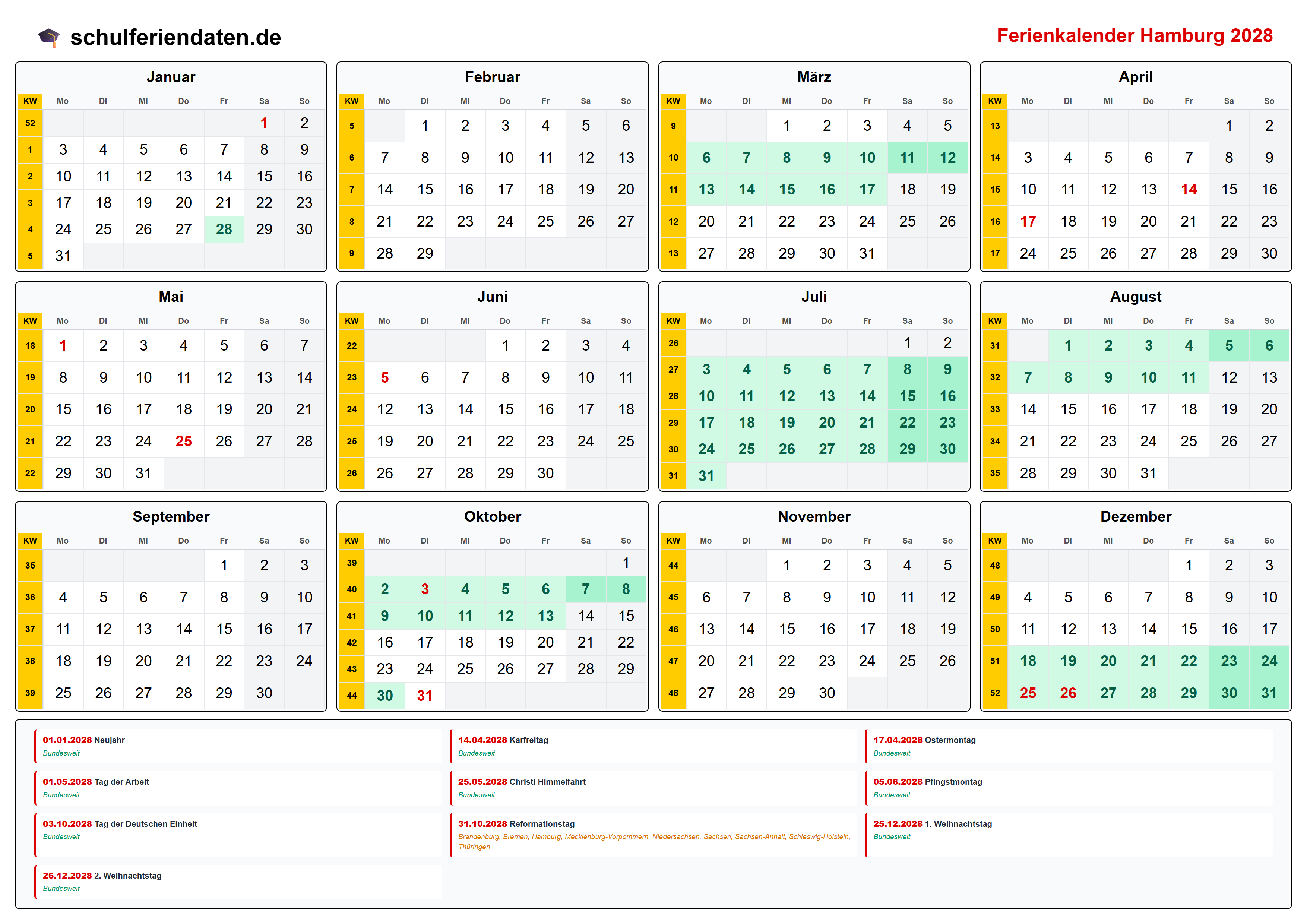 Hier finden Sie alle Schulferien 2028 in Hamburg – übersichtlich im Kalender mit Kalenderwochen (KW) und markierten Feiertagen.