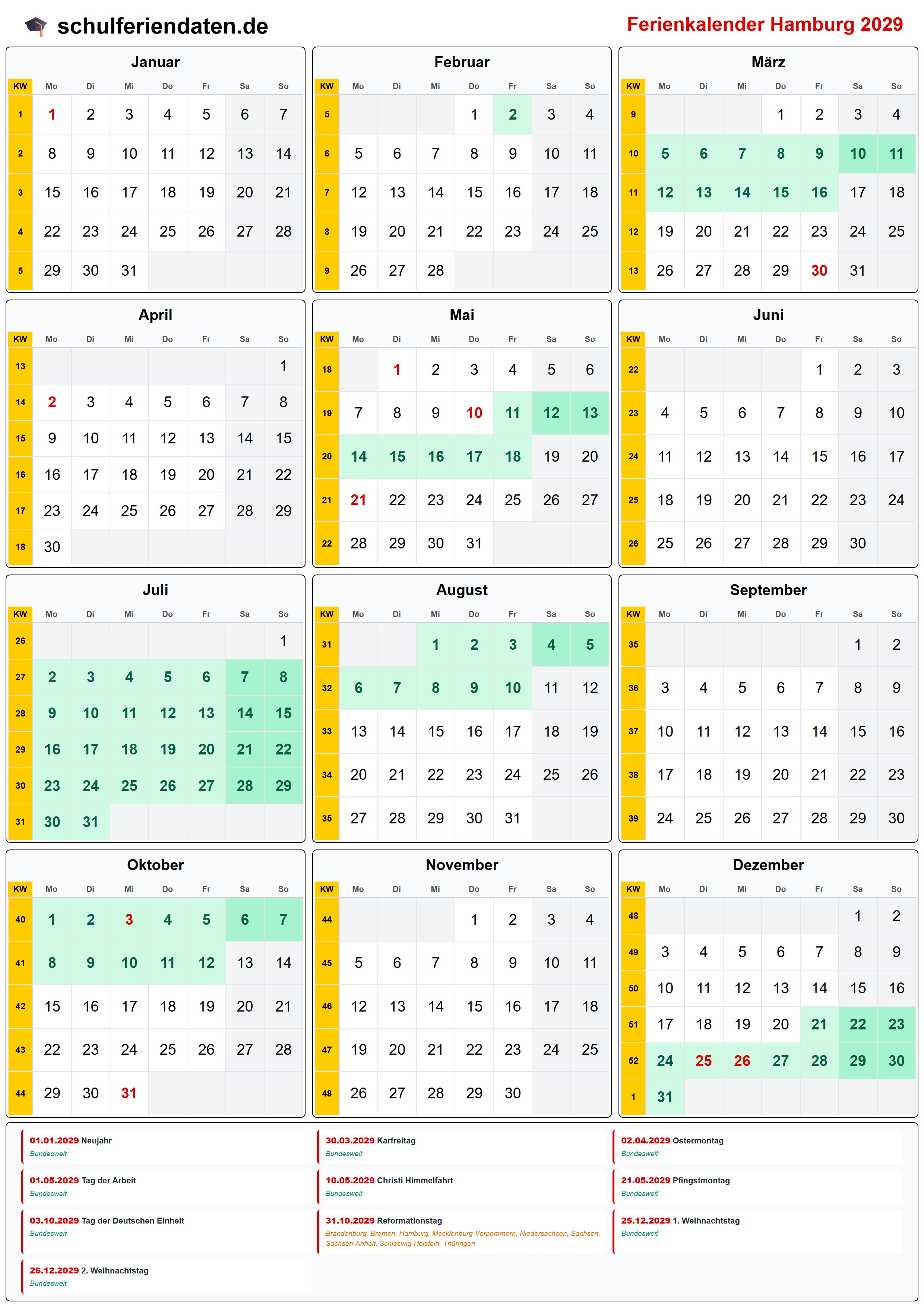 Laden Sie unseren Kalender 2029 mit den Feiertagen für Hamburg in den Formaten PDF oder PNG. Sie können die Kalender auch auf Ihrer Webseite einbinden oder in Ihrer Publikation abdrucken. In dem Fall muss schulferiendaten.de als Quelle angegeben bzw. verlinkt sein.
