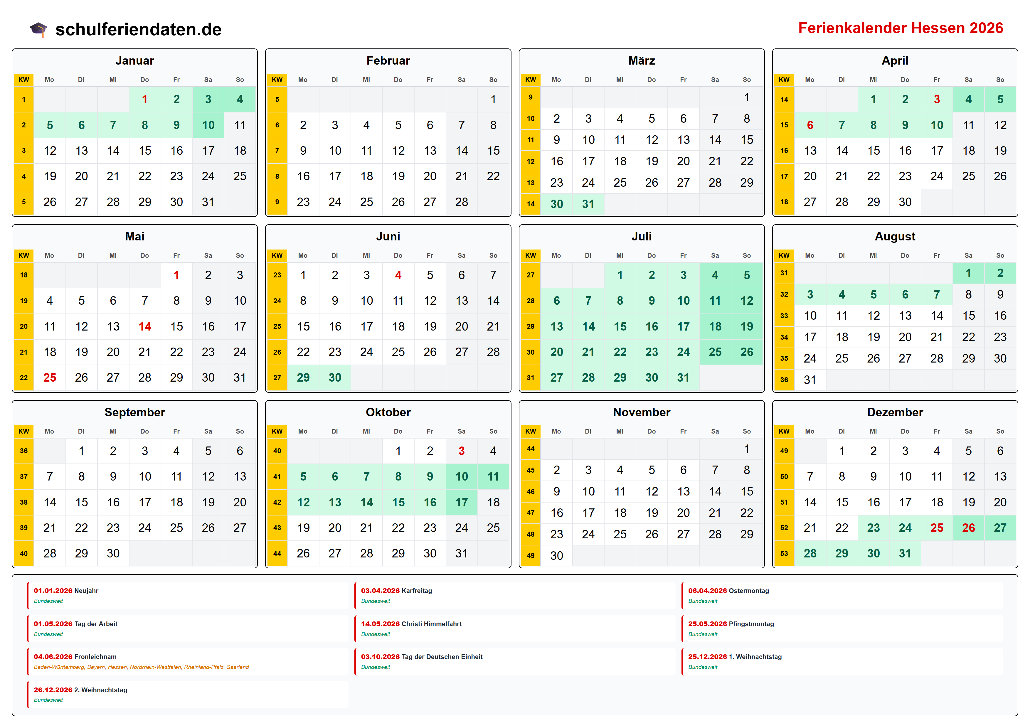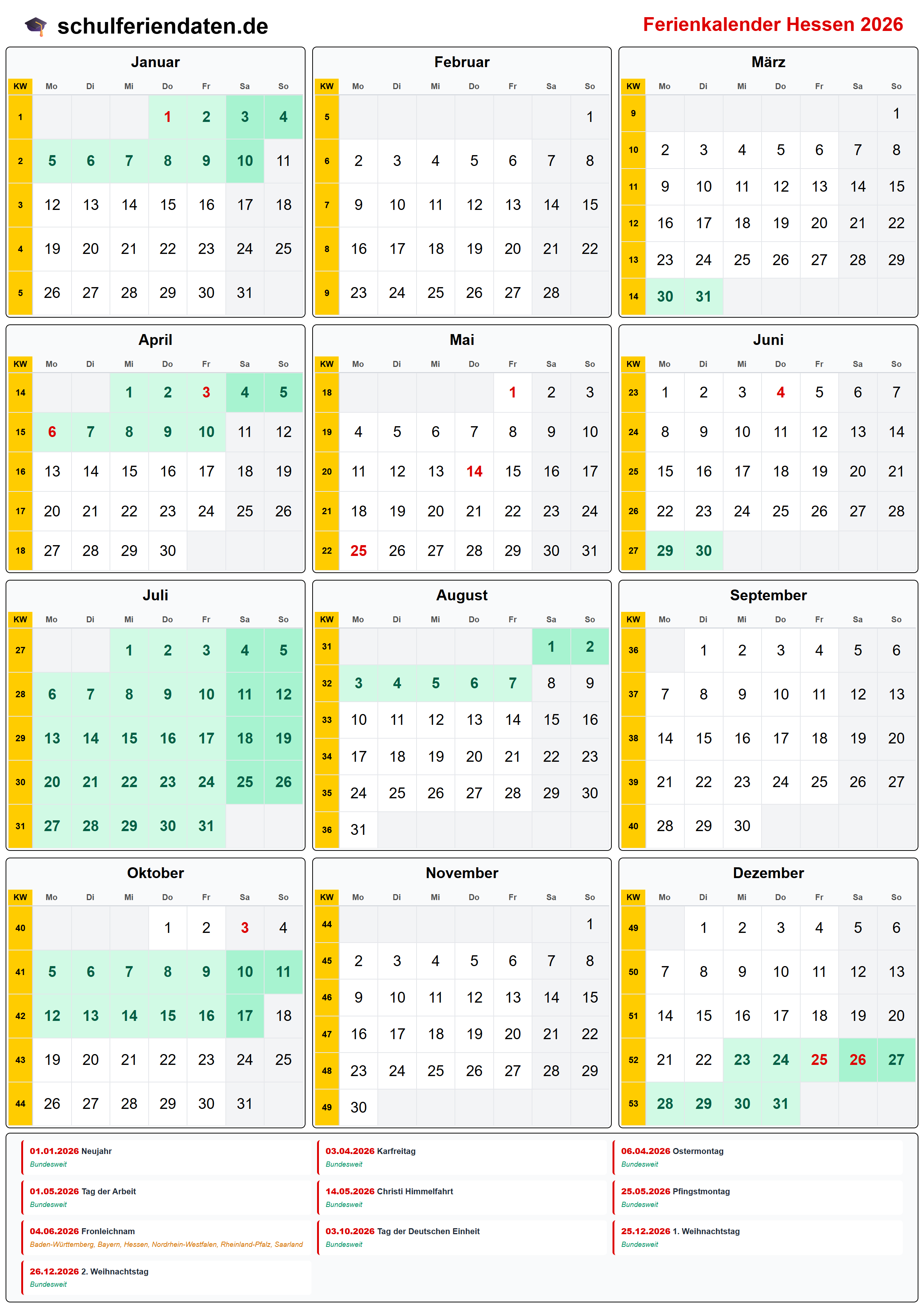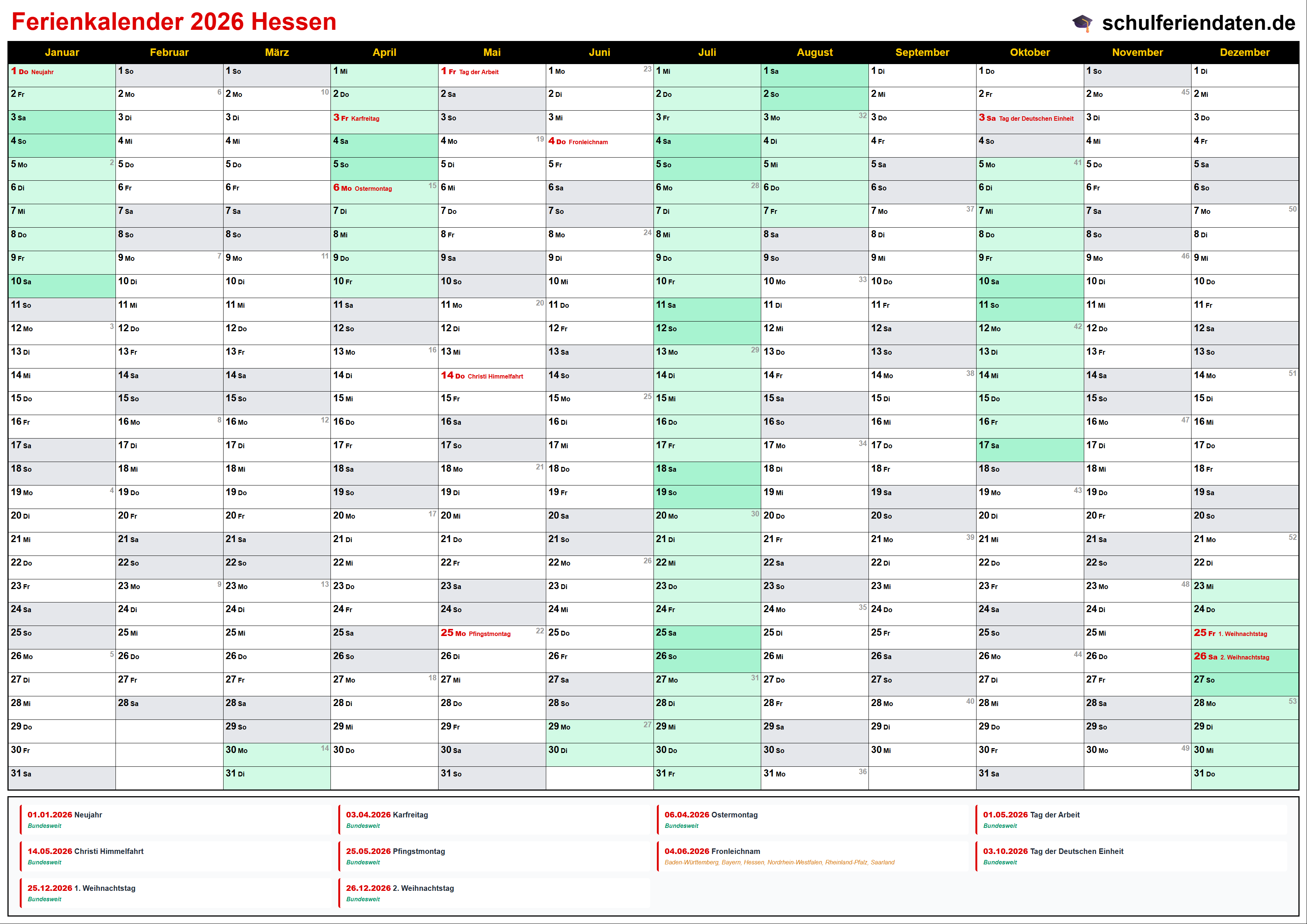 Laden Sie unseren Kalender 2026 mit den Feiertagen für Hessen in den Formaten PDF oder PNG. Sie können die Kalender auch auf Ihrer Webseite einbinden oder in Ihrer Publikation abdrucken. In dem Fall muss schulferiendaten.de als Quelle angegeben bzw. verlinkt sein.