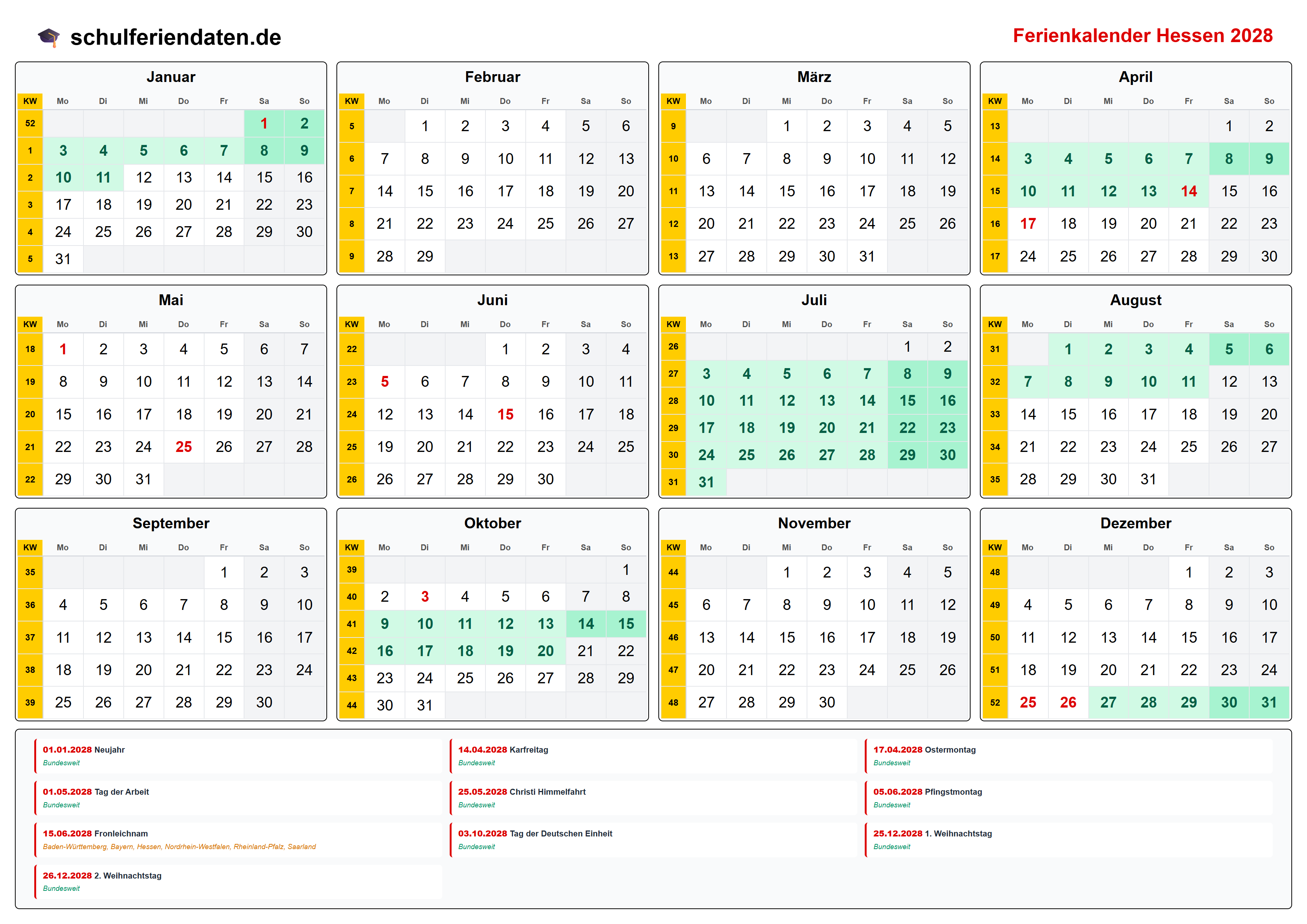 Hier finden Sie alle Schulferien 2028 in Hessen – übersichtlich im Kalender mit Kalenderwochen (KW) und markierten Feiertagen.