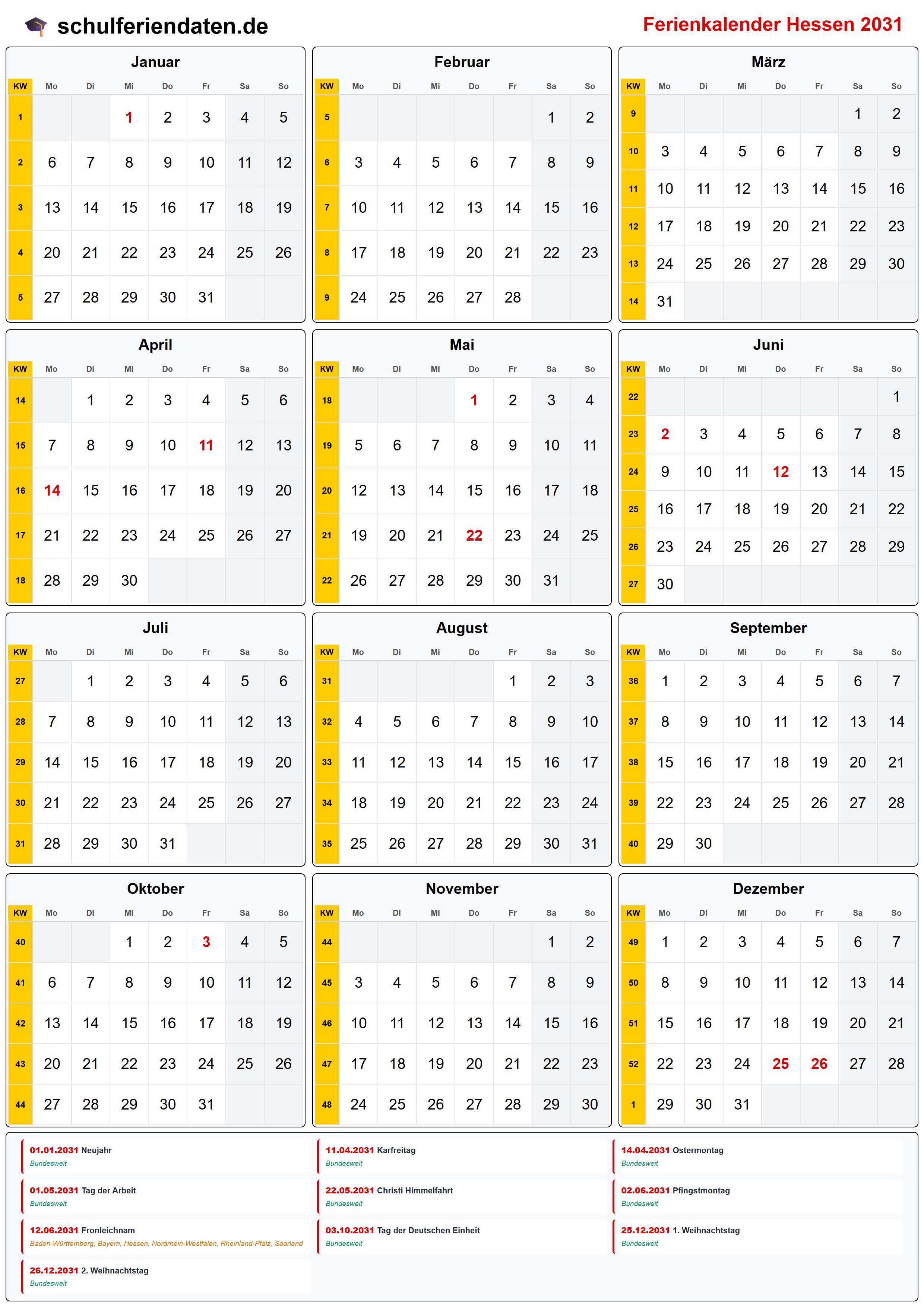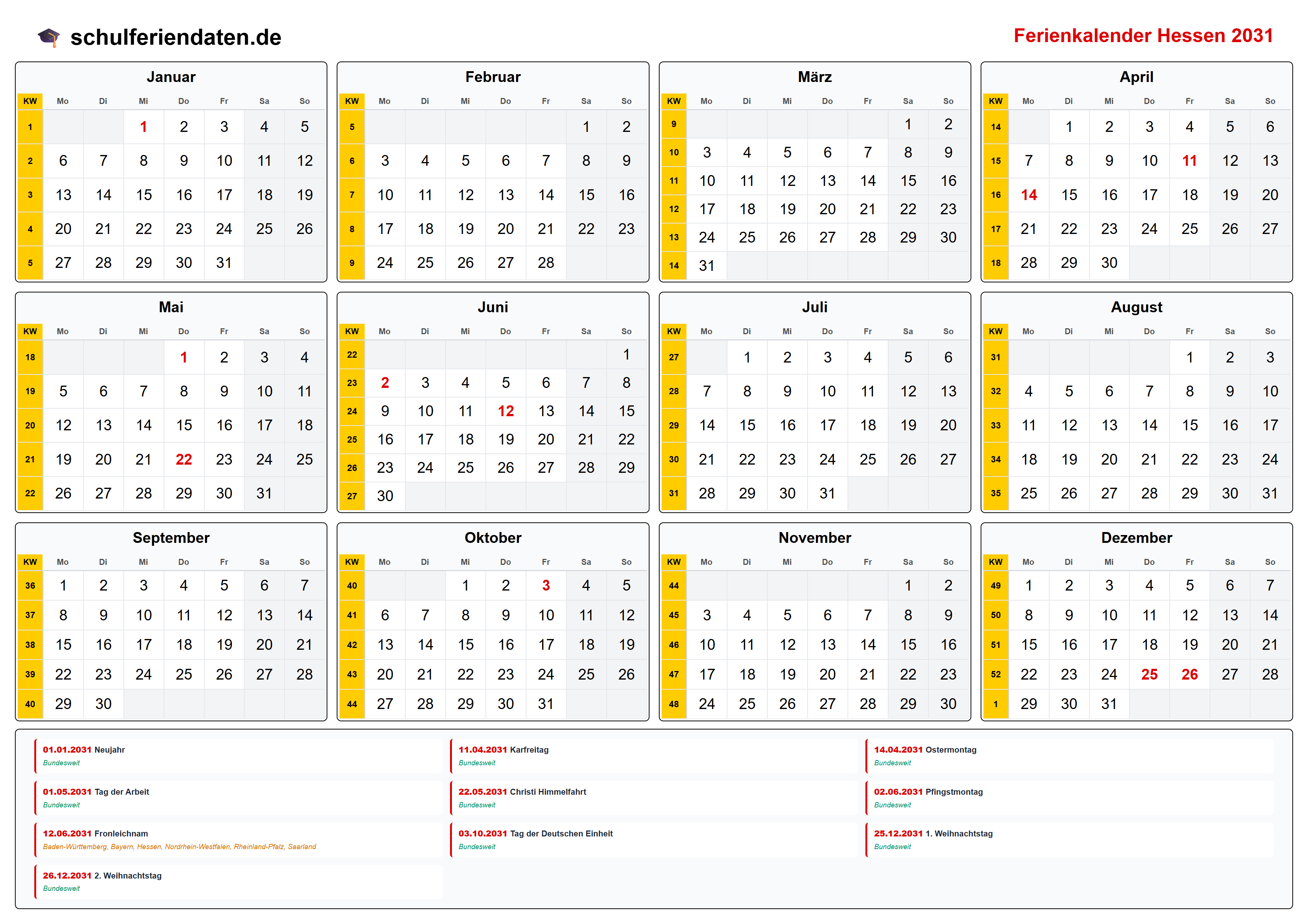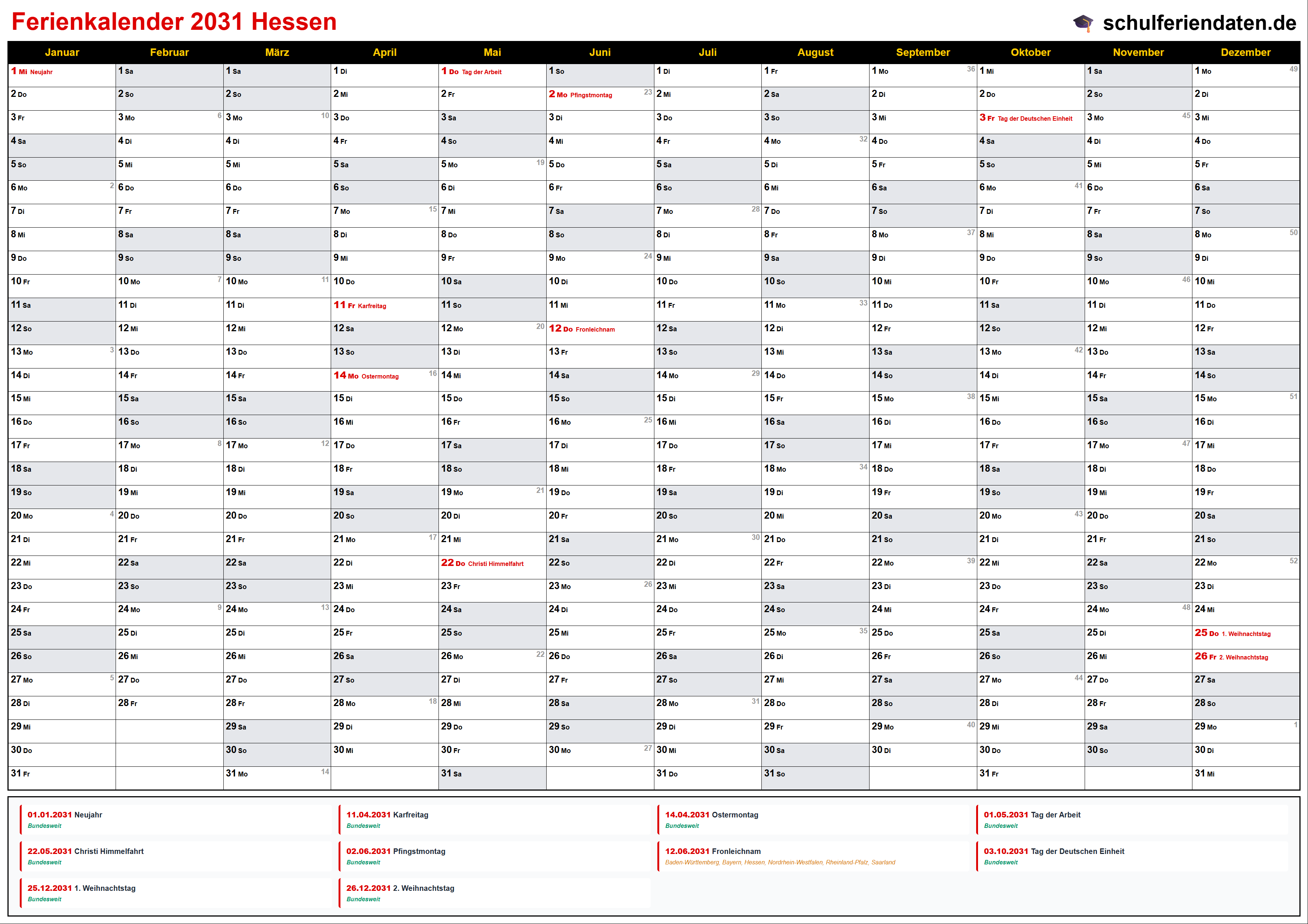Laden Sie unseren Kalender 2031 mit den Feiertagen für Hessen in den Formaten PDF oder PNG. Sie können die Kalender auch auf Ihrer Webseite einbinden oder in Ihrer Publikation abdrucken. In dem Fall muss schulferiendaten.de als Quelle angegeben bzw. verlinkt sein.
