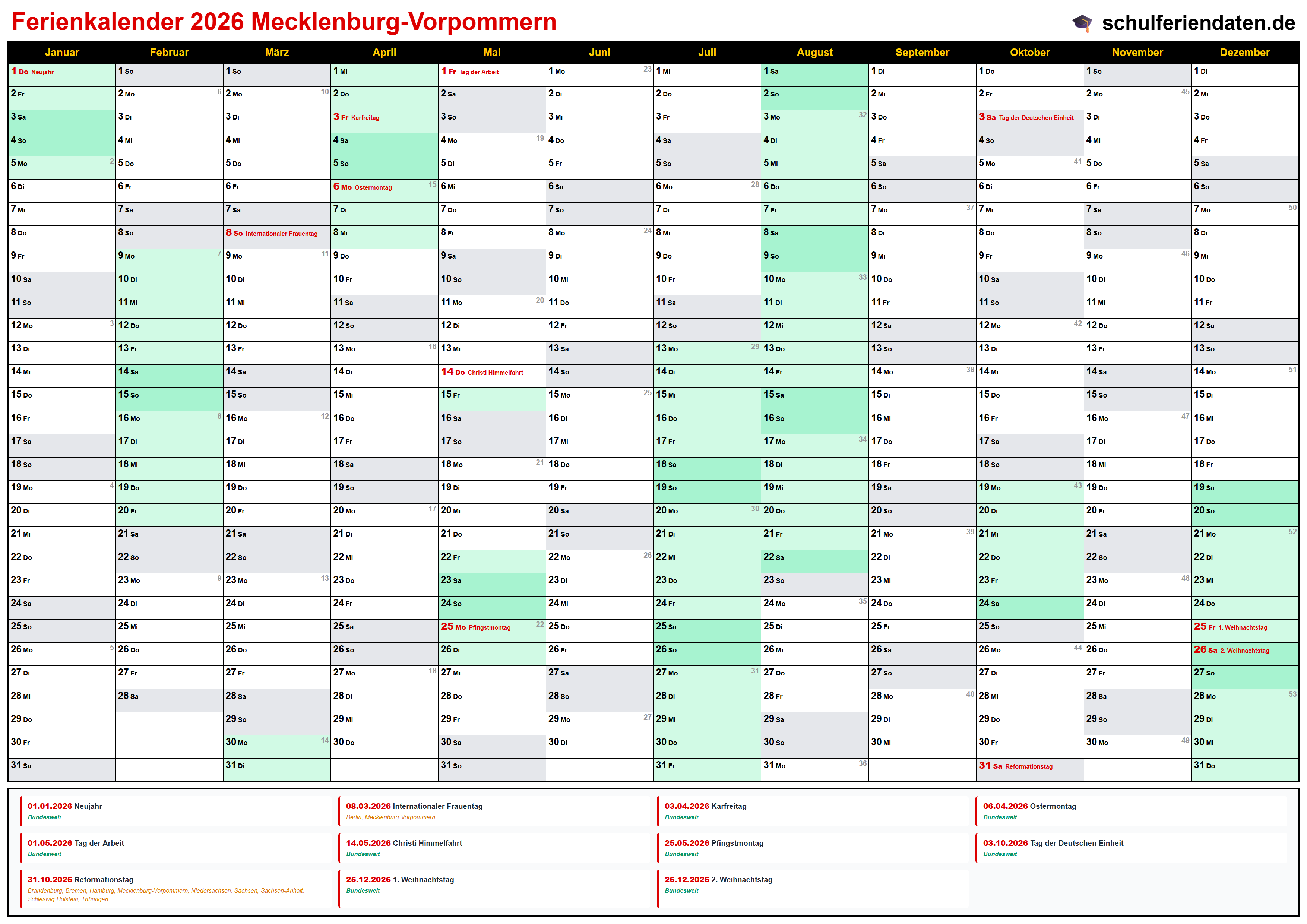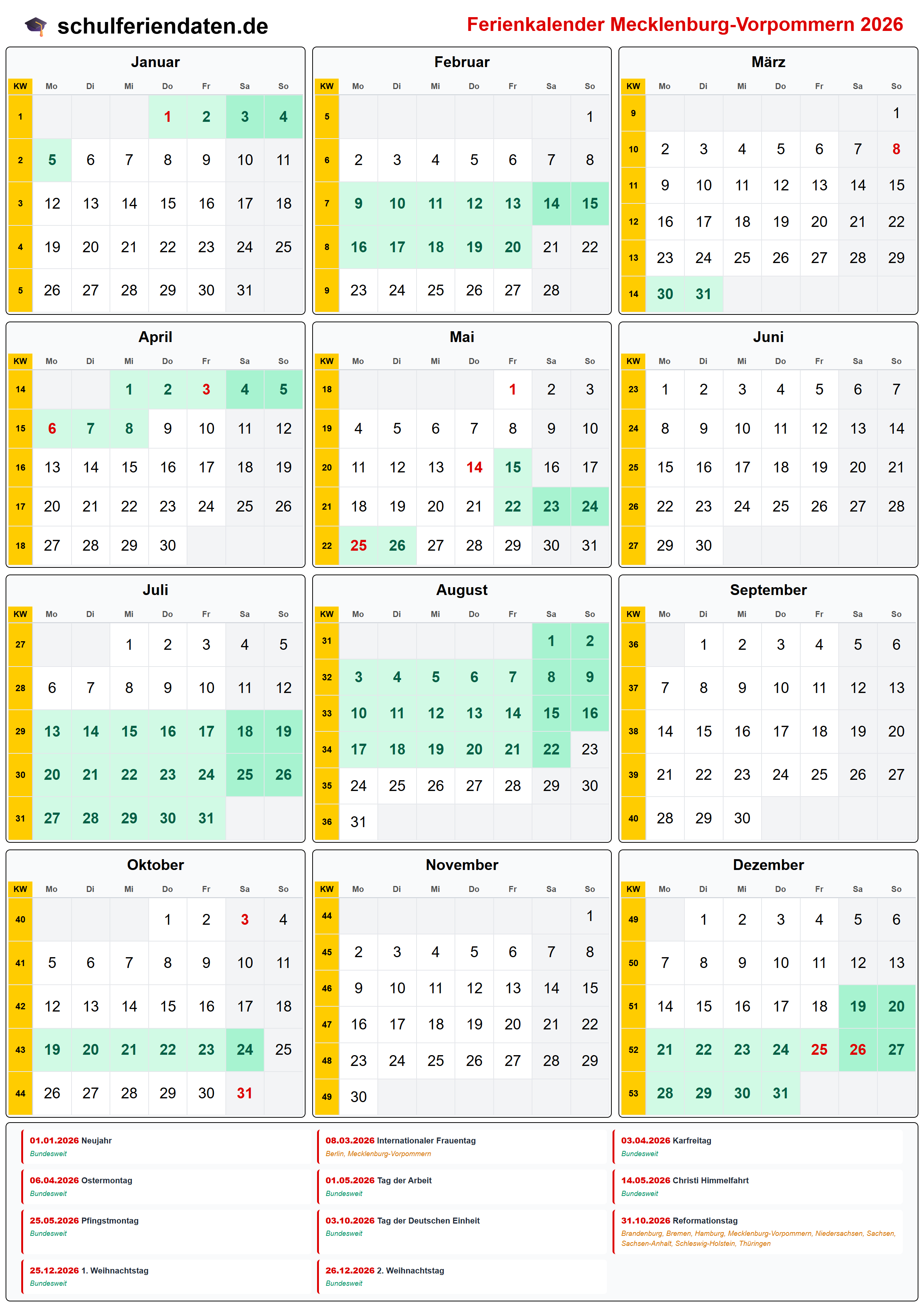 Laden Sie unseren Kalender 2026 mit den Feiertagen für Mecklenburg-Vorpommern in den Formaten PDF oder PNG. Sie können die Kalender auch auf Ihrer Webseite einbinden oder in Ihrer Publikation abdrucken. In dem Fall muss schulferiendaten.de als Quelle angegeben bzw. verlinkt sein.