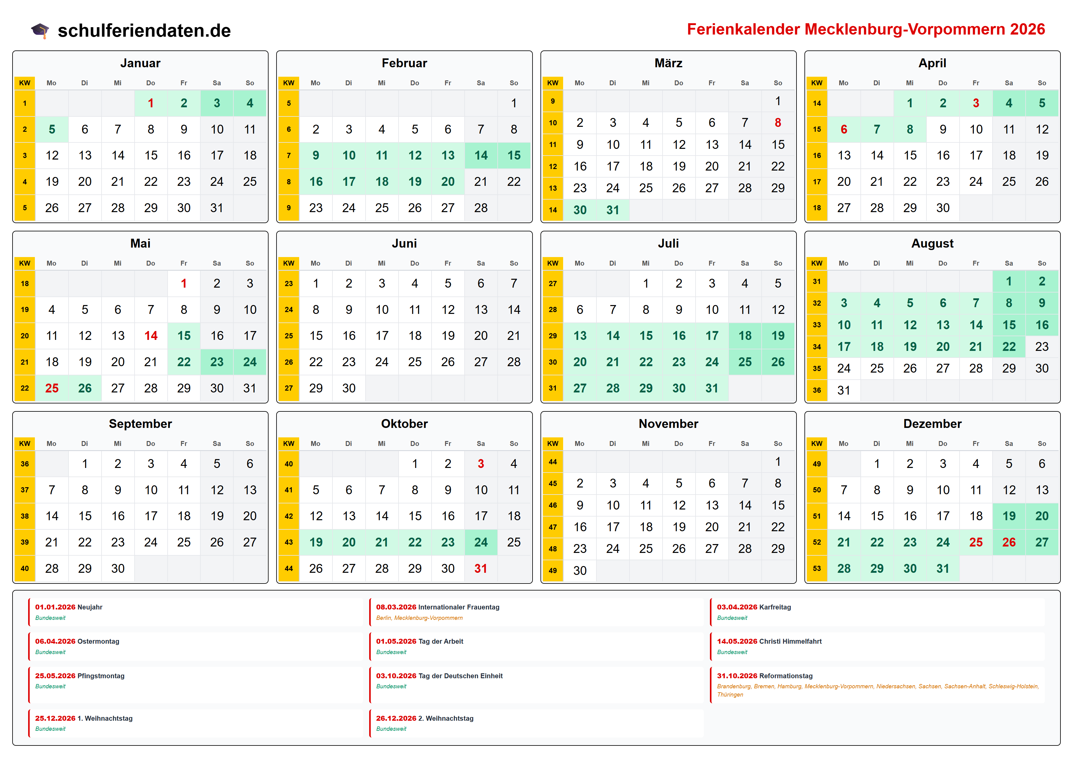 Hier finden Sie alle Schulferien 2026 in Mecklenburg-Vorpommern – übersichtlich im Kalender mit Kalenderwochen (KW) und markierten Feiertagen.