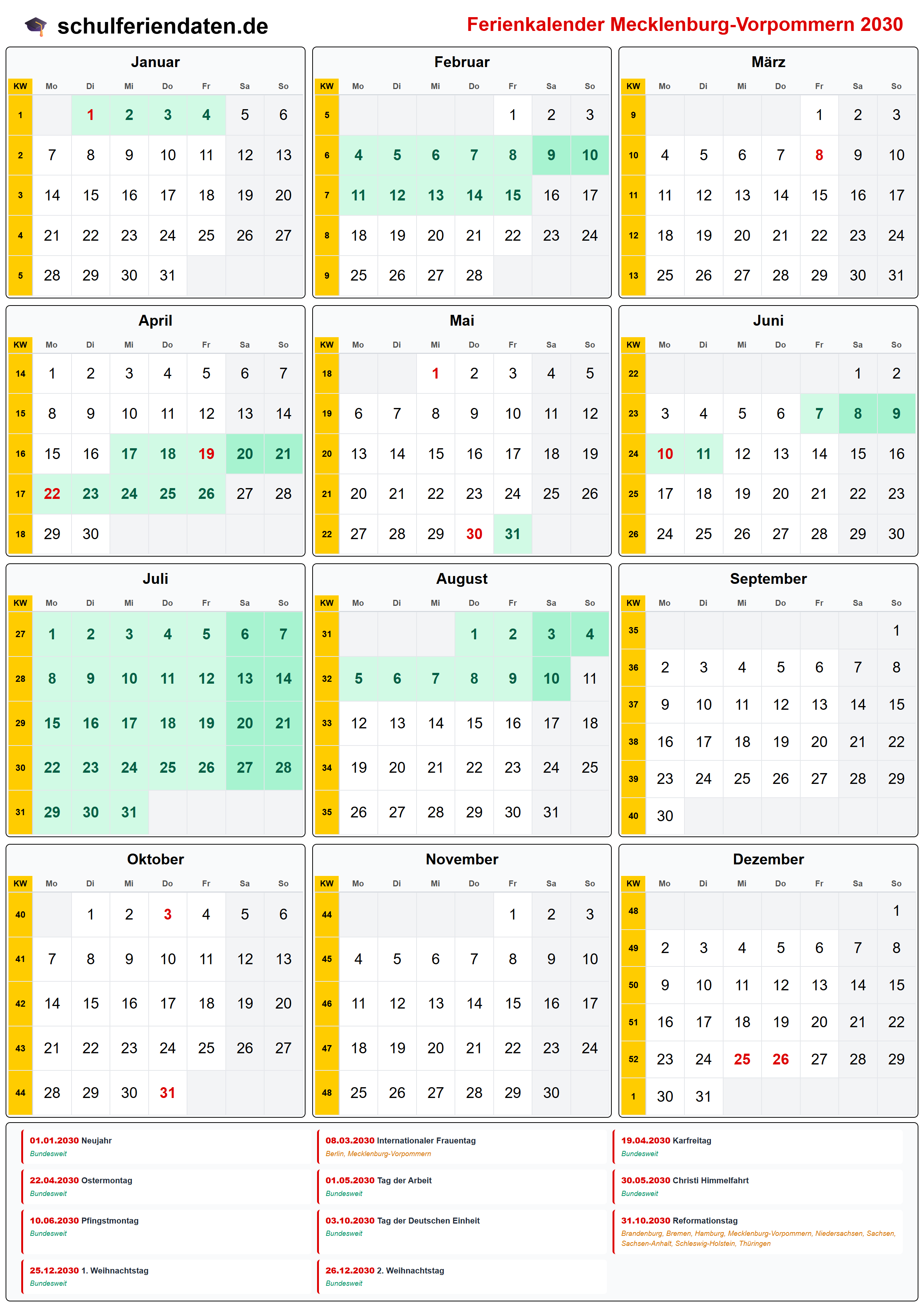 Hier finden Sie alle Schulferien 2030 in Mecklenburg-Vorpommern – übersichtlich im Kalender mit Kalenderwochen (KW) und markierten Feiertagen.