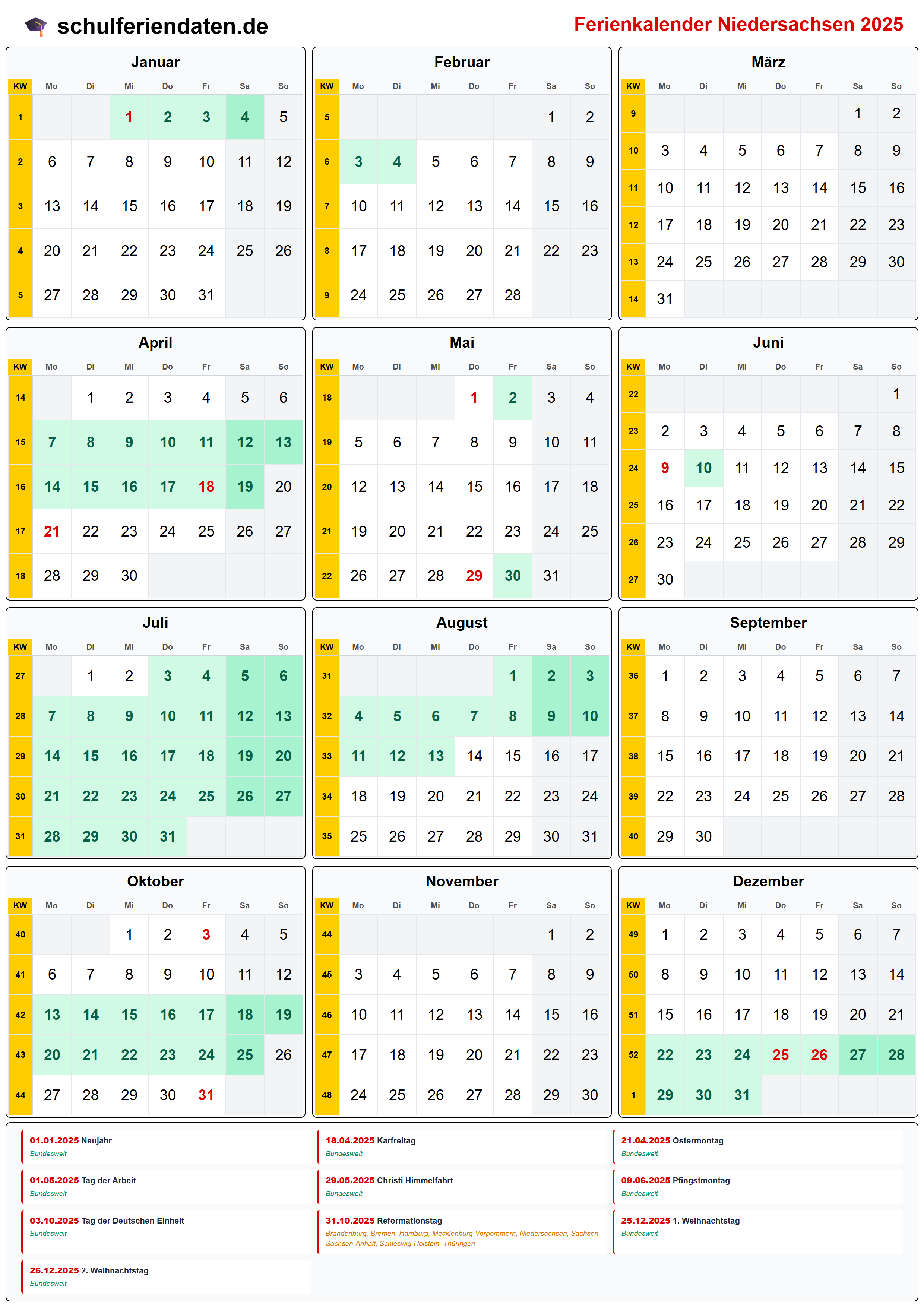 Laden Sie unseren Kalender 2025 mit den Feiertagen für Niedersachsen in den Formaten PDF oder PNG. Sie können die Kalender auch auf Ihrer Webseite einbinden oder in Ihrer Publikation abdrucken. In dem Fall muss schulferiendaten.de als Quelle angegeben bzw. verlinkt sein.