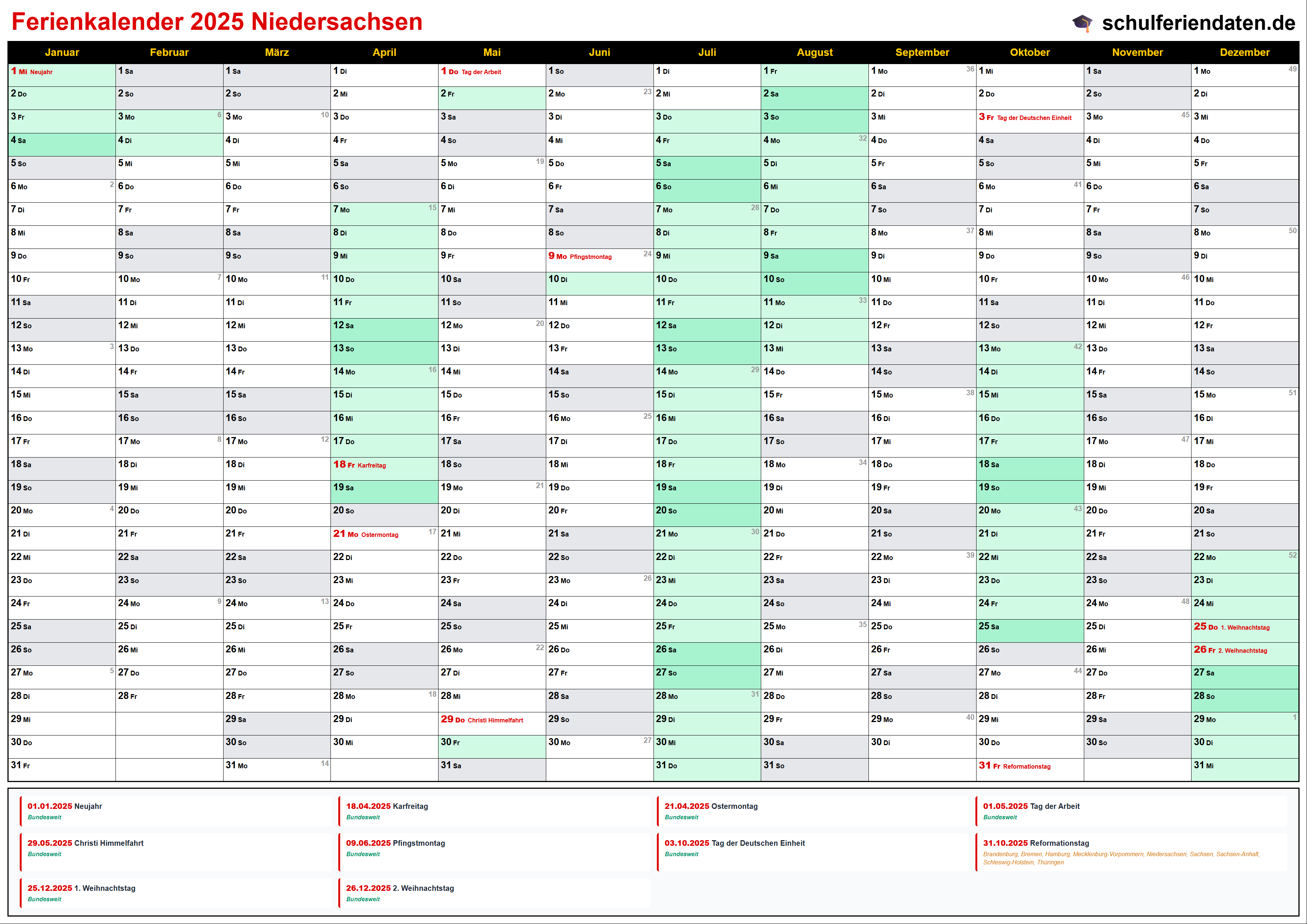 Ferienkalender für Niedersachsen im Jahr 2025 mit allen Schulferien und gesetzlichen Feiertagen. Der Kalender zeigt alle Termine übersichtlich nach Monaten und Kalenderwochen und steht als PDF, PNG und iCal (.ics) zum Download bereit.