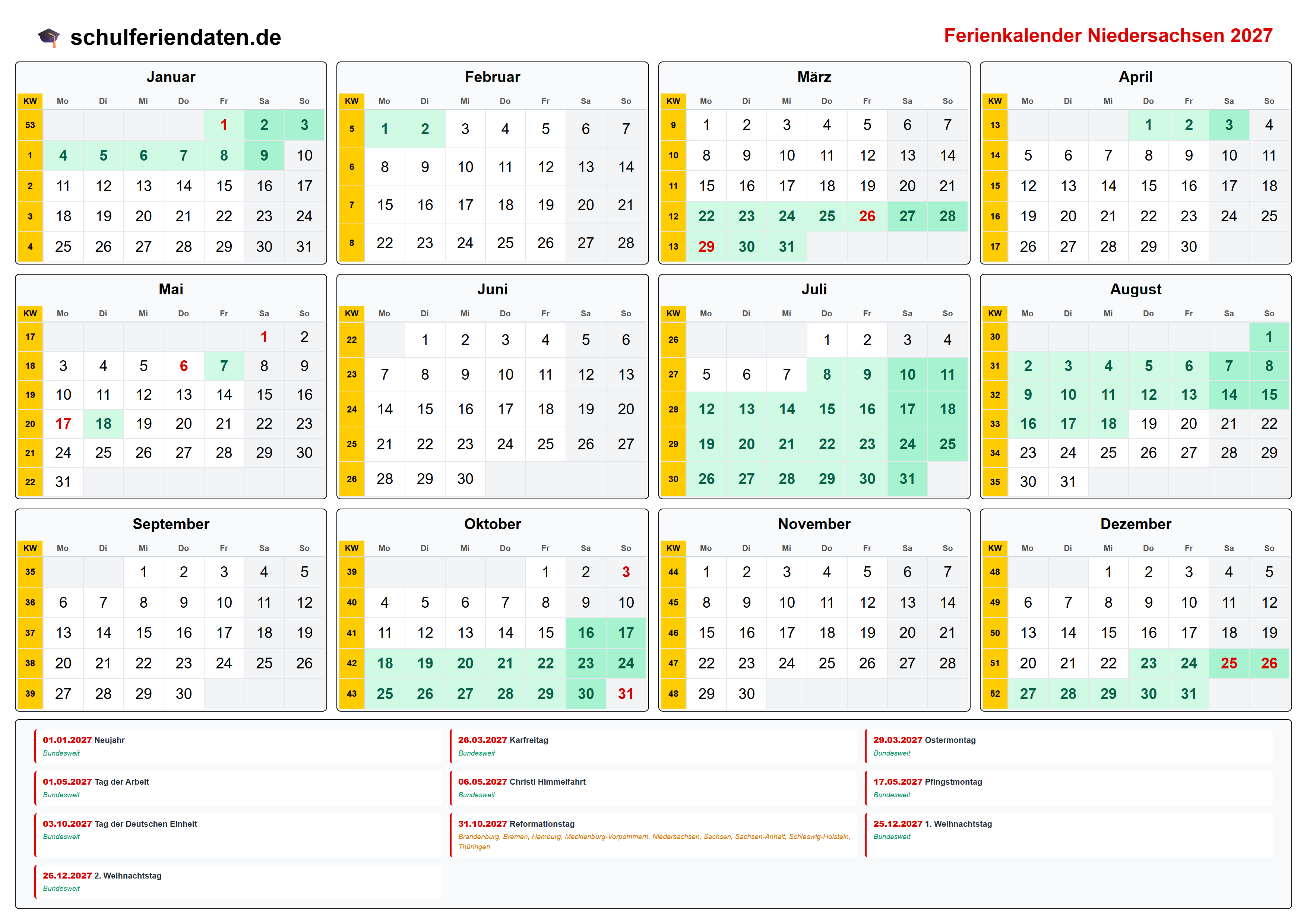 Laden Sie unseren Kalender 2027 mit den Feiertagen für Niedersachsen in den Formaten PDF oder PNG. Sie können die Kalender auch auf Ihrer Webseite einbinden oder in Ihrer Publikation abdrucken. In dem Fall muss schulferiendaten.de als Quelle angegeben bzw. verlinkt sein.