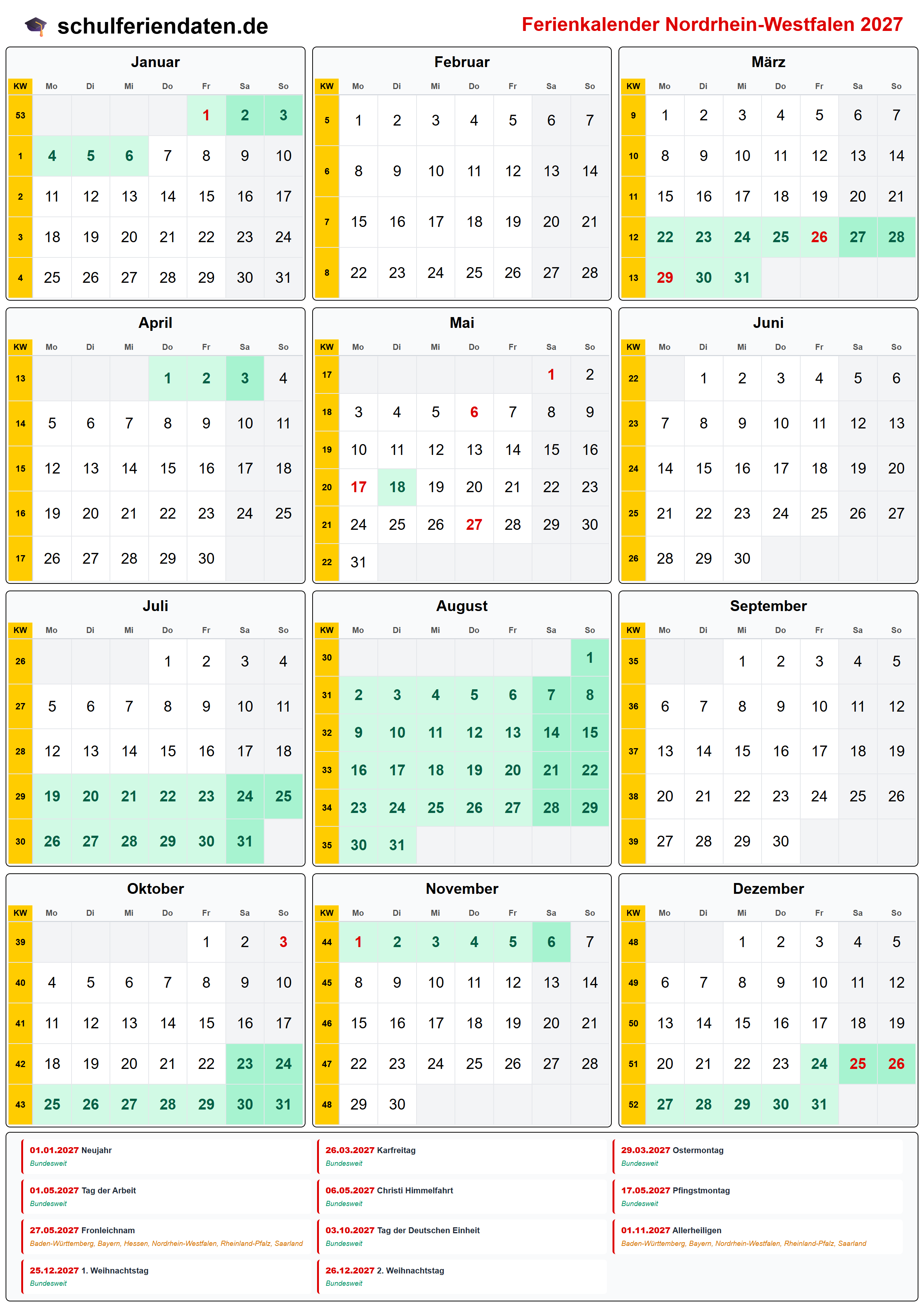 Ferienkalender für Nordrhein-Westfalen im Jahr 2027 mit allen Schulferien und gesetzlichen Feiertagen. Der Kalender zeigt alle Termine übersichtlich nach Monaten und Kalenderwochen und steht als PDF, PNG und iCal (.ics) zum Download bereit.