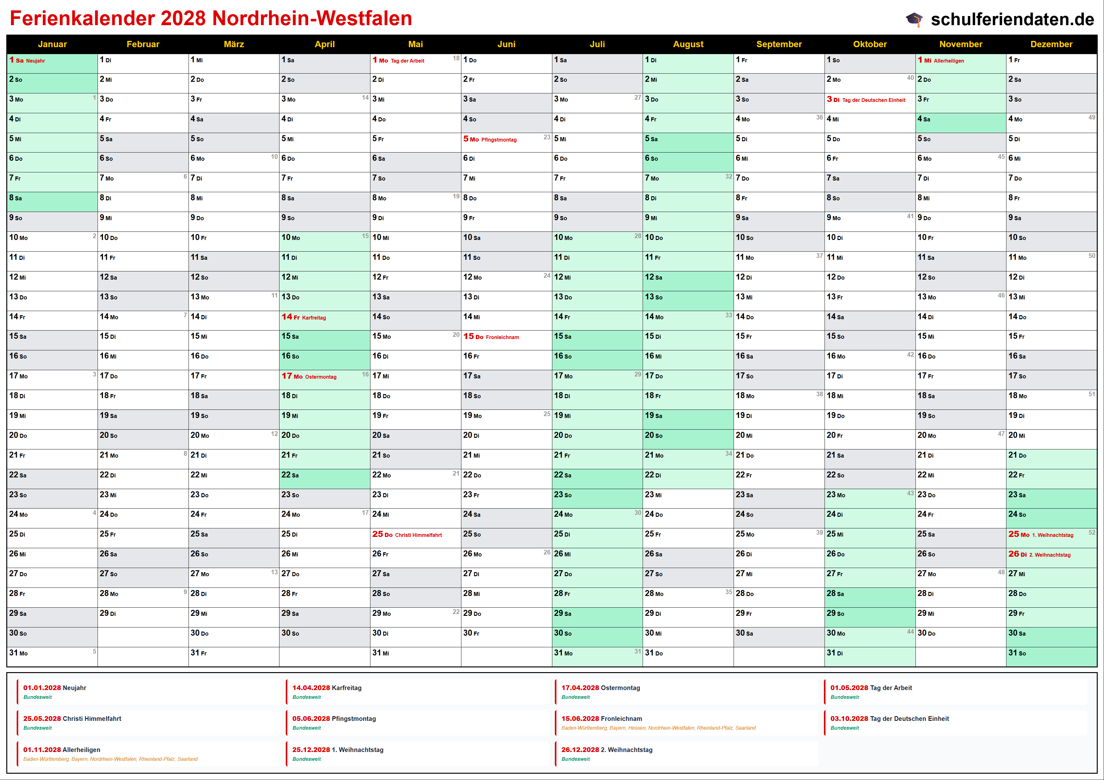 Laden Sie unseren Kalender 2028 mit den Feiertagen für Nordrhein-Westfalen in den Formaten PDF oder PNG. Sie können die Kalender auch auf Ihrer Webseite einbinden oder in Ihrer Publikation abdrucken. In dem Fall muss schulferiendaten.de als Quelle angegeben bzw. verlinkt sein.