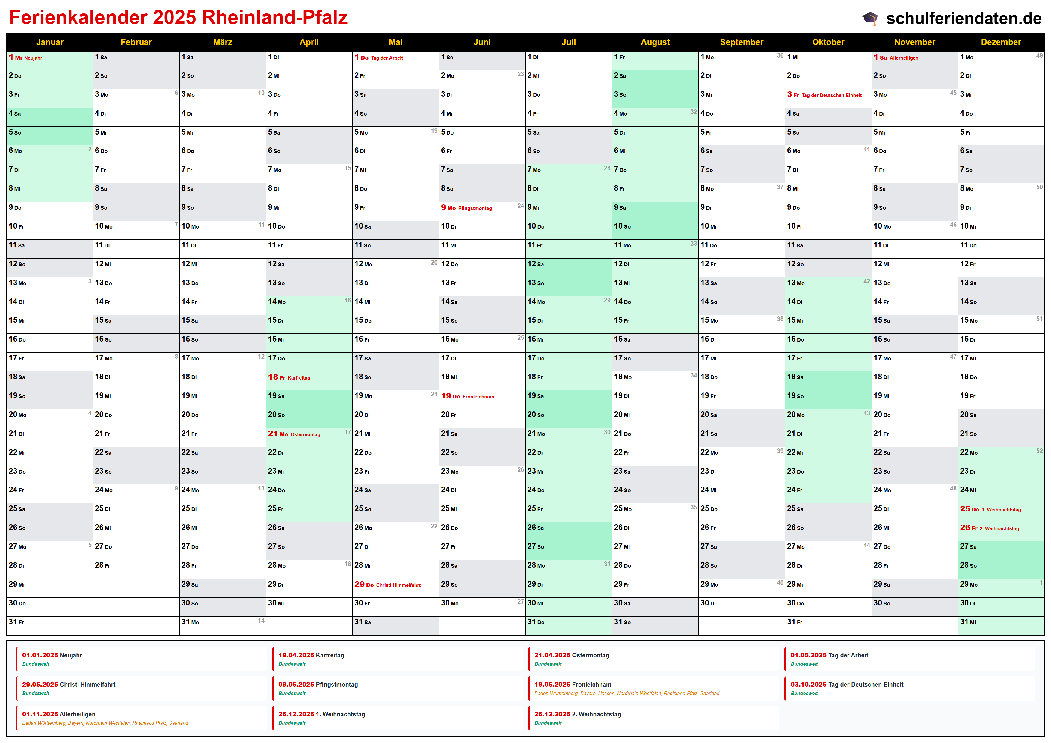 Ferienkalender für Rheinland-Pfalz im Jahr 2025 mit allen Schulferien und gesetzlichen Feiertagen. Der Kalender zeigt alle Termine übersichtlich nach Monaten und Kalenderwochen und steht als PDF, PNG und iCal (.ics) zum Download bereit.