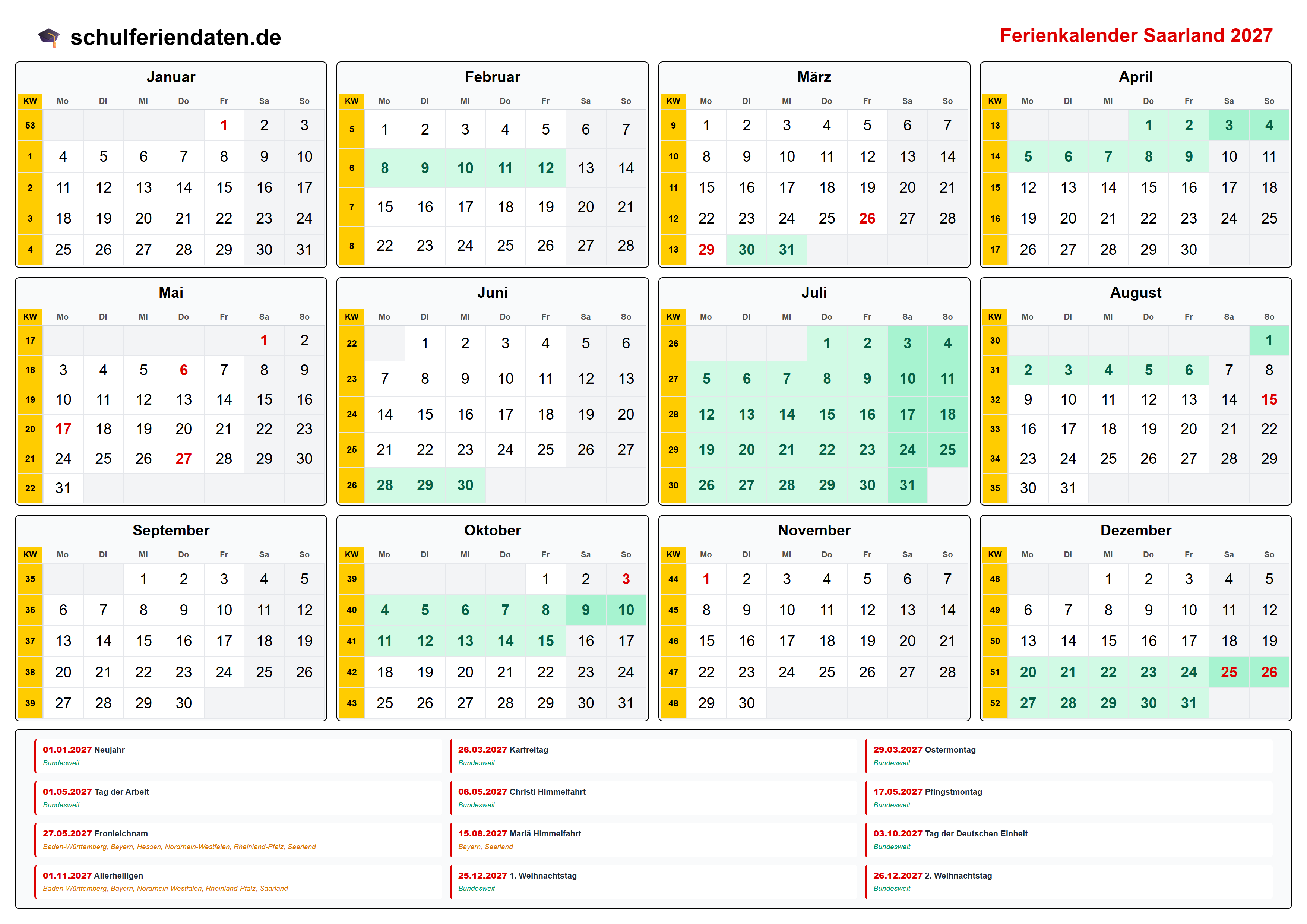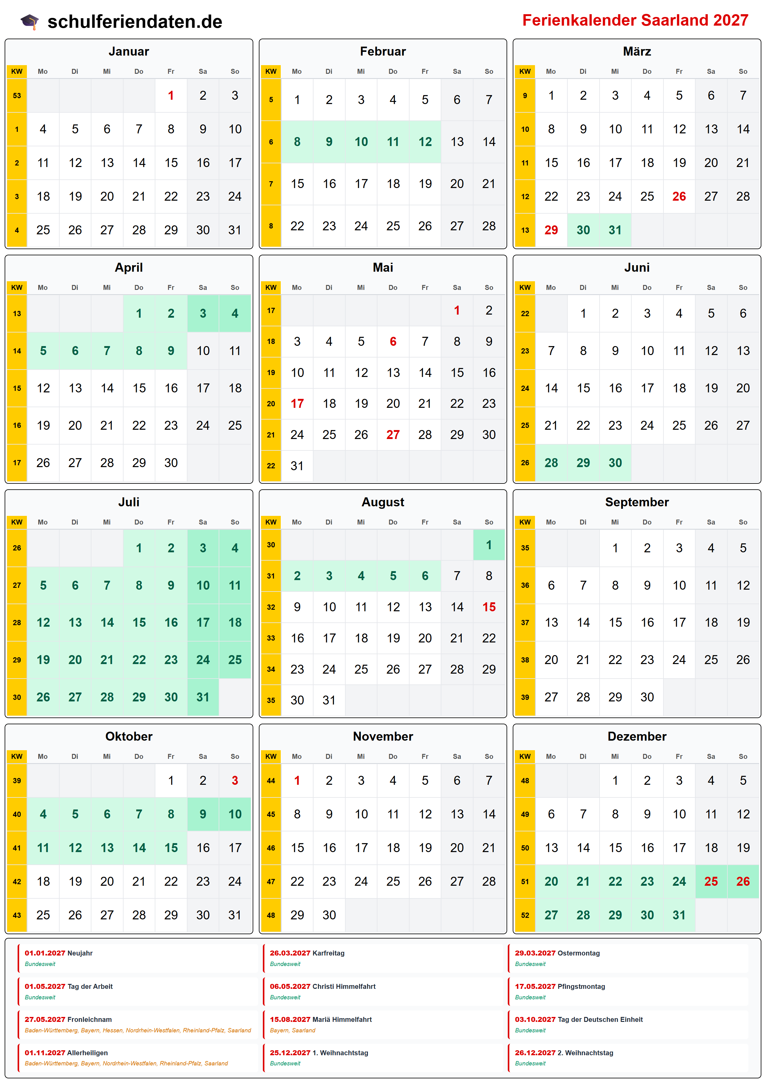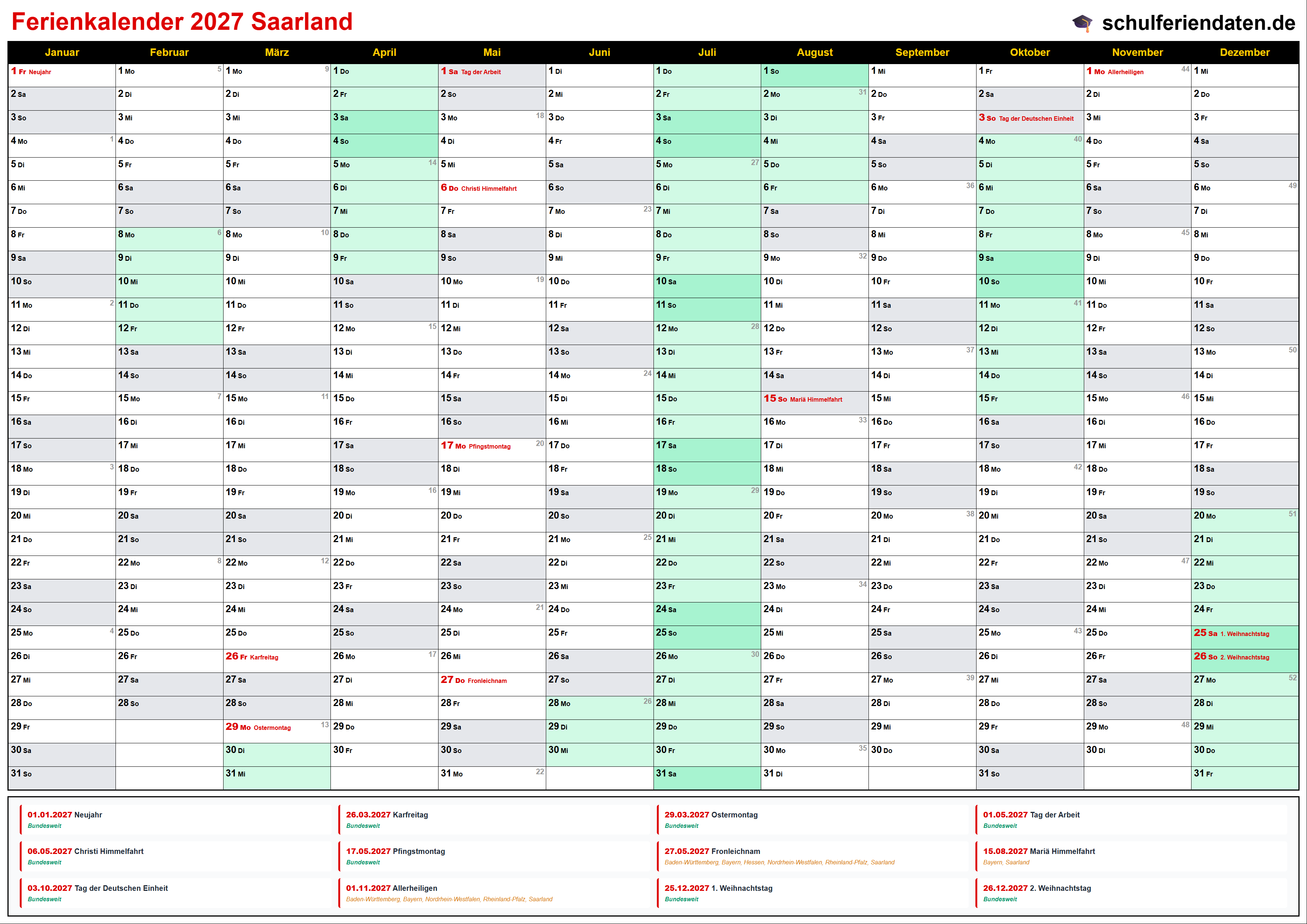 Ferienkalender für Saarland im Jahr 2027 mit allen Schulferien und gesetzlichen Feiertagen. Der Kalender zeigt alle Termine übersichtlich nach Monaten und Kalenderwochen und steht als PDF, PNG und iCal (.ics) zum Download bereit.