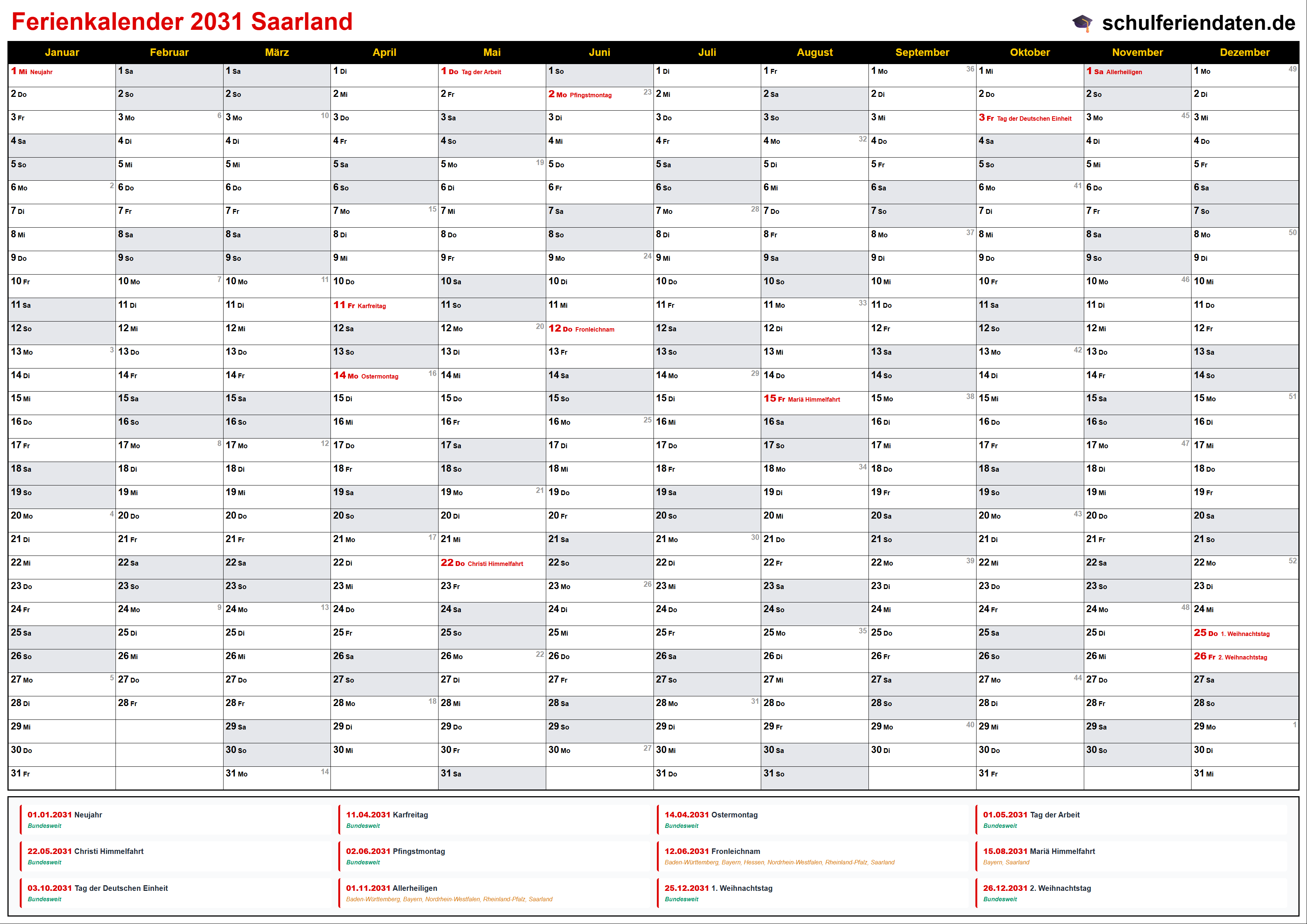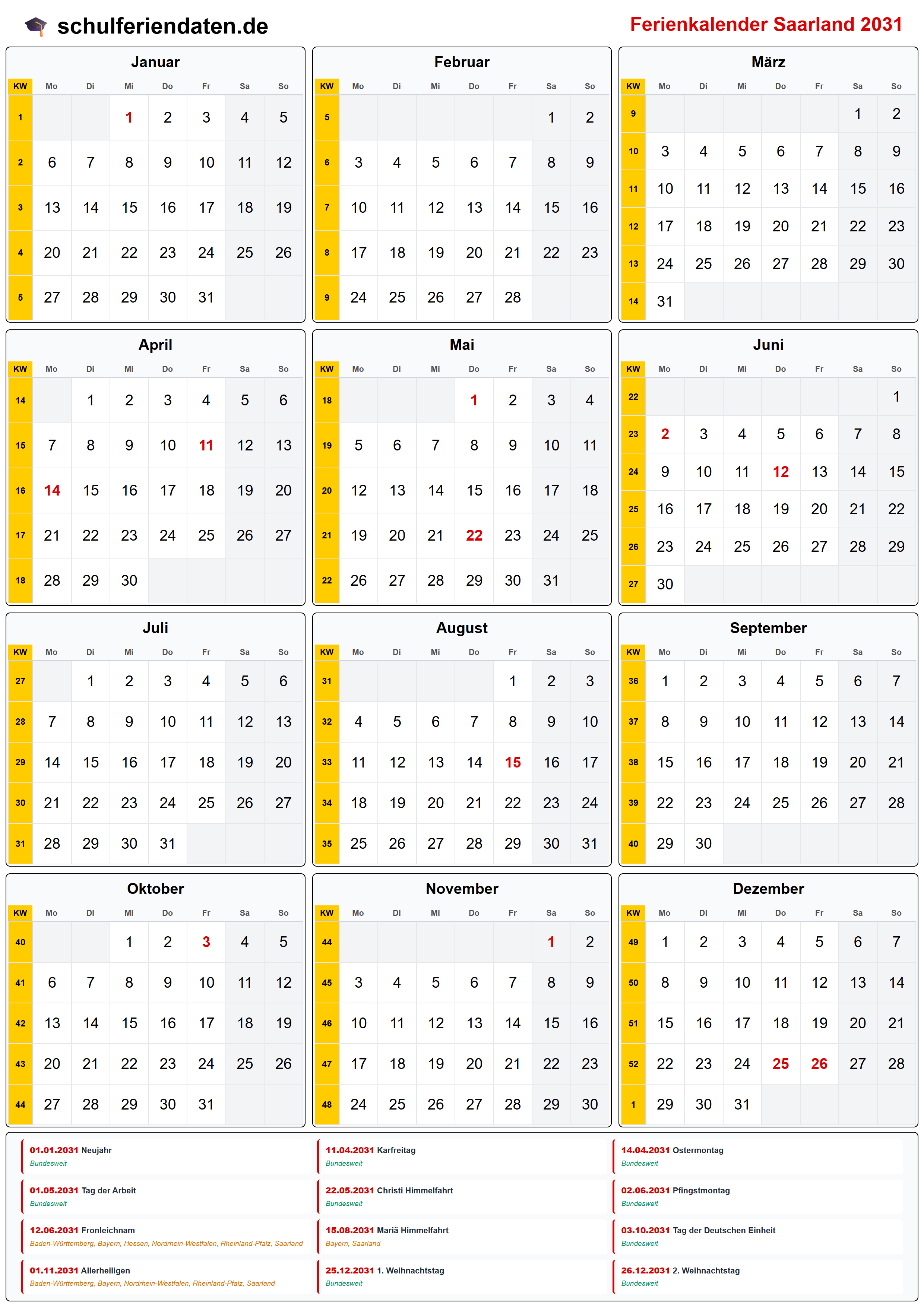 Ferienkalender für Saarland im Jahr 2031 mit allen Schulferien und gesetzlichen Feiertagen. Der Kalender zeigt alle Termine übersichtlich nach Monaten und Kalenderwochen und steht als PDF, PNG und iCal (.ics) zum Download bereit.