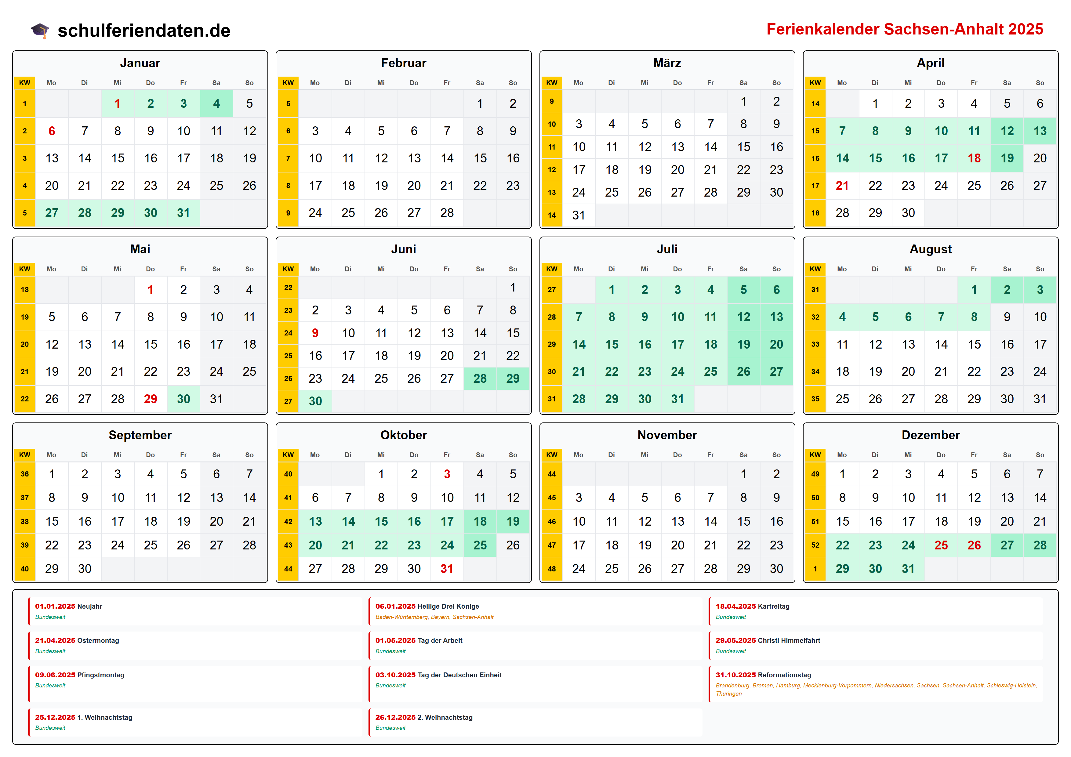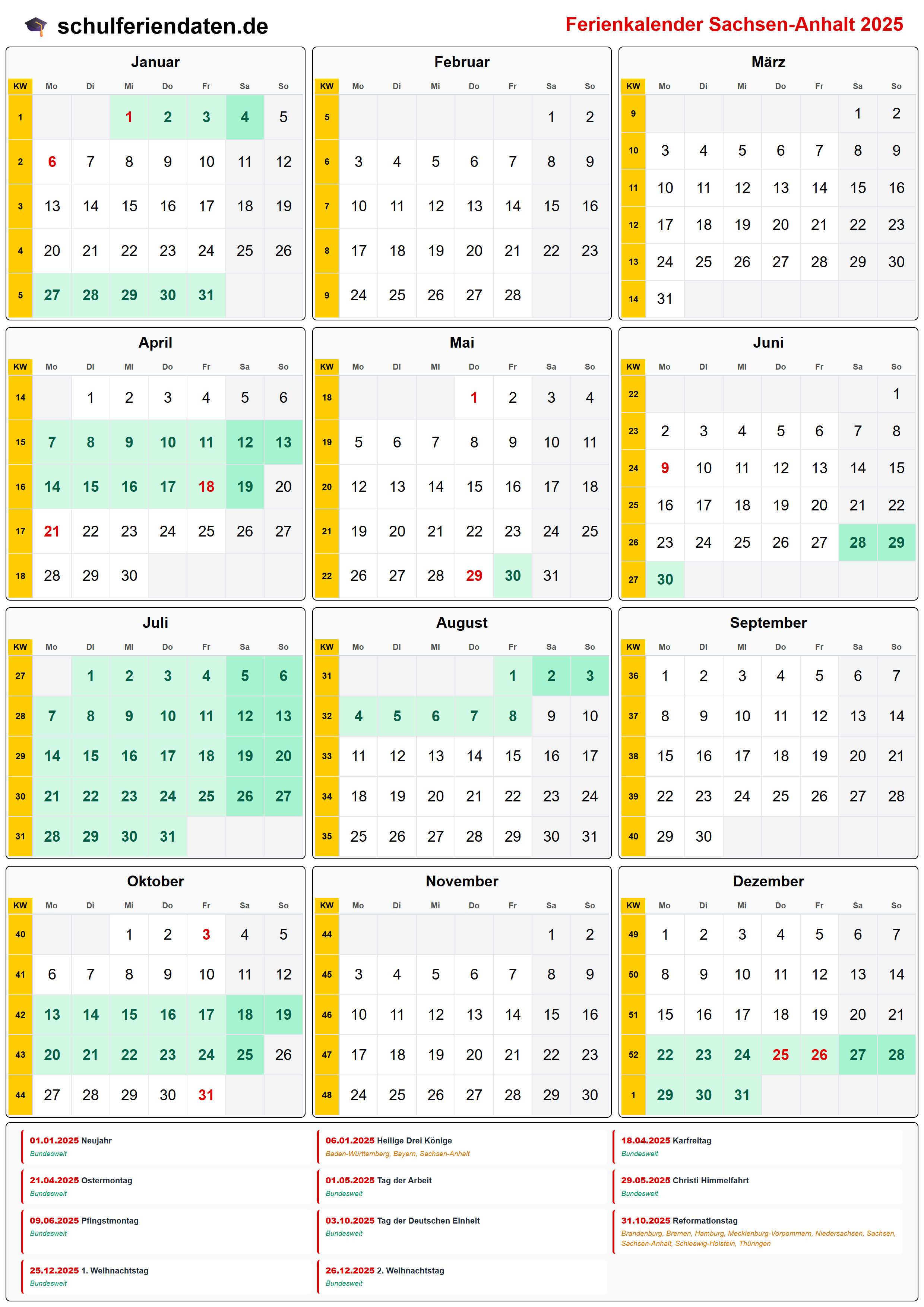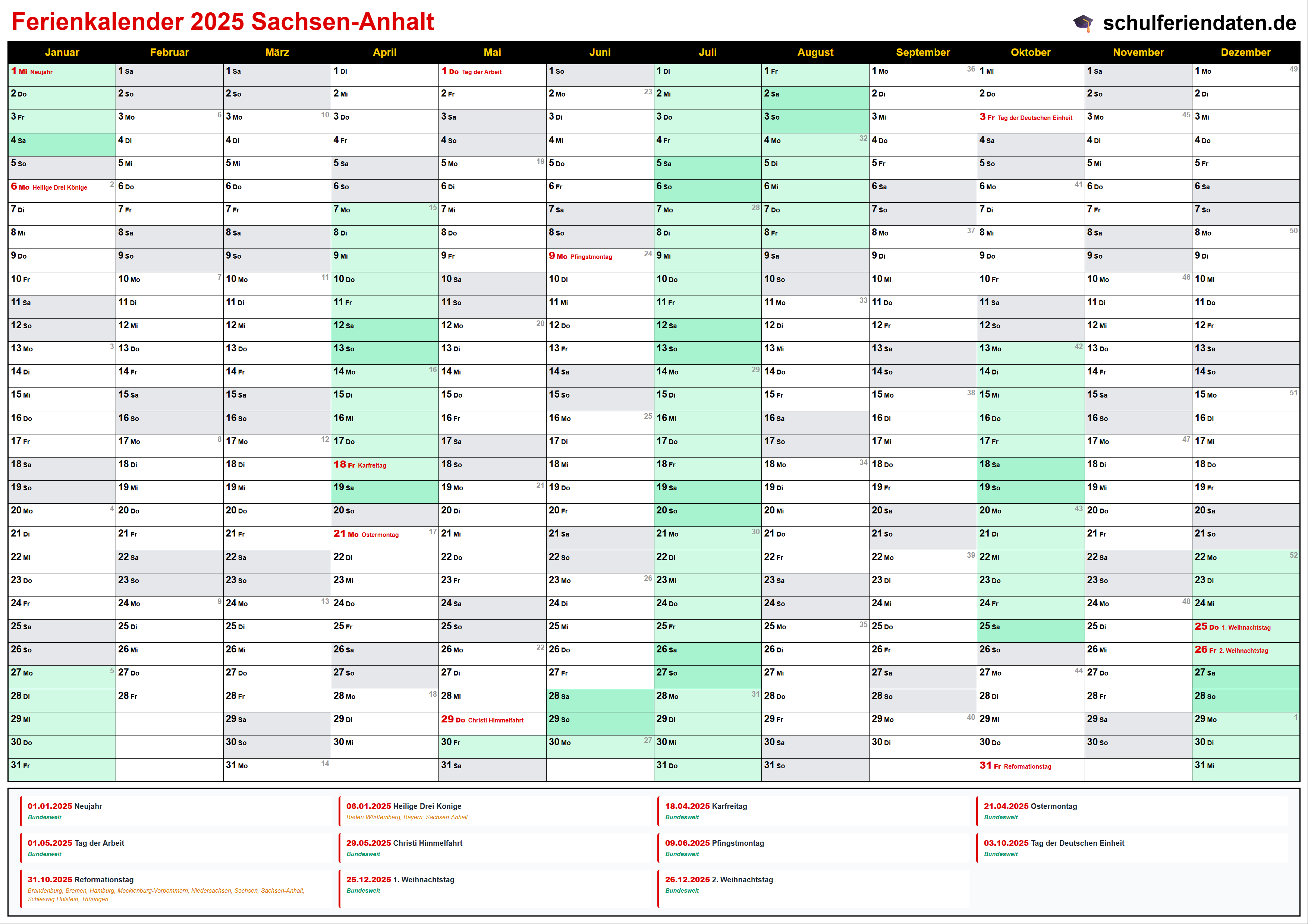 Hier finden Sie alle Schulferien 2025 in Sachsen-Anhalt – übersichtlich im Kalender mit Kalenderwochen (KW) und markierten Feiertagen.