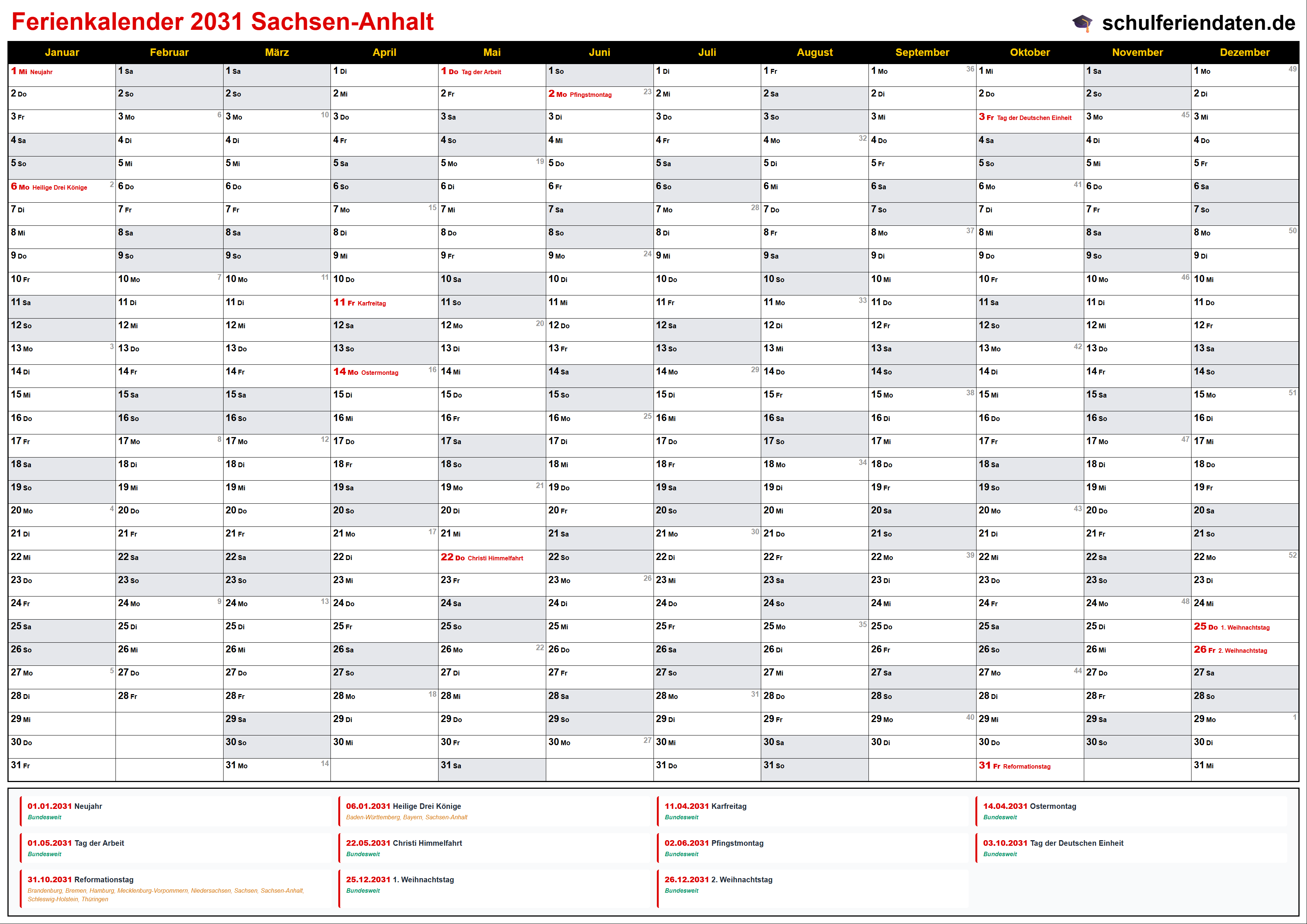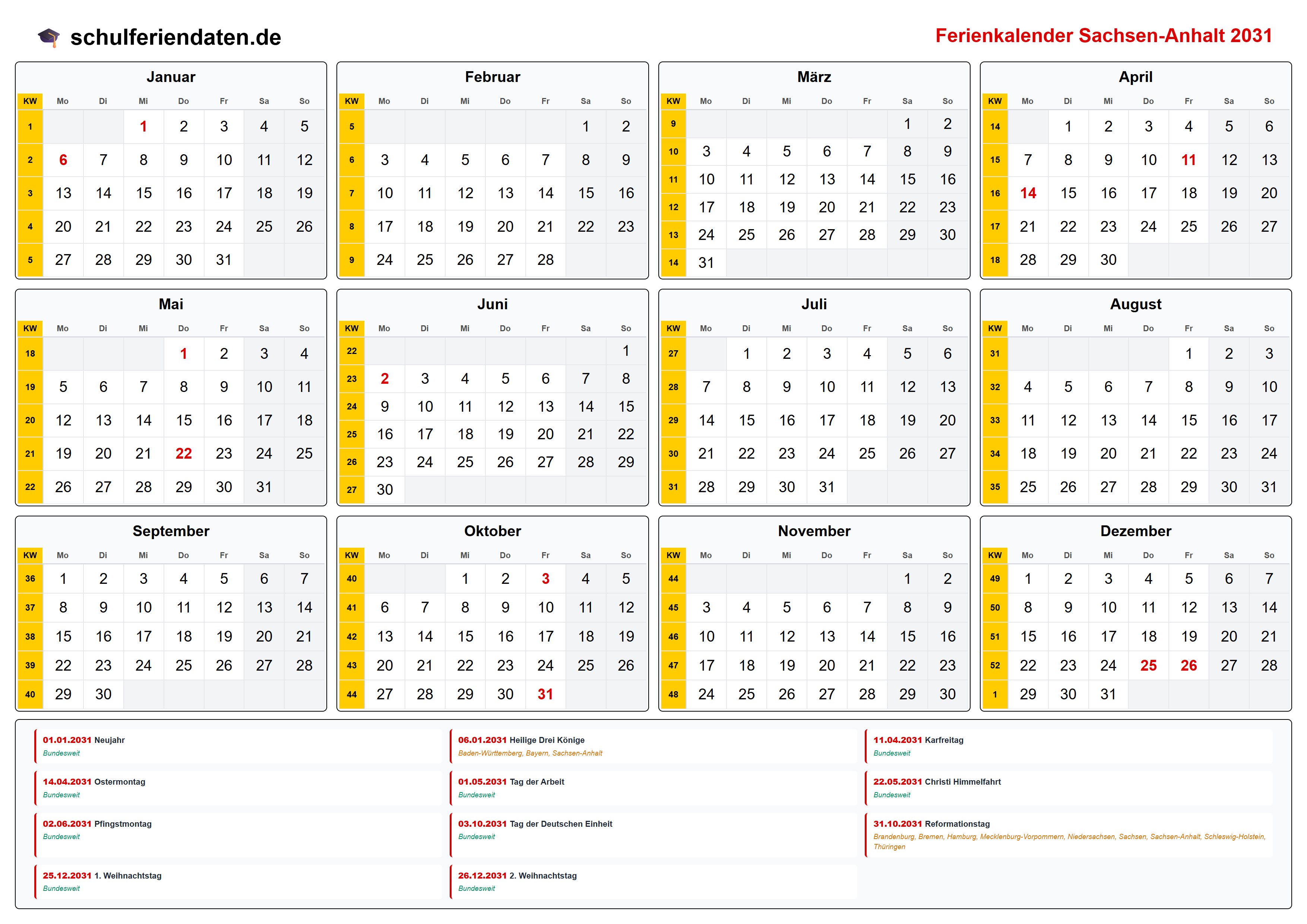 Hier finden Sie alle Schulferien 2031 in Sachsen-Anhalt – übersichtlich im Kalender mit Kalenderwochen (KW) und markierten Feiertagen.