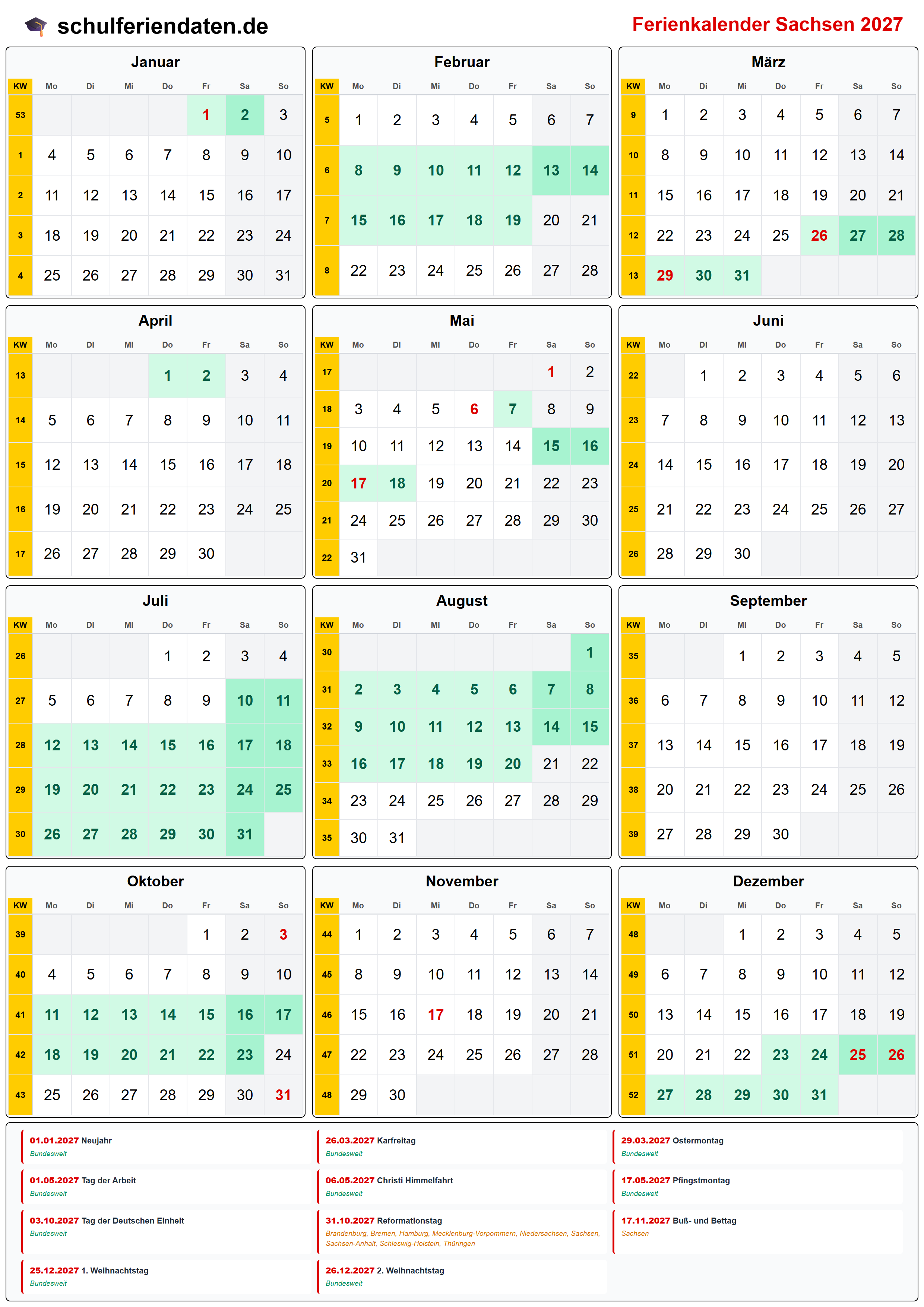 Ferienkalender für Sachsen im Jahr 2027 mit allen Schulferien und gesetzlichen Feiertagen. Der Kalender zeigt alle Termine übersichtlich nach Monaten und Kalenderwochen und steht als PDF, PNG und iCal (.ics) zum Download bereit.