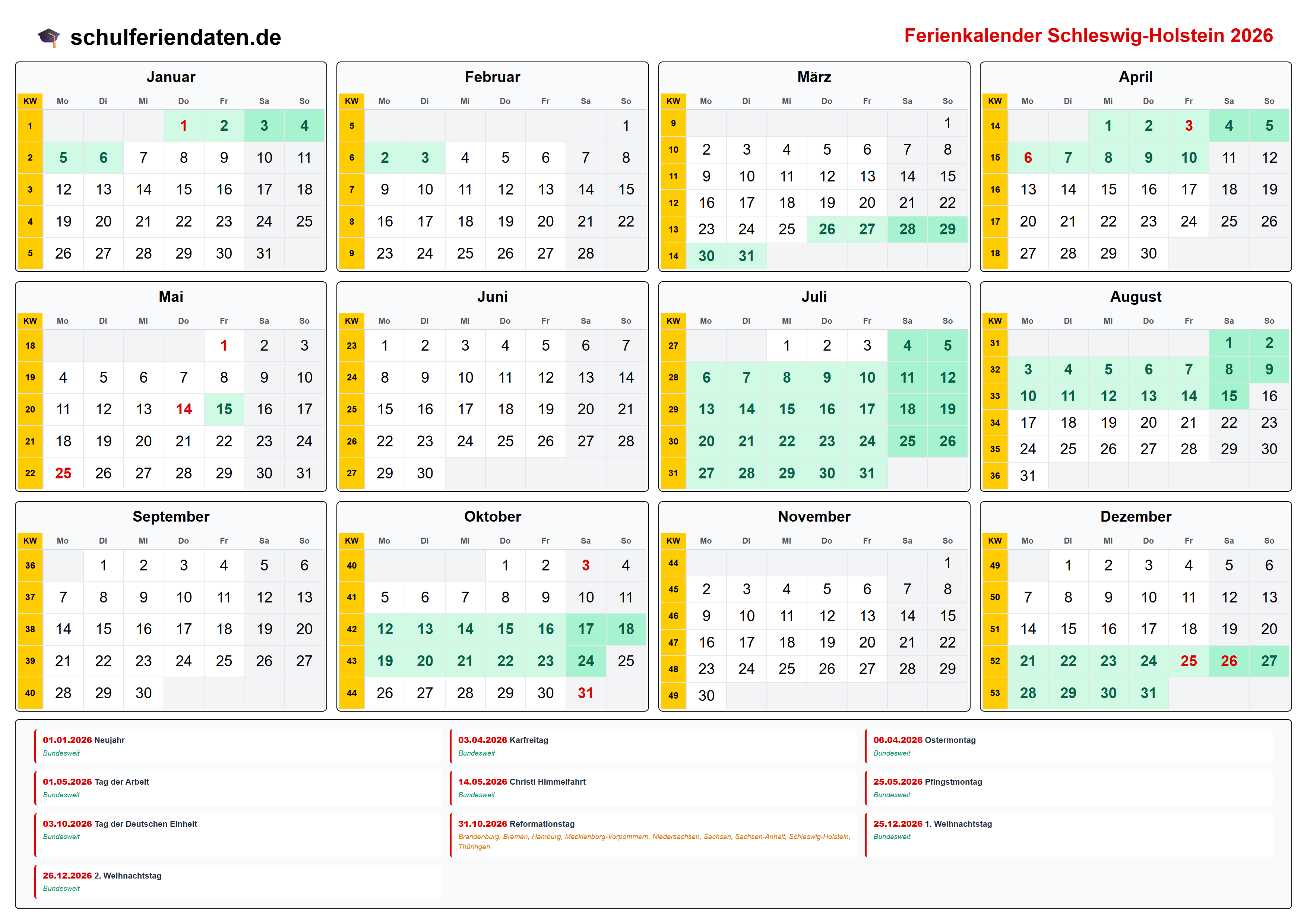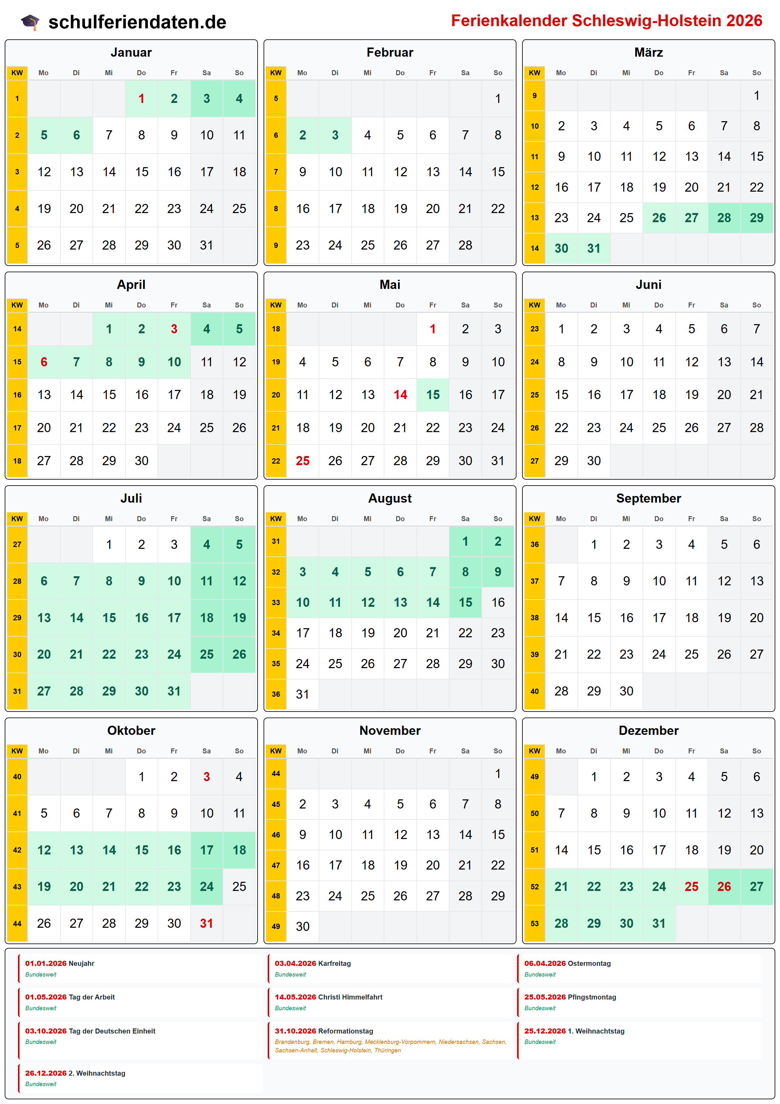 Ferienkalender für Schleswig-Holstein im Jahr 2026 mit allen Schulferien und gesetzlichen Feiertagen. Der Kalender zeigt alle Termine übersichtlich nach Monaten und Kalenderwochen und steht als PDF, PNG und iCal (.ics) zum Download bereit.