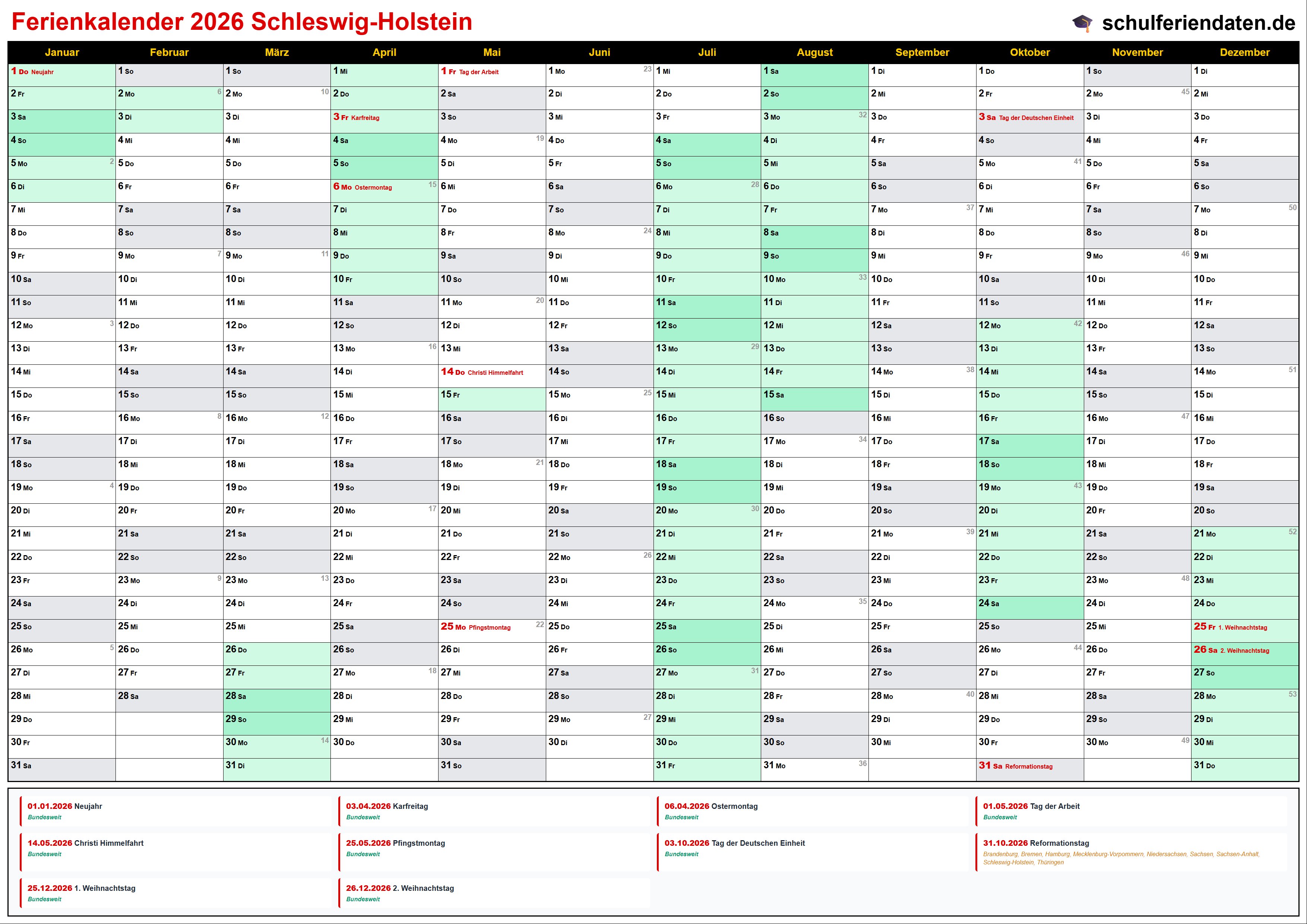 Hier finden Sie alle Schulferien 2026 in Schleswig-Holstein – übersichtlich im Kalender mit Kalenderwochen (KW) und markierten Feiertagen.