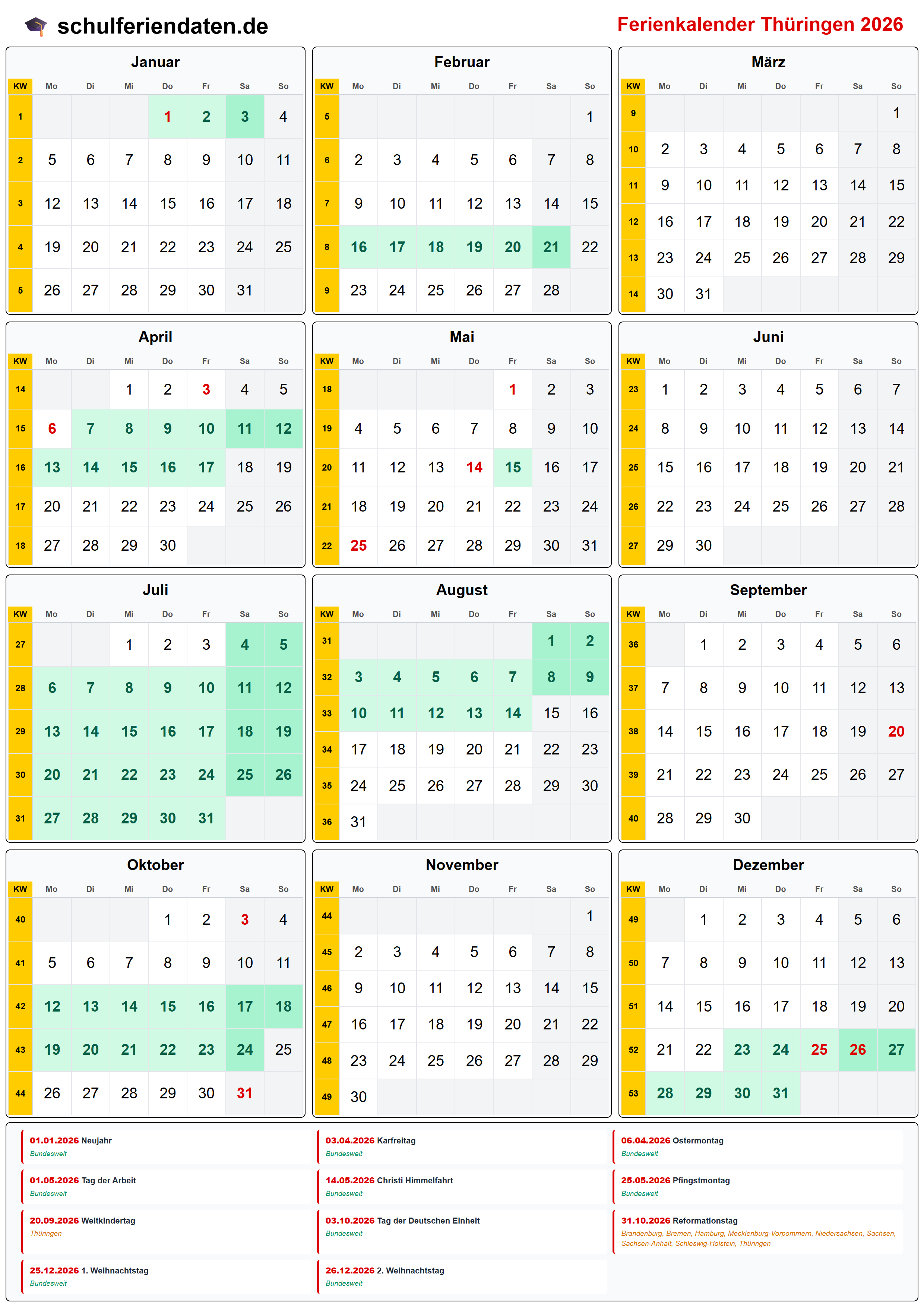 Ferienkalender für Thüringen im Jahr 2026 mit allen Schulferien und gesetzlichen Feiertagen. Der Kalender zeigt alle Termine übersichtlich nach Monaten und Kalenderwochen und steht als PDF, PNG und iCal (.ics) zum Download bereit.
