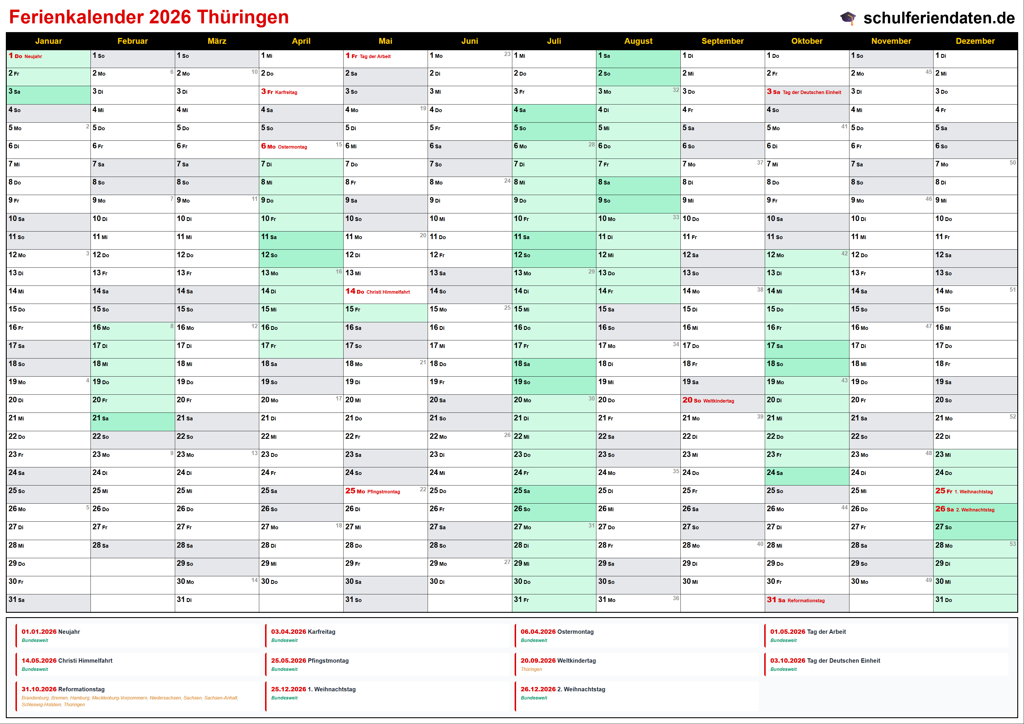 Laden Sie unseren Kalender 2026 mit den Feiertagen für Thüringen in den Formaten PDF oder PNG. Sie können die Kalender auch auf Ihrer Webseite einbinden oder in Ihrer Publikation abdrucken. In dem Fall muss schulferiendaten.de als Quelle angegeben bzw. verlinkt sein.