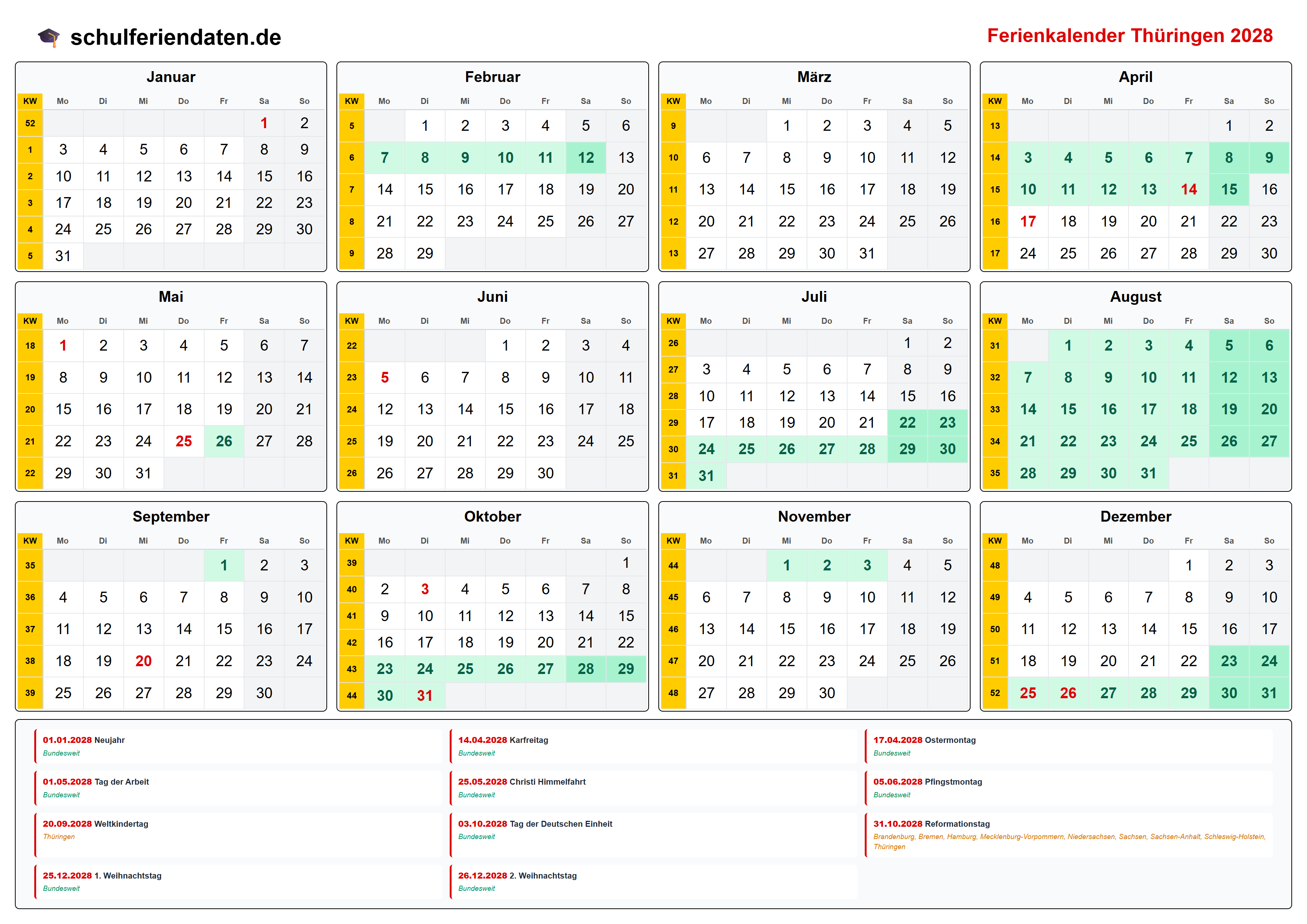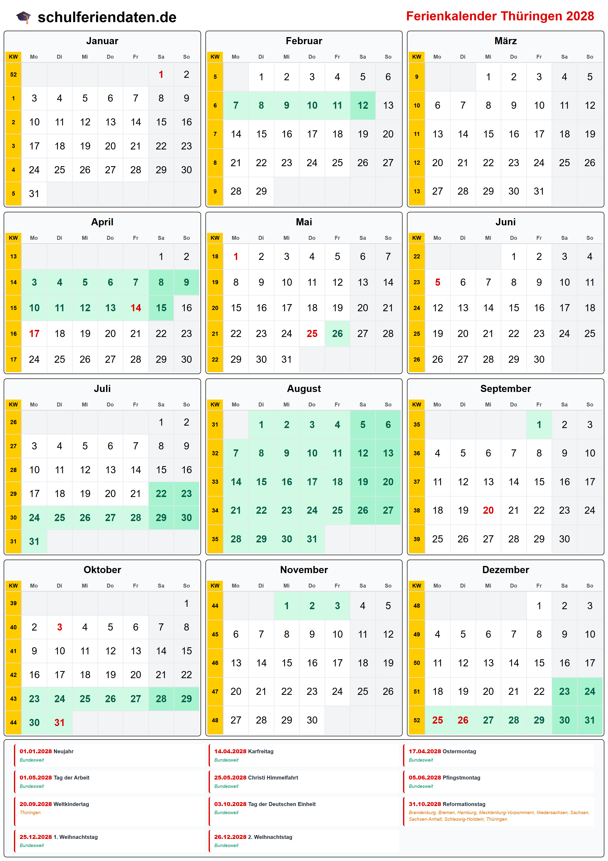 Laden Sie unseren Kalender 2028 mit den Feiertagen für Thüringen in den Formaten PDF oder PNG. Sie können die Kalender auch auf Ihrer Webseite einbinden oder in Ihrer Publikation abdrucken. In dem Fall muss schulferiendaten.de als Quelle angegeben bzw. verlinkt sein.