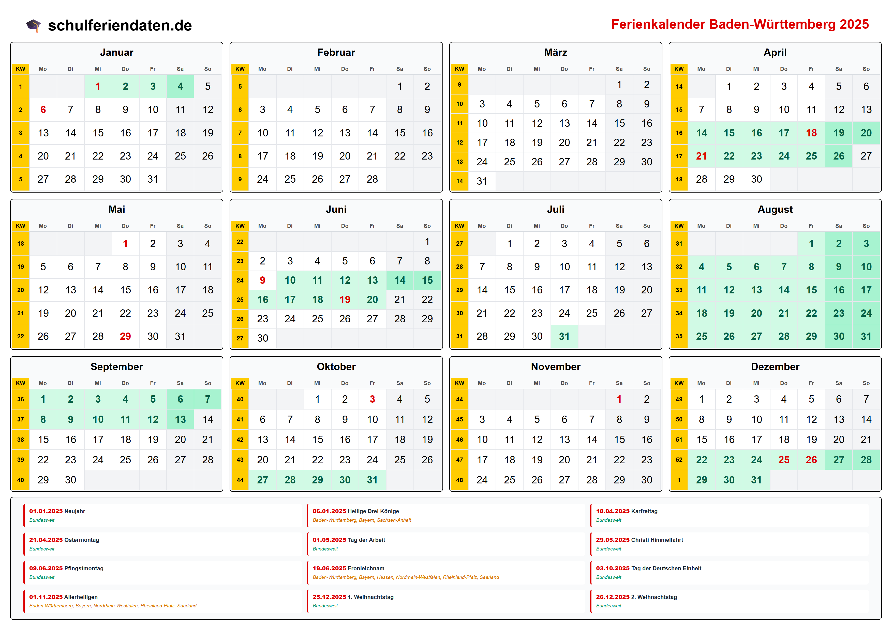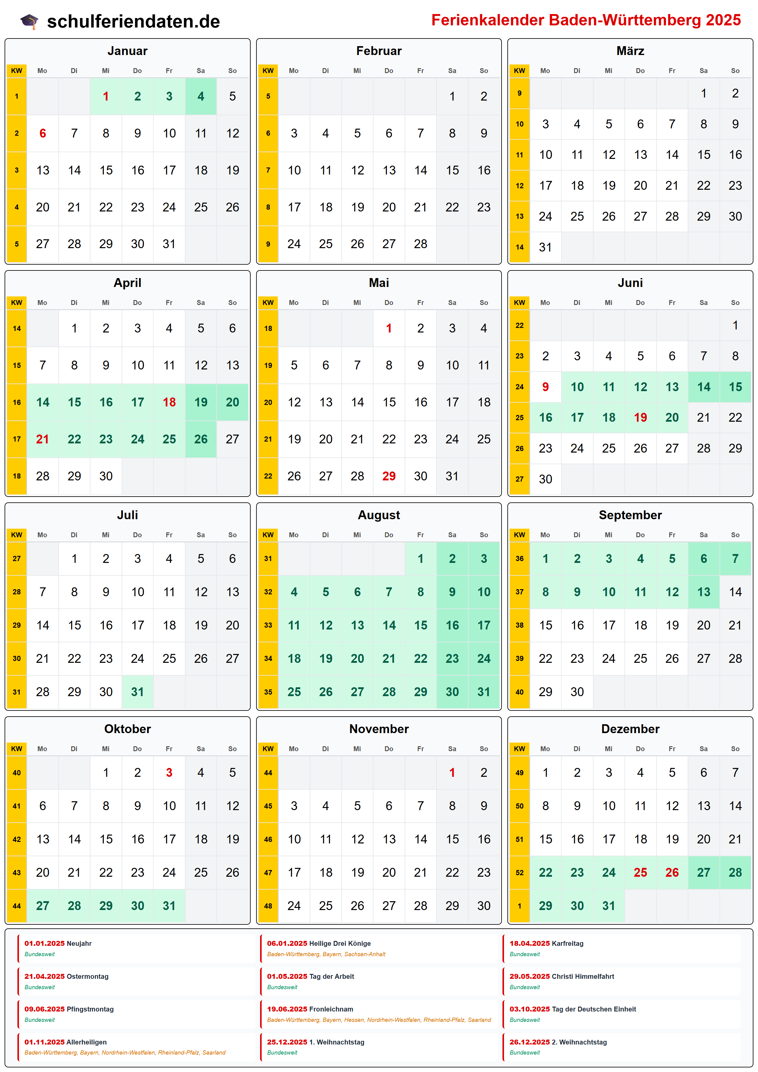 Hier finden Sie alle Schulferien 2025 in Baden-Württemberg – übersichtlich im Kalender mit Kalenderwochen (KW) und markierten Feiertagen.