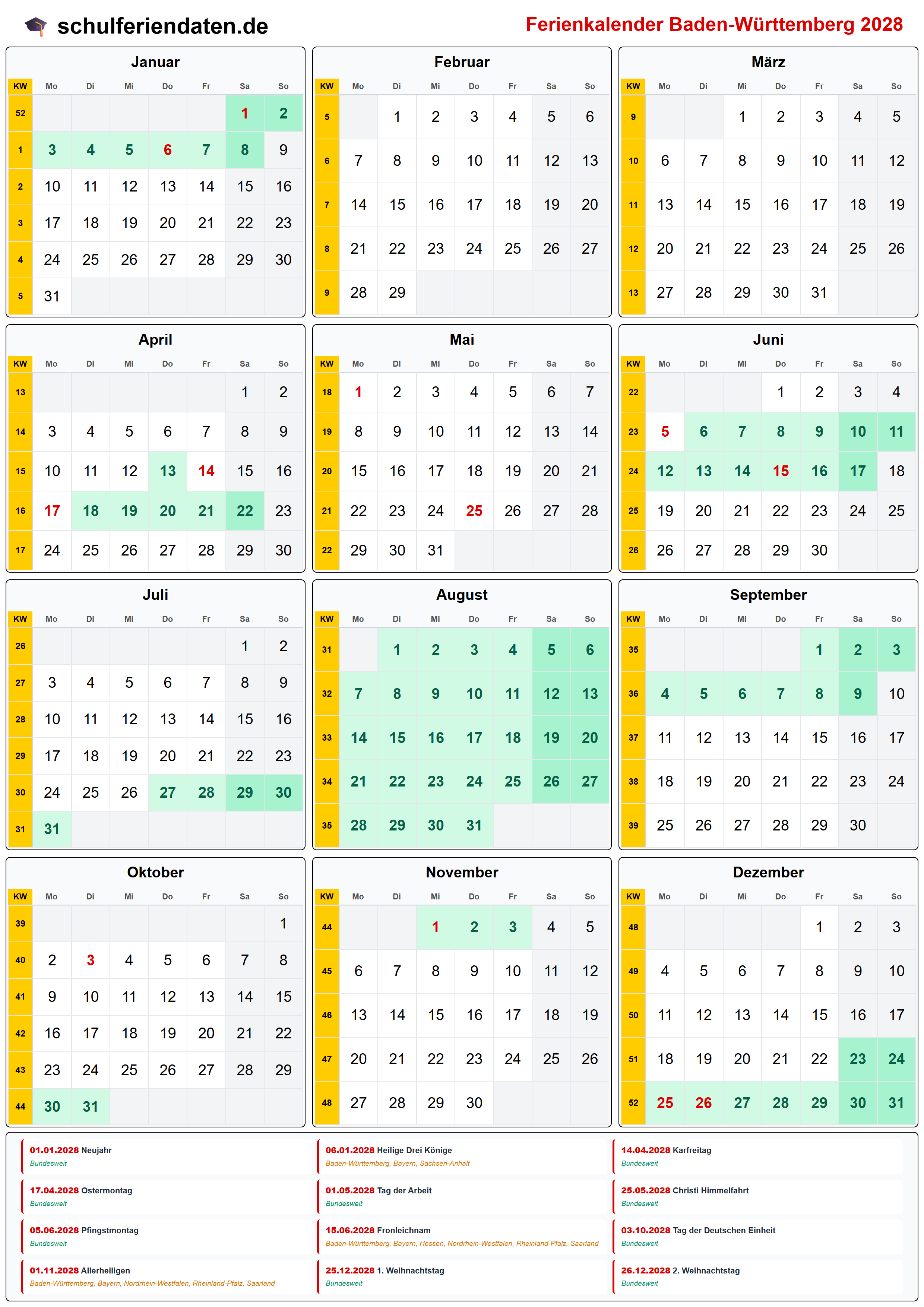 Ferienkalender für Baden-Württemberg im Jahr 2028 mit allen Schulferien und gesetzlichen Feiertagen. Der Kalender zeigt alle Termine übersichtlich nach Monaten und Kalenderwochen und steht als PDF, PNG und iCal (.ics) zum Download bereit.