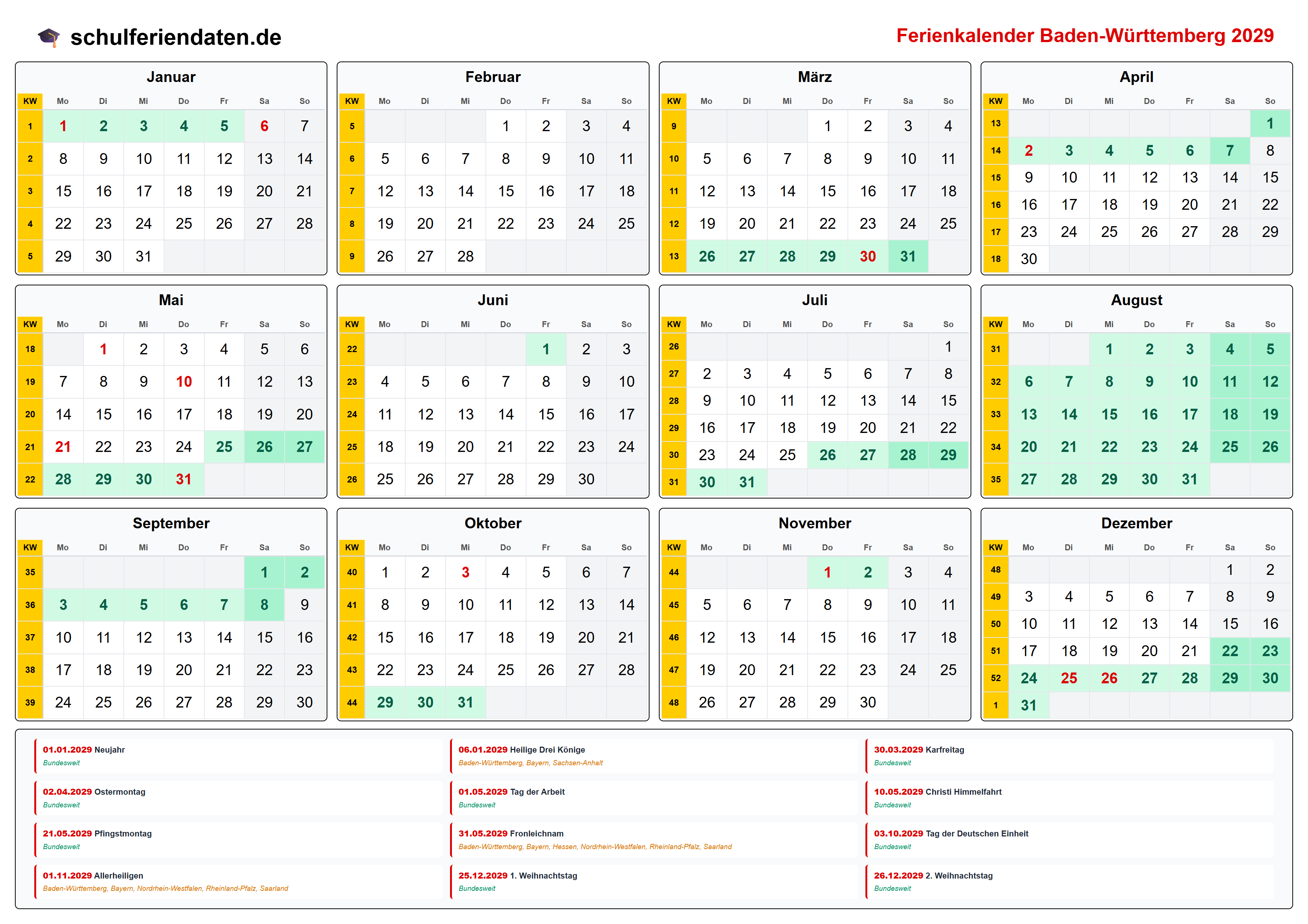 Laden Sie unseren Kalender 2029 mit den Feiertagen für Baden-Württemberg in den Formaten PDF oder PNG. Sie können die Kalender auch auf Ihrer Webseite einbinden oder in Ihrer Publikation abdrucken. In dem Fall muss schulferiendaten.de als Quelle angegeben bzw. verlinkt sein.