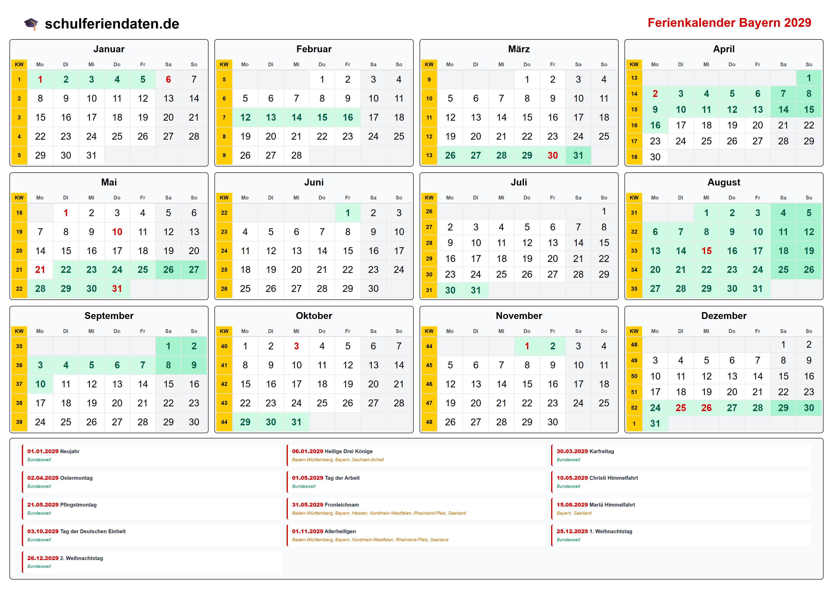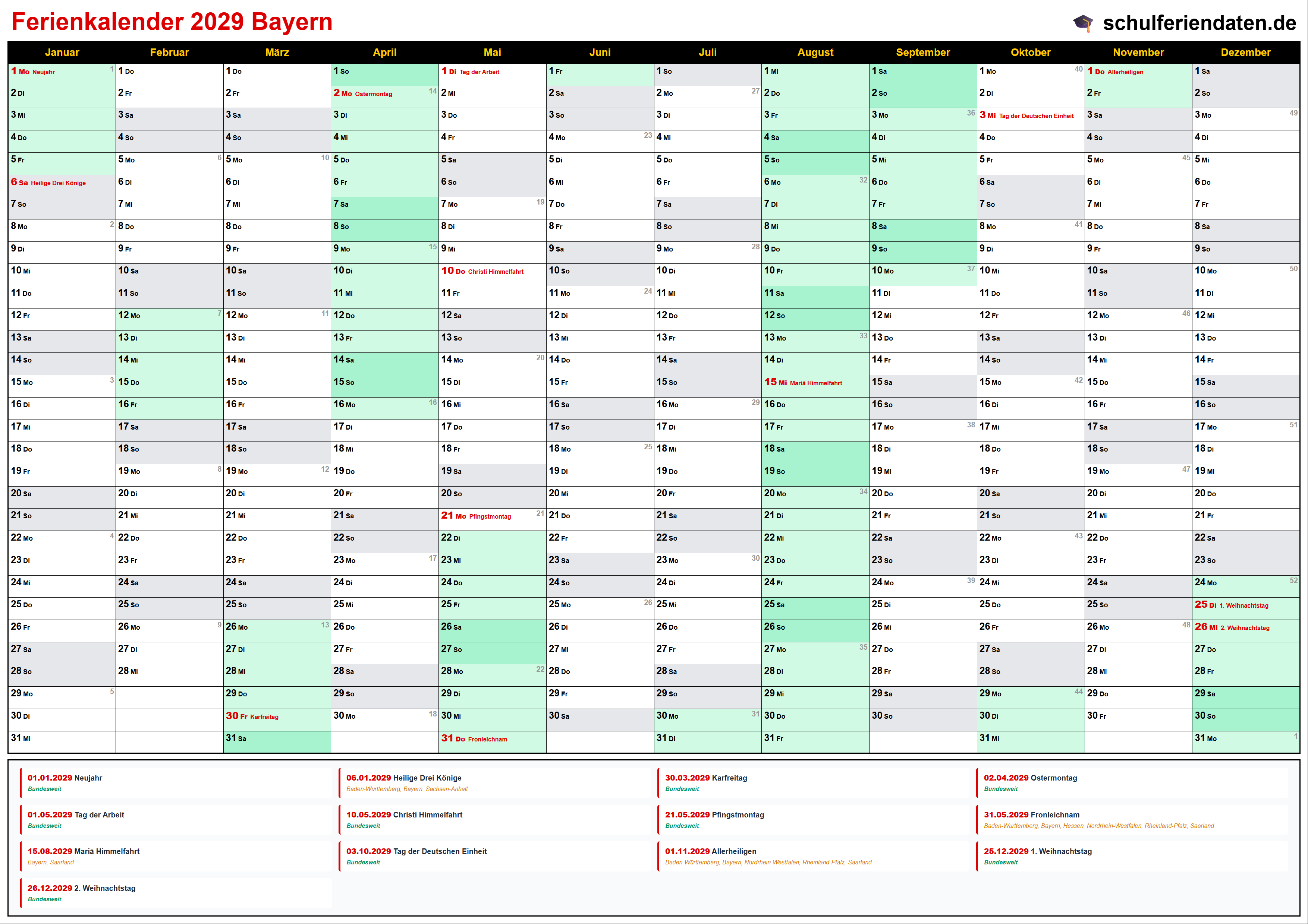 Ferienkalender für Bayern im Jahr 2029 mit allen Schulferien und gesetzlichen Feiertagen. Der Kalender zeigt alle Termine übersichtlich nach Monaten und Kalenderwochen und steht als PDF, PNG und iCal (.ics) zum Download bereit.