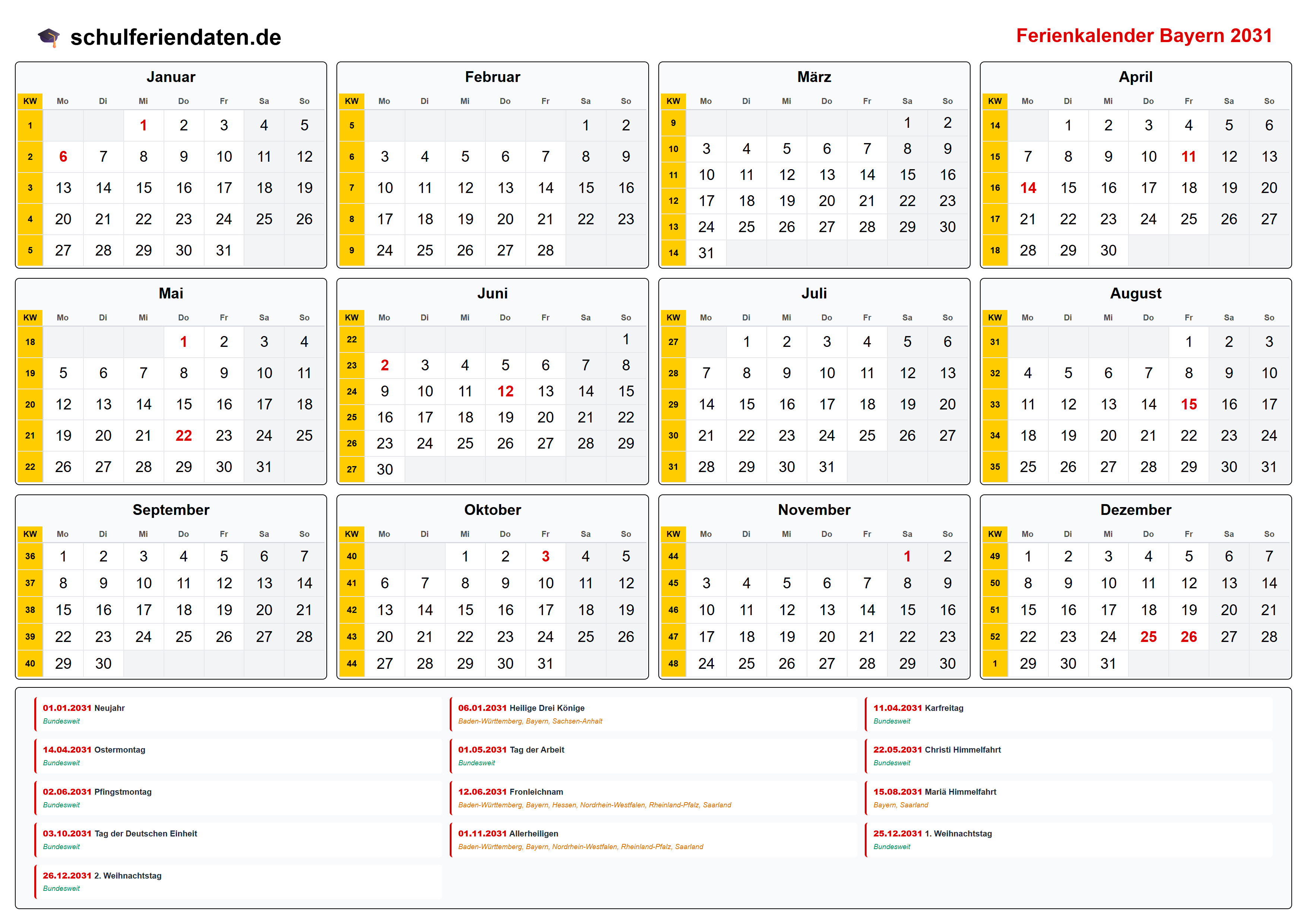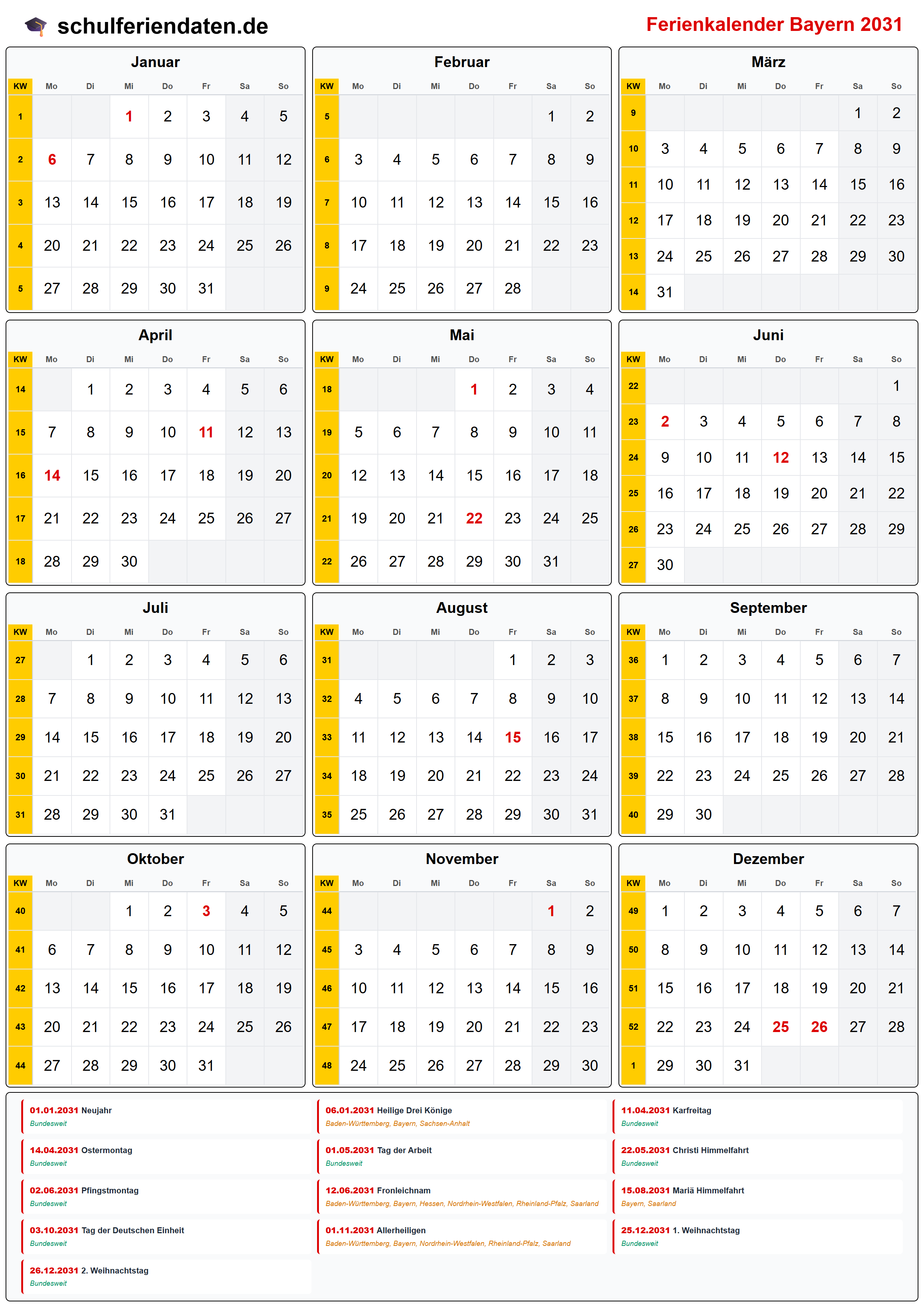 Ferienkalender für Bayern im Jahr 2031 mit allen Schulferien und gesetzlichen Feiertagen. Der Kalender zeigt alle Termine übersichtlich nach Monaten und Kalenderwochen und steht als PDF, PNG und iCal (.ics) zum Download bereit.