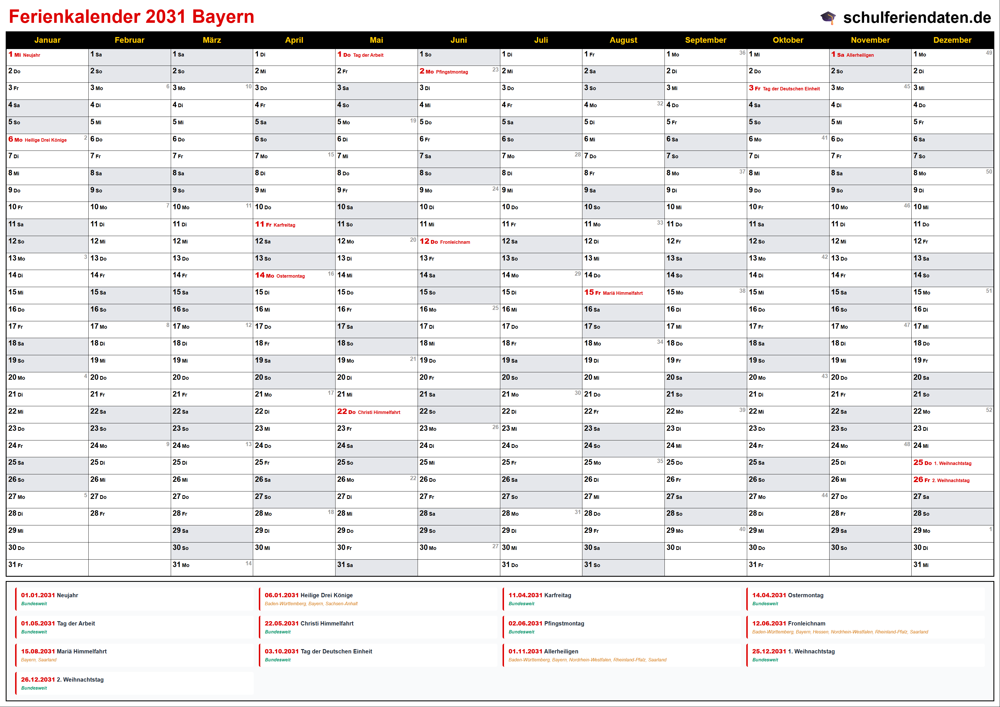 Laden Sie unseren Kalender 2031 mit den Feiertagen für Bayern in den Formaten PDF oder PNG. Sie können die Kalender auch auf Ihrer Webseite einbinden oder in Ihrer Publikation abdrucken. In dem Fall muss schulferiendaten.de als Quelle angegeben bzw. verlinkt sein.