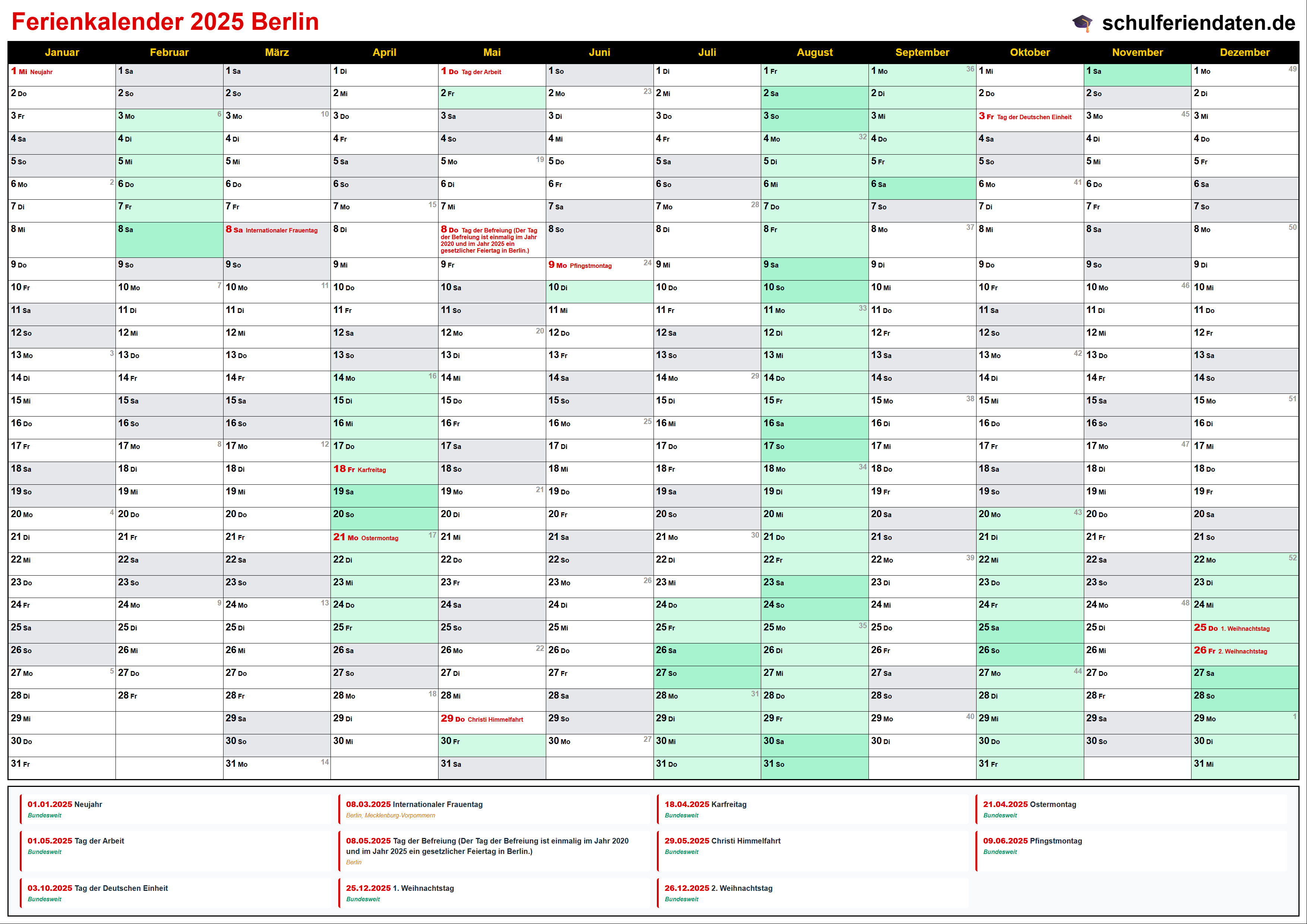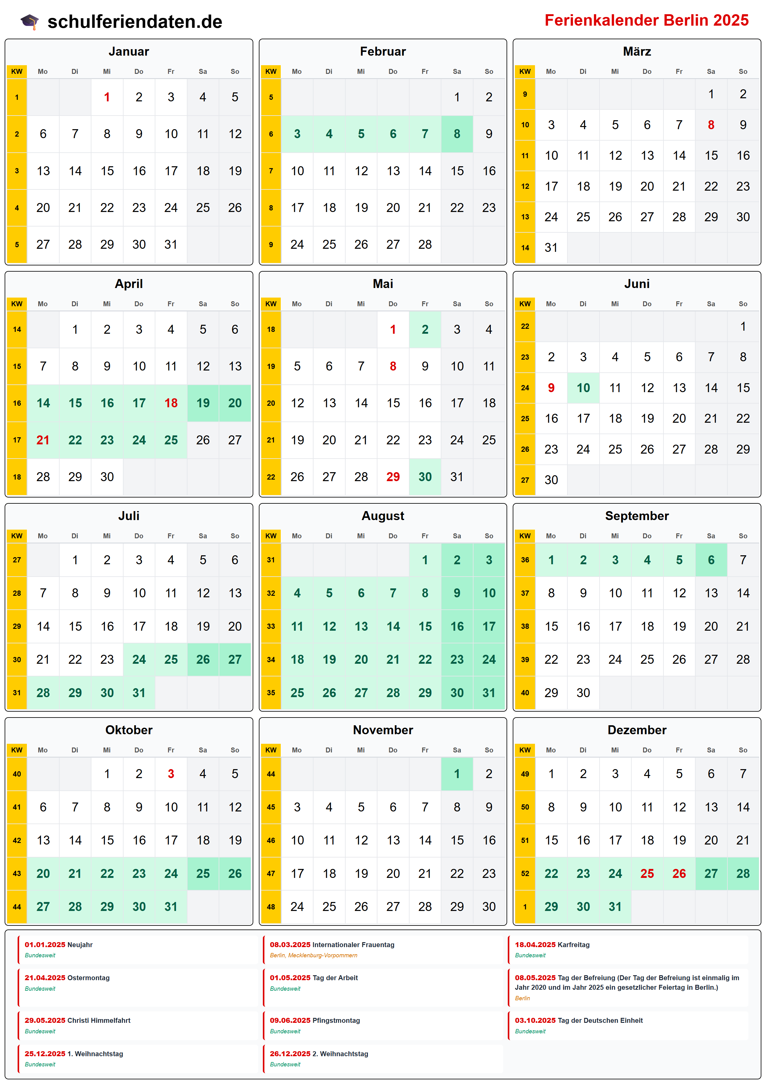 Hier finden Sie alle Schulferien 2025 in Berlin – übersichtlich im Kalender mit Kalenderwochen (KW) und markierten Feiertagen.