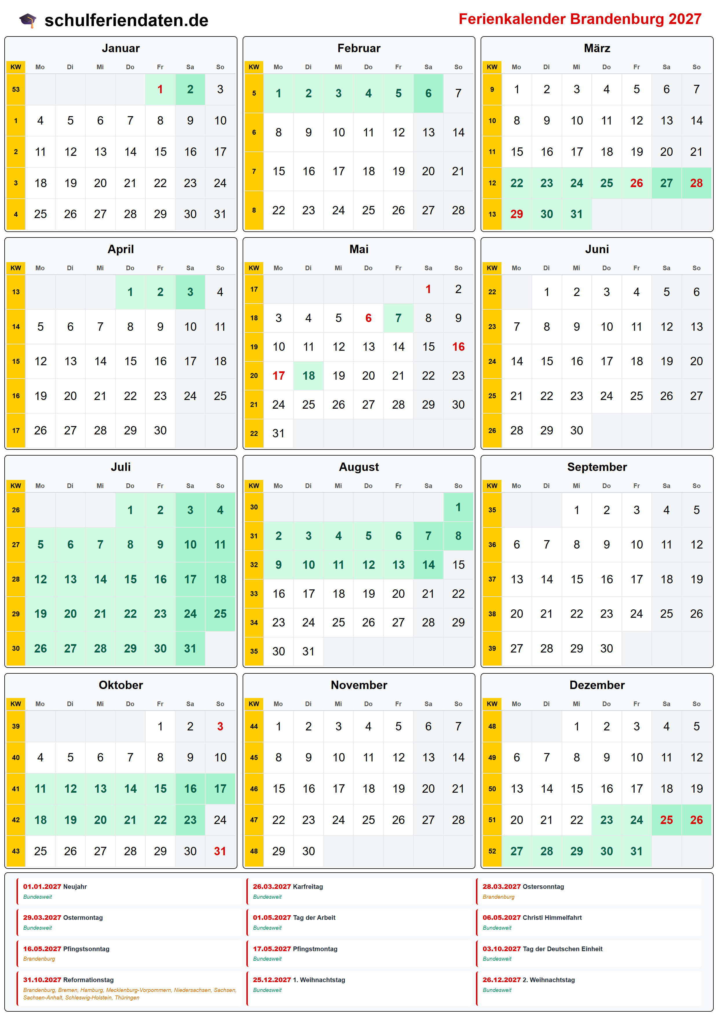 Ferienkalender für Brandenburg im Jahr 2027 mit allen Schulferien und gesetzlichen Feiertagen. Der Kalender zeigt alle Termine übersichtlich nach Monaten und Kalenderwochen und steht als PDF, PNG und iCal (.ics) zum Download bereit.