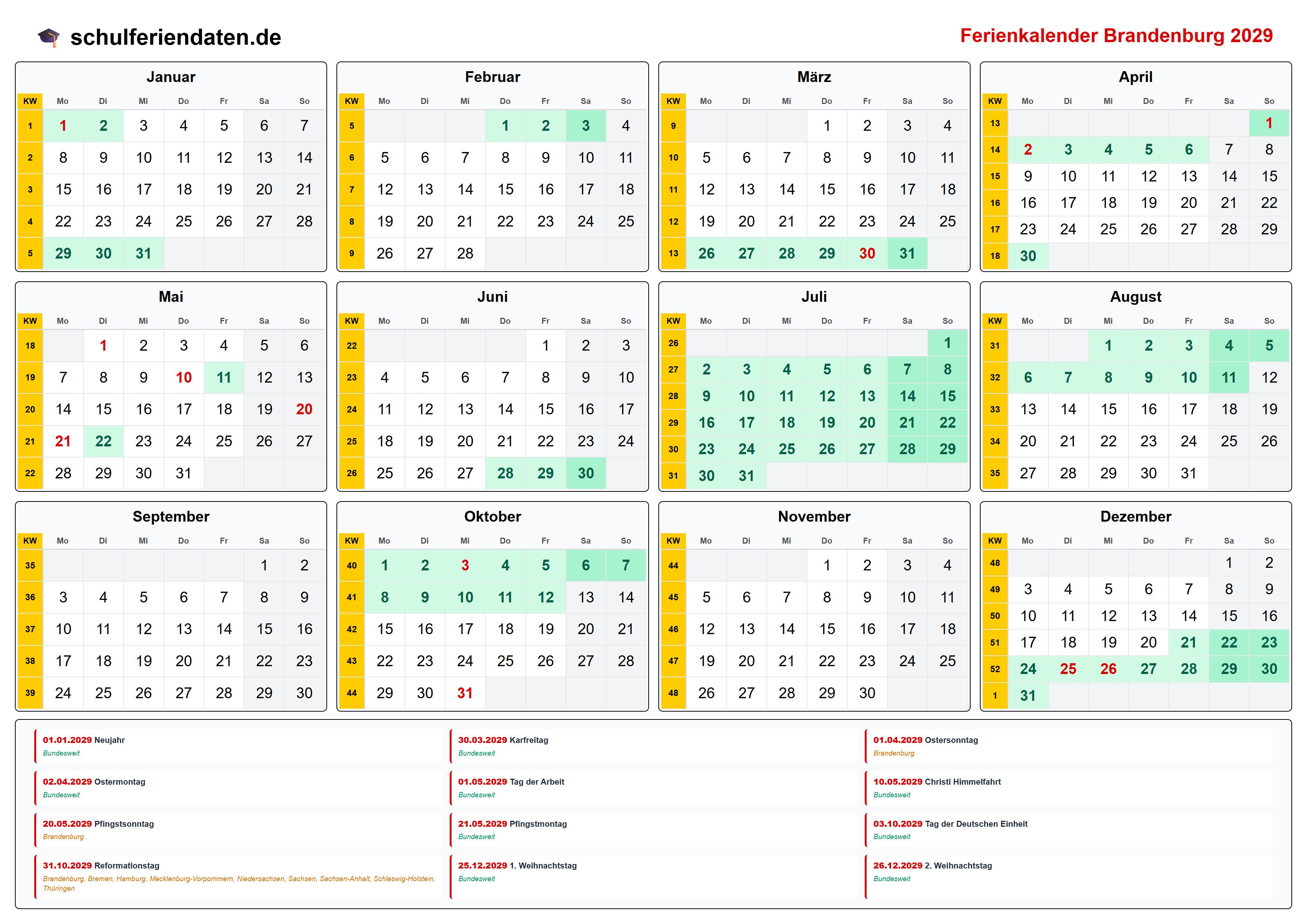 Hier finden Sie alle Schulferien 2029 in Brandenburg – übersichtlich im Kalender mit Kalenderwochen (KW) und markierten Feiertagen.