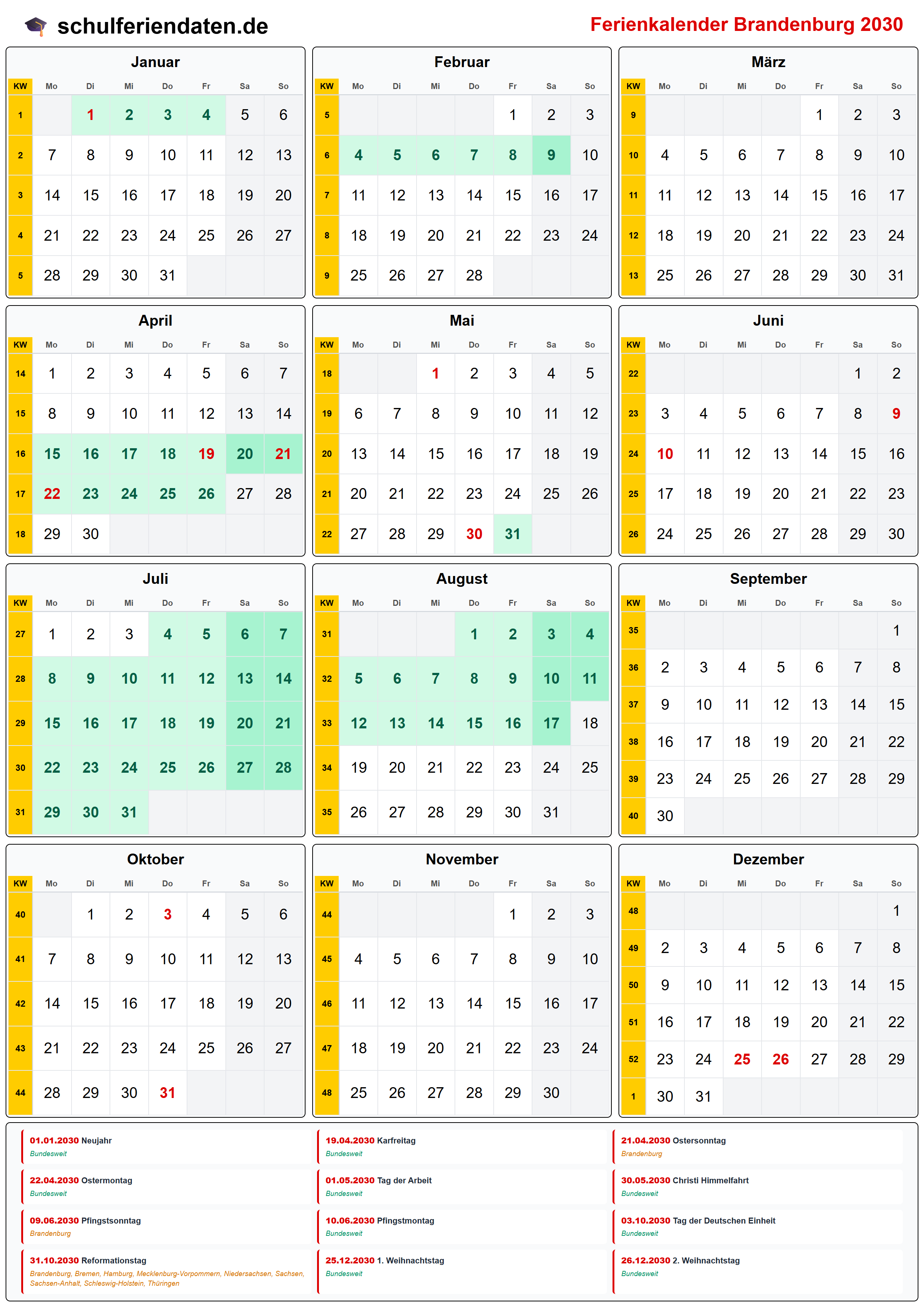 Ferienkalender für Brandenburg im Jahr 2030 mit allen Schulferien und gesetzlichen Feiertagen. Der Kalender zeigt alle Termine übersichtlich nach Monaten und Kalenderwochen und steht als PDF, PNG und iCal (.ics) zum Download bereit.