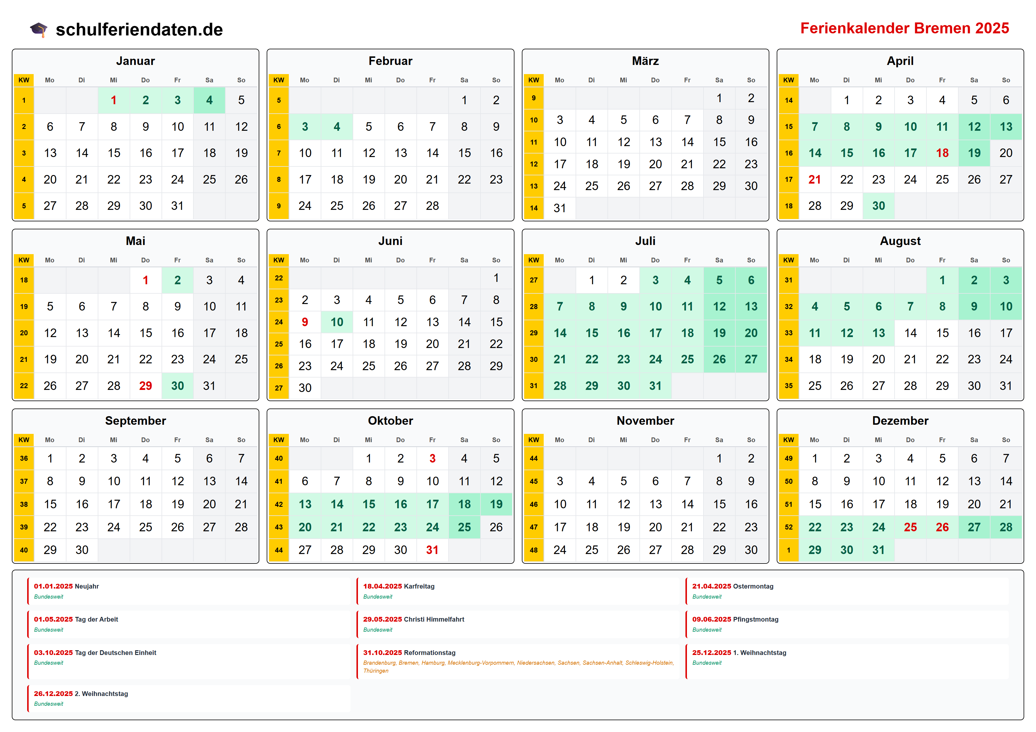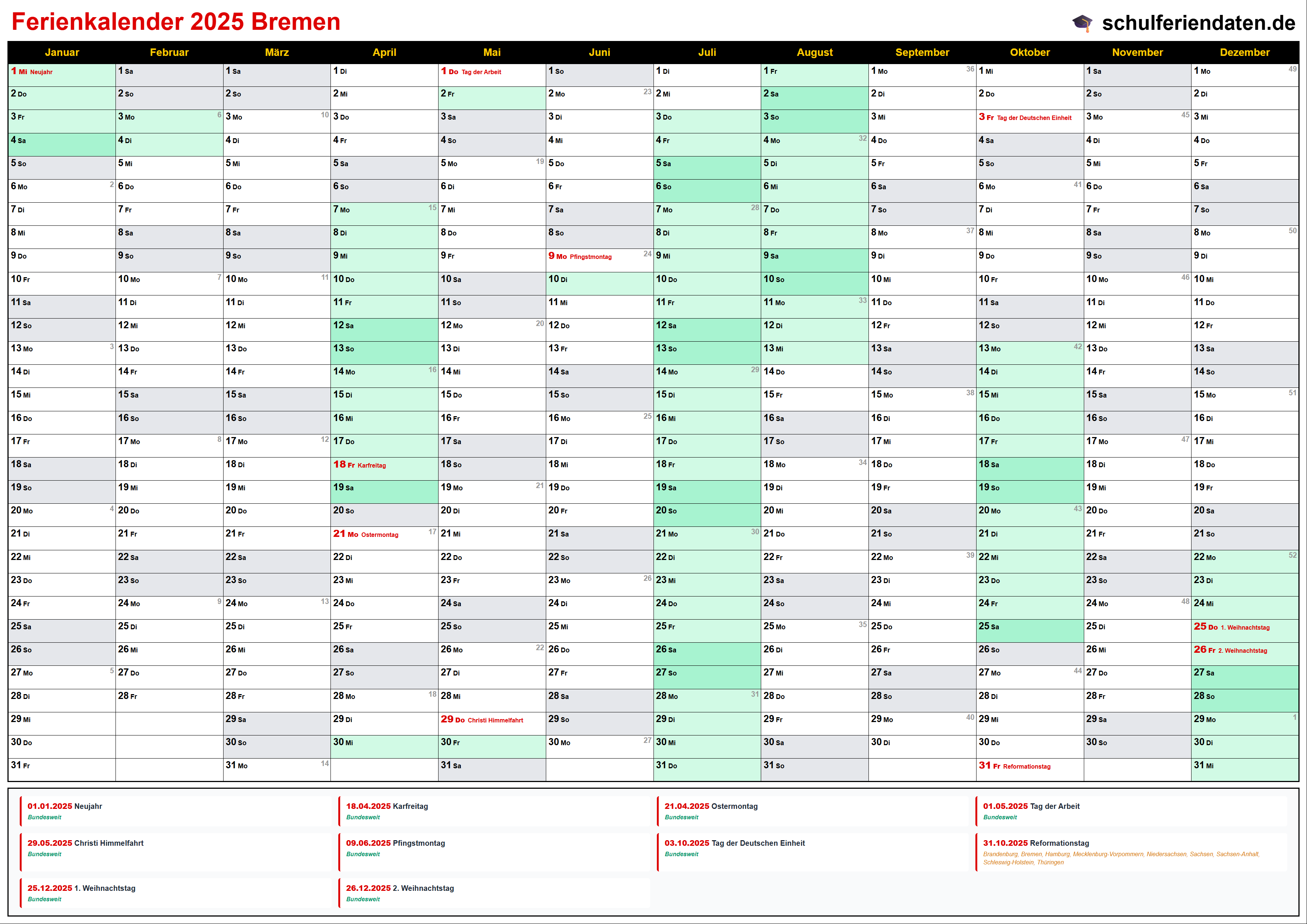 Ferienkalender für Bremen im Jahr 2025 mit allen Schulferien und gesetzlichen Feiertagen. Der Kalender zeigt alle Termine übersichtlich nach Monaten und Kalenderwochen und steht als PDF, PNG und iCal (.ics) zum Download bereit.
