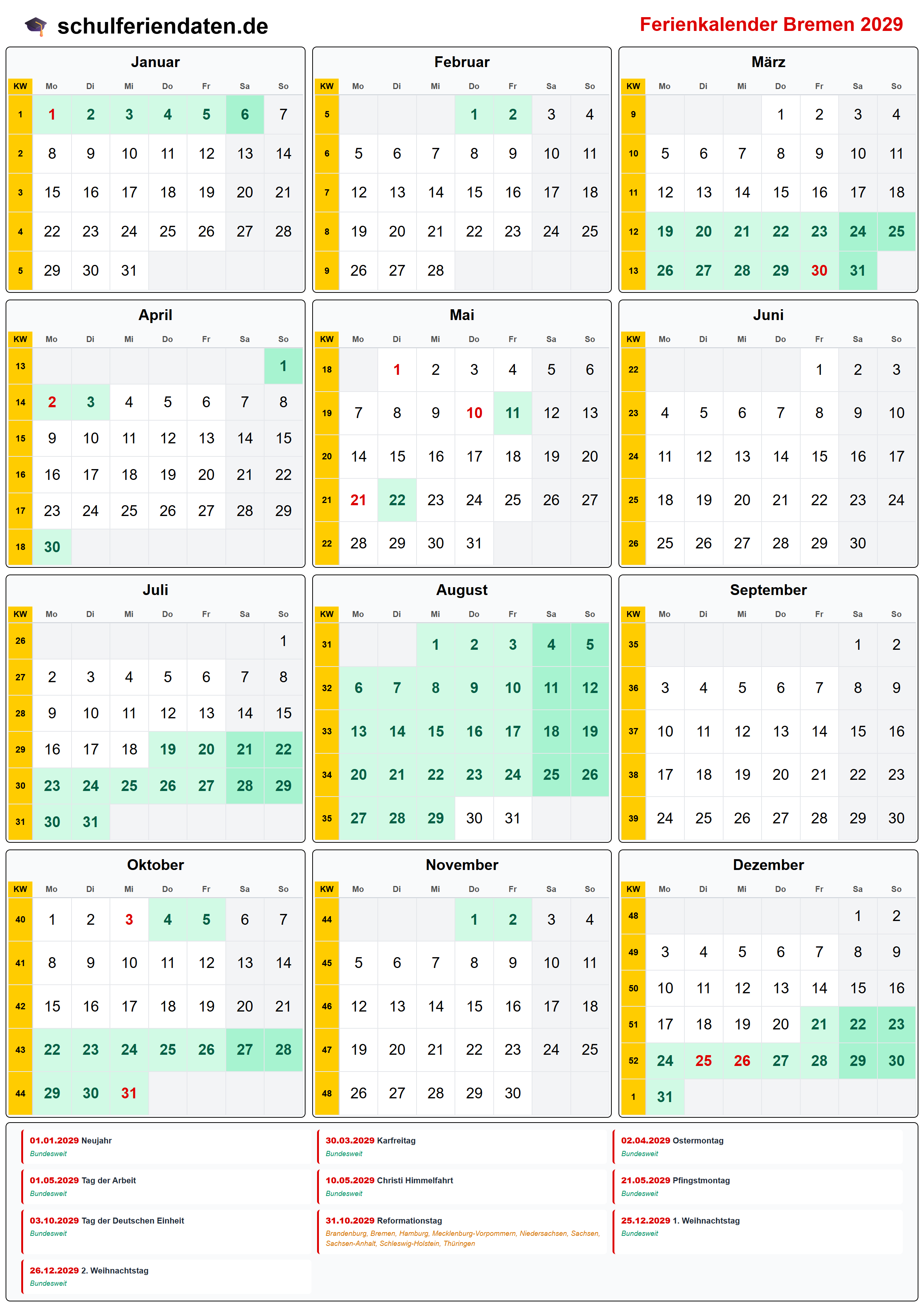Laden Sie unseren Kalender 2029 mit den Feiertagen für Bremen in den Formaten PDF oder PNG. Sie können die Kalender auch auf Ihrer Webseite einbinden oder in Ihrer Publikation abdrucken. In dem Fall muss schulferiendaten.de als Quelle angegeben bzw. verlinkt sein.