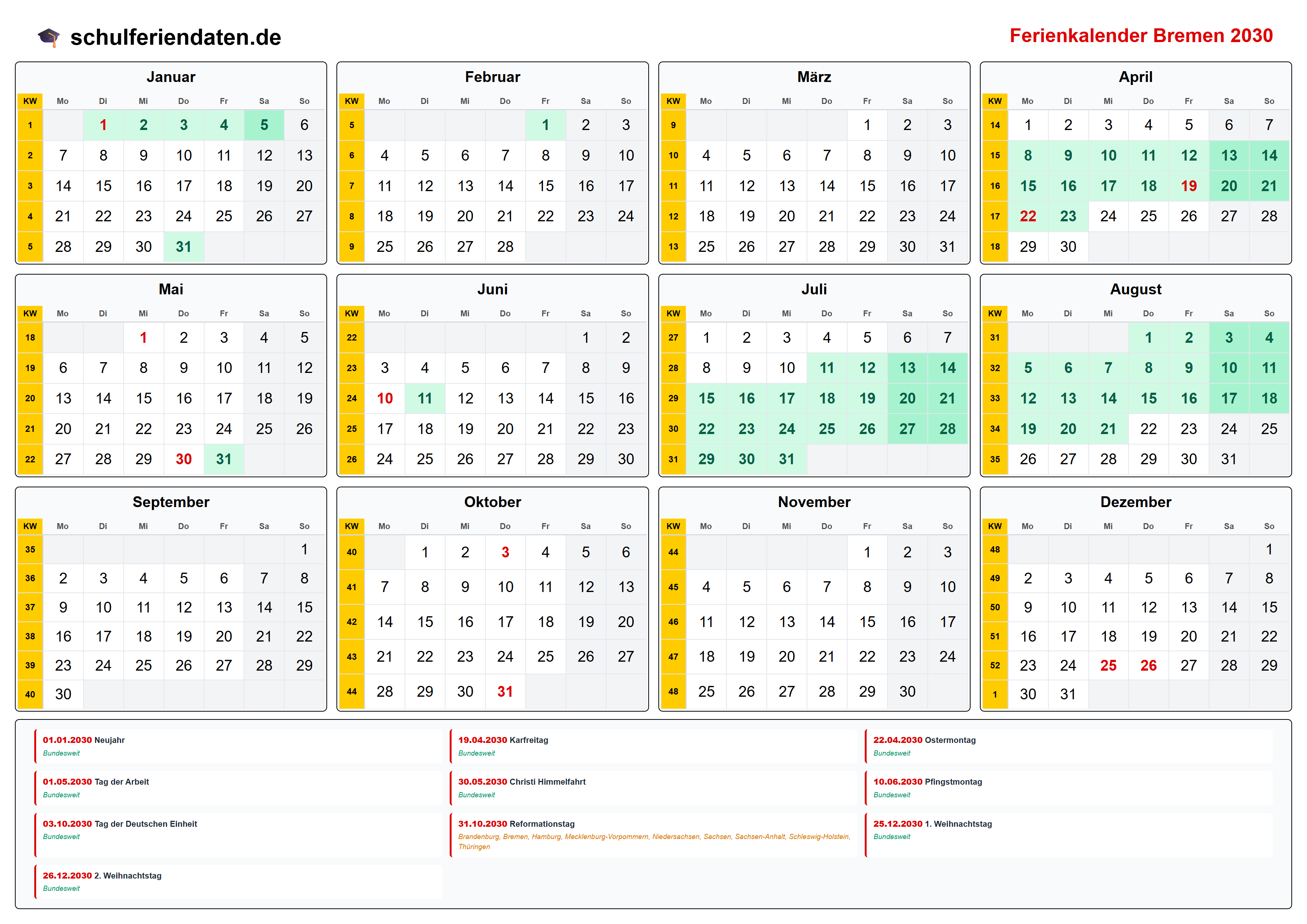Ferienkalender für Bremen im Jahr 2030 mit allen Schulferien und gesetzlichen Feiertagen. Der Kalender zeigt alle Termine übersichtlich nach Monaten und Kalenderwochen und steht als PDF, PNG und iCal (.ics) zum Download bereit.